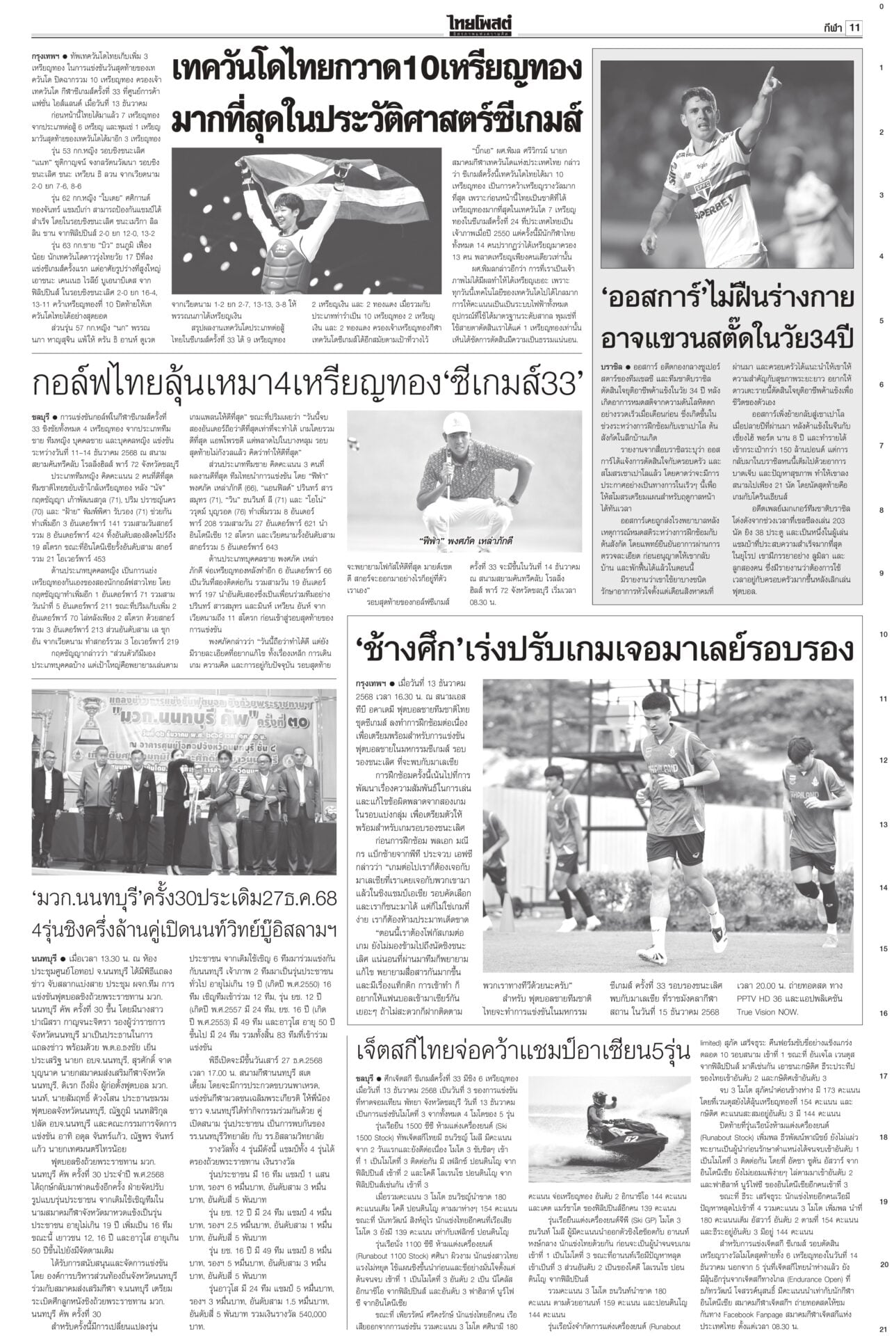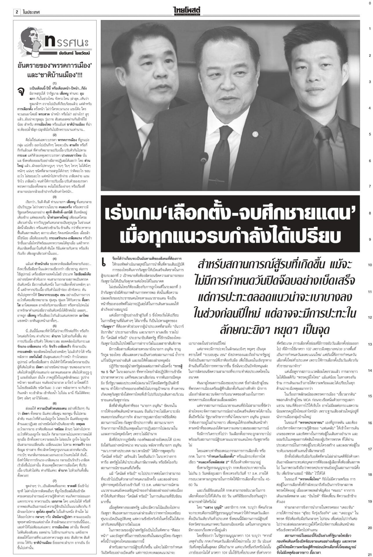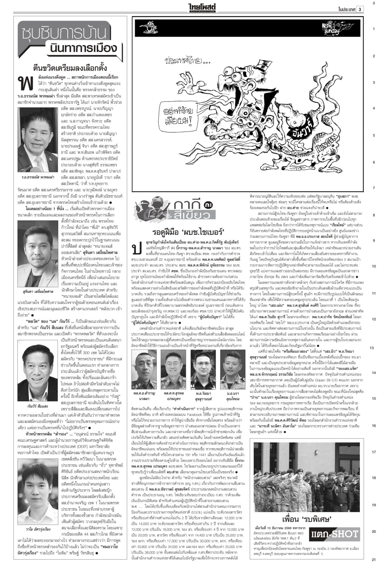 หนังสือพิมพ์ฉบับวันที่ 14 ธันวาคม 2568ข่าวหน้าหนึ่ง‘ในหลวง-ราชินี’ ‘ปัญญาสมวาร’“ในหลวง-พระราชินี” ทรงบำเพ็ญพระราชกุศลปัญญาสมวาร (50 วัน) “สมเด็จพระพันปีหลวง” ขณะที่พสกนิกรจากทุกสารทิศต่างพร้อมใจกันแต่งกายด้วยชุดสุภาพสีดำไว้ทุกข์ ไทยต้องฟังใครไหม ‘อนุทิน’กร้าว! ‘ทรัมป์’ มั่วเหยียบกับระเบิดเป็นอุบัติเหต“ประธานาธิบดีสหรัฐ” ยกหูคุยผู้นำ “ไทย-เขมร” แล้ว พอวางสายพูดไปคนละทาง “ทรัมป์” แสบมาก! โพสต์ในโซเชียลอ้างทหารไทยเหยียบกับระเบิดเป็นอุบัติเหตุ วีรบุรุษ‘พลีชีพ’อีก4นายทหารกล้า วีรบุรุษของไทย พลีชีพเพื่อชาติเพิ่มอีก 4 นาย กองทัพภาคที่ 2 เผยยึดฐานทหารเขมรพื้นที่ซำแต-เนิน 677 พบโทรศัพท์ 8 เครื่อง สมุดบันทึกปฏิบัติงานทหารกัมพูชา 1 พรรคส้มคึกคัก ถ่ายเลือดใหม่! รับเลือกตั้ง’69พรรคส้มถ่ายเลือดครั้งใหญ่ หน้าเก่าโบกมือลา-ไม่ผ่านการคัดเลือก สาย 112 ขอพักก่อน ขณะที่นักวิชาการส้ม “อนุสรณ์ ธรรมใจ” เตรียมสมัครเป็น สส.เขตตลิ่งชัน-ทวีวัฒนา “ธนาธร”