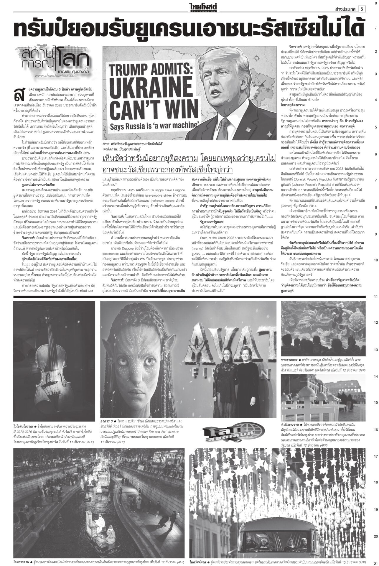 ฉบับวันที่ 14 ธันวาคม 2568 14 ธันวาคม 2568 เวลา 0:01 น. หนังสือพิมพ์ฉบับวันที่ 14 ธันวาคม 2568ข่าวหน้าหนึ่ง‘ในหลวง-ราชินี’ ‘ปัญญาสมวาร’“ในหลวง-พระราชินี” ทรงบำเพ็ญพระราชกุศลปัญญาสมวาร (50 วัน) “สมเด็จพระพันปีหลวง” ขณะที่พสกนิกรจากทุกสารทิศต่างพร้อมใจกันแต่งกายด้วยชุดสุภาพสีดำไว้ทุกข์ ไทยต้องฟังใครไหม ‘อนุทิน’กร้าว! ‘ทรัมป์’ มั่วเหยียบกับระเบิดเป็นอุบัติเหต“ประธานาธิบดีสหรัฐ” ยกหูคุยผู้นำ “ไทย-เขมร” แล้ว พอวางสายพูดไปคนละทาง “ทรัมป์” แสบมาก! โพสต์ในโซเชียลอ้างทหารไทยเหยียบกับระเบิดเป็นอุบัติเหตุ วีรบุรุษ‘พลีชีพ’อีก4นายทหารกล้า วีรบุรุษของไทย พลีชีพเพื่อชาติเพิ่มอีก 4 นาย กองทัพภาคที่ 2 เผยยึดฐานทหารเขมรพื้นที่ซำแต-เนิน 677 พบโทรศัพท์ 8 เครื่อง สมุดบันทึกปฏิบัติงานทหารกัมพูชา 1 พรรคส้มคึกคัก ถ่ายเลือดใหม่! รับเลือกตั้ง’69พรรคส้มถ่ายเลือดครั้งใหญ่ หน้าเก่าโบกมือลา-ไม่ผ่านการคัดเลือก สาย 112 ขอพักก่อน ขณะที่นักวิชาการส้ม “อนุสรณ์ ธรรมใจ” เตรียมสมัครเป็น สส.เขตตลิ่งชัน-ทวีวัฒนา “ธนาธร” Tagsรายวันหนังสือพิมพ์ ข่าวที่เกี่ยวข้อง ฉบับวันที่ 13 ธันวาคม 2568 ฉบับวันที่ 12 ธันวาคม 2568 ฉบับวันที่ 11 ธันวาคม 2568 ฉบับวันที่ 10 ธันวาคม 2568 ฉบับวันที่ 9 ธันวาคม 2568 ฉบับวันที่ 8 ธันวาคม 2568 NEWS UPDATE 1:44 น. 3หนุ่ม VOC 'วิคเตอร์–อองรี–โชกุน' แท็กทีมโชว์ Busking แบบใกล้ชิด! 0:30 น. ชวนทำบุญ อิ่มใจ ร้านกาชาด กฟผ. จัดเต็มสอยดาวฉลากเบอร์ 5 ชมนิทรรศการแสงแห่งพระเมตตา สถิตย์ในใจประชานิจนิรันดร์ รำลึก’พระพันปีหลวง’ 0:01 น. เร่งเกม'เลือกตั้ง-จบศึกชายแดน' เมื่อทุกแนวรบกำลังได้เปรียบ 23:09 น. 'ฟิกเกอร์ฯ'สร้างประวัติศาสตร์ คว้า1เหรียญทอง1เงิน1ทองแดง 'ฟิกเกอร์สเก็ต'ซีเกมส์2025 22:38 น. สอยคิวไทยเชือดนิ่มลาว 3-1 เฟรม คว้าทองสนุกเกอร์ 15 แดง ทีมชาย ศึกซีเกมส์