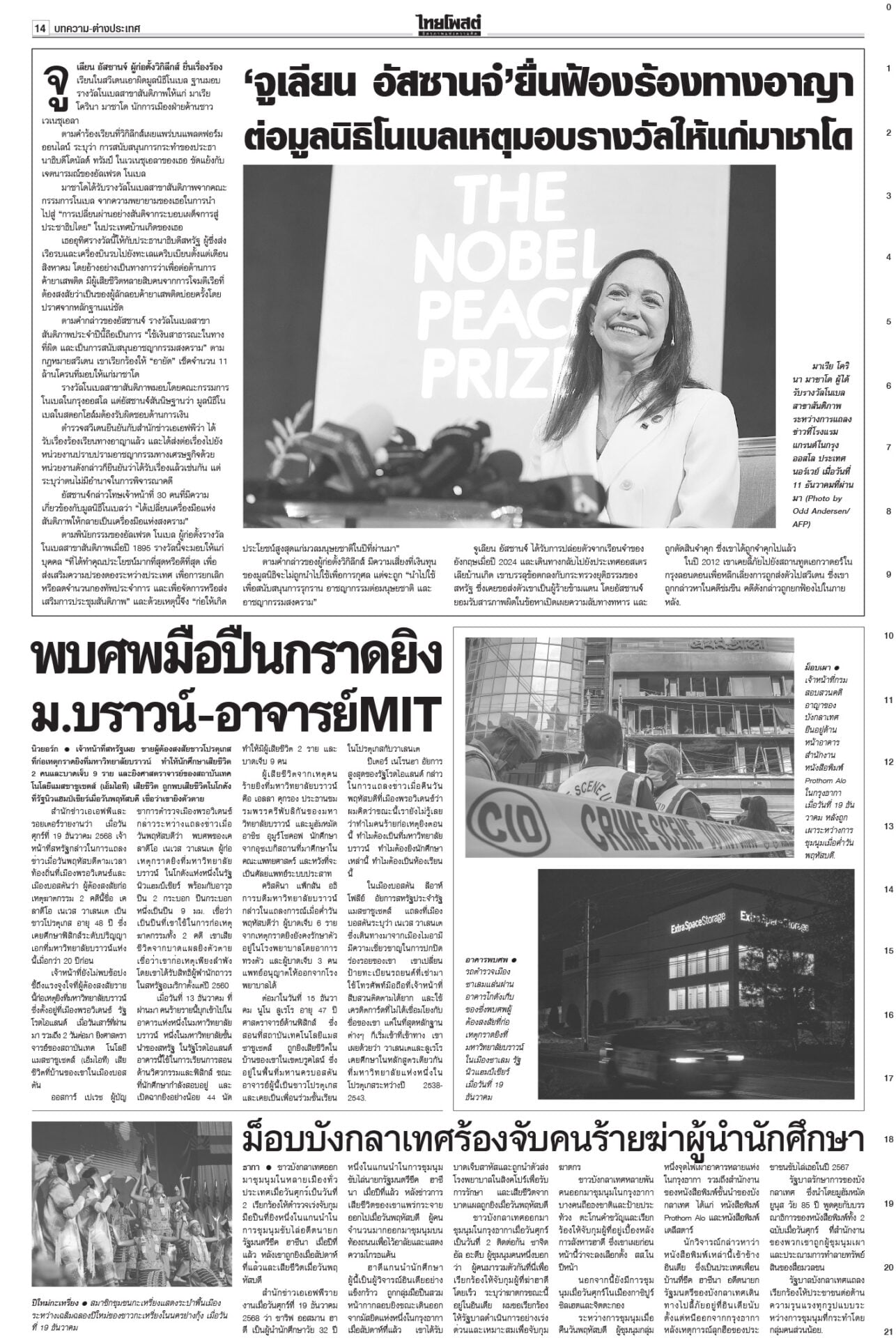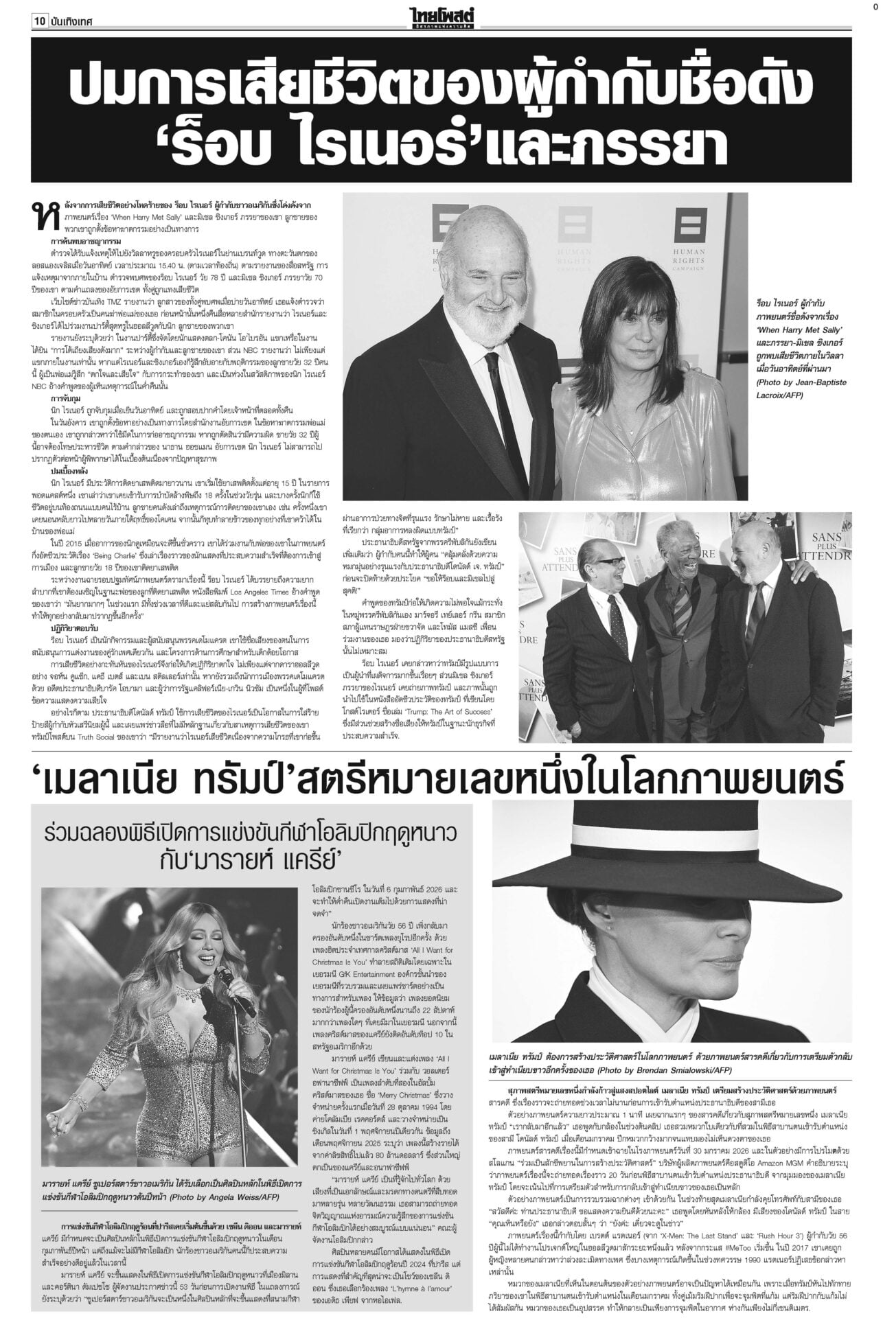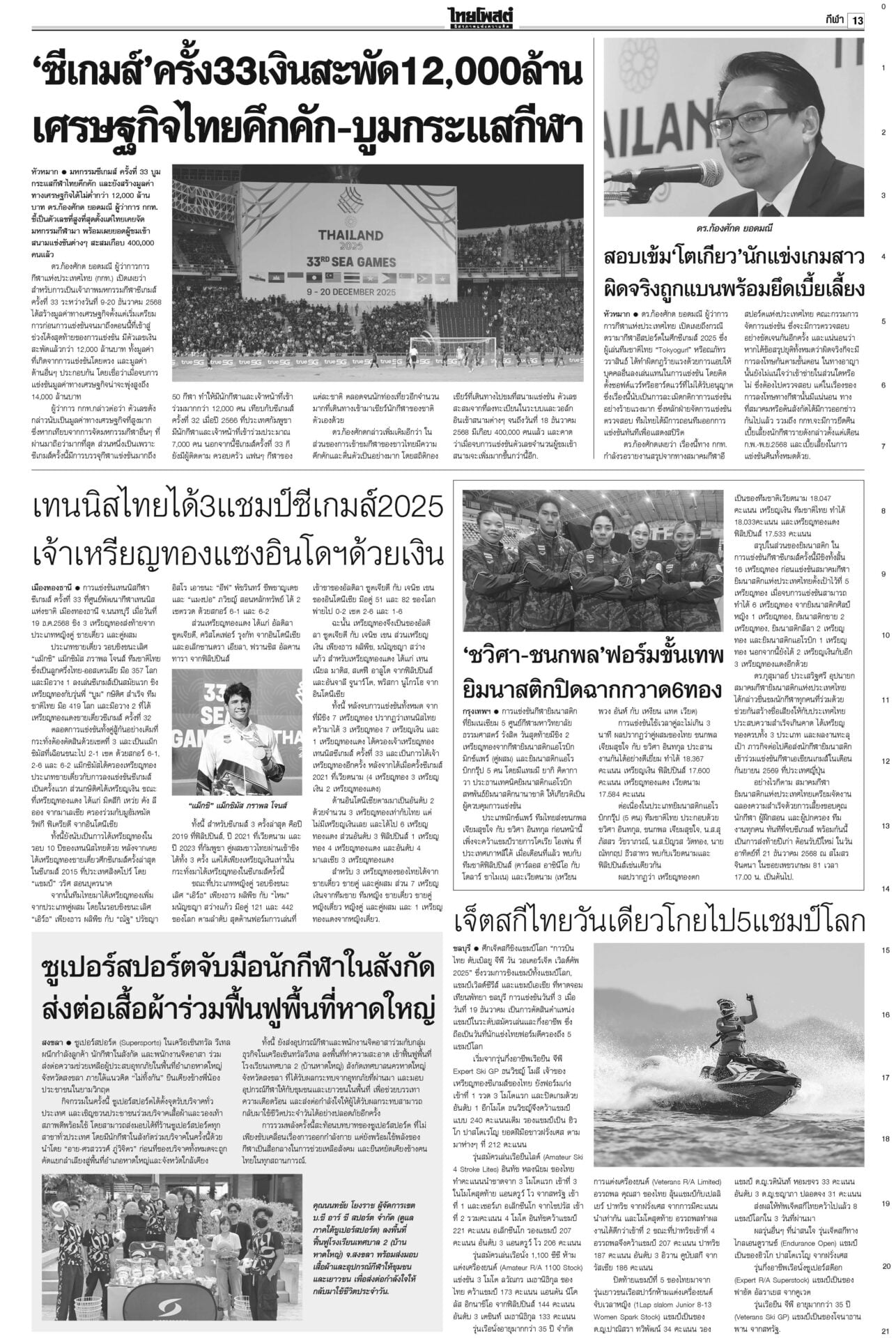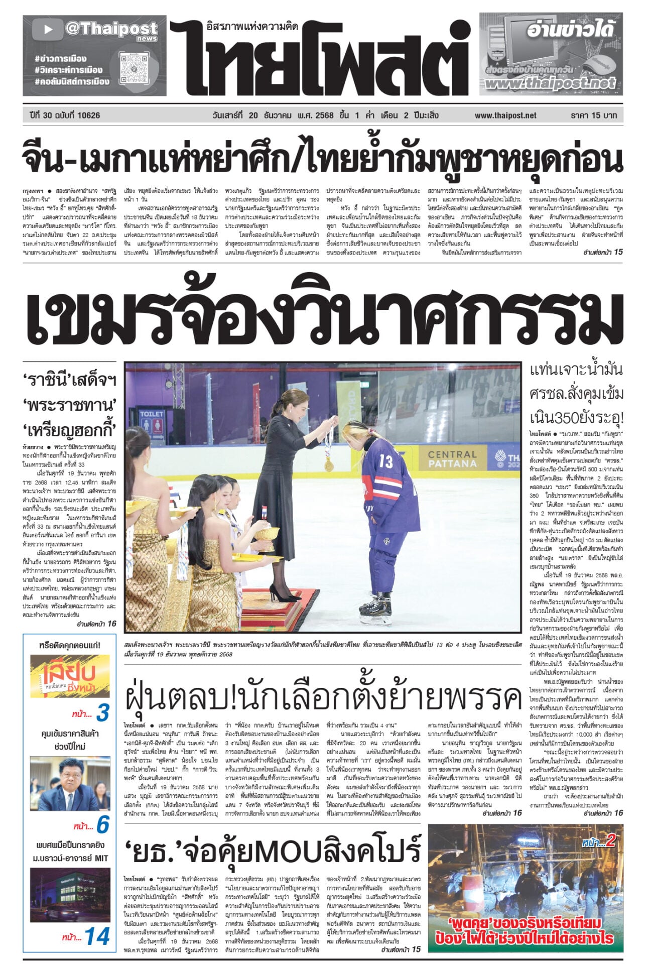หนังสือพิมพ์ ฉบับวันที่ 20 ธันวาคม 2568ข่าวหน้าหนึ่งเขมรจ้องวินาศกรรม แท่นเจาะน้ำมัน ศรชล.สั่งคุมเข้ม เนิน350ยังระอุ!“รมว.กห.” ยอมรับ “กัมพูชา” อาจมีความพยายามก่อวินาศกรรมแท่นขุดเจาะน้ำมัน จีน-เมกาแห่หย่าศึก/ไทยยํ้ากัมพูชาหยุดก่อนสองชาติมหาอำนาจ “สหรัฐอเมริกา-จีน” ช่วงชิงเป็นตัวกลางหย่าศึกไทย-เขมร ‘ราชินี’เสด็จฯ ‘พระราชทาน’ ‘เหรียญฮอกกี้’พระราชินีพระราชทานเหรียญทองนักกีฬาฮอกกี้น้ำแข็งหญิงทีมชาติไทย ในมหกรรมซีเกมส์ ครั้งที่ 33 ‘ยธ.’จ่อคุ้ยMOUสิงคโปร์“รุทธพล” รับกำลังตรวจผลการลงนามเอ็มโอยูสแกนม่านตากับสิงคโปร์ ฝุ่นตลบ!นักเลือกตั้งย้ายพรรคเลขาฯ กกต.รับเลือกตั้งหนนี้เหนื่อยแน่นอน “อนุทิน” การันตี ถ้าชนะ “เอกนิติ-ศุภจี-สีหศักดิ์” เ