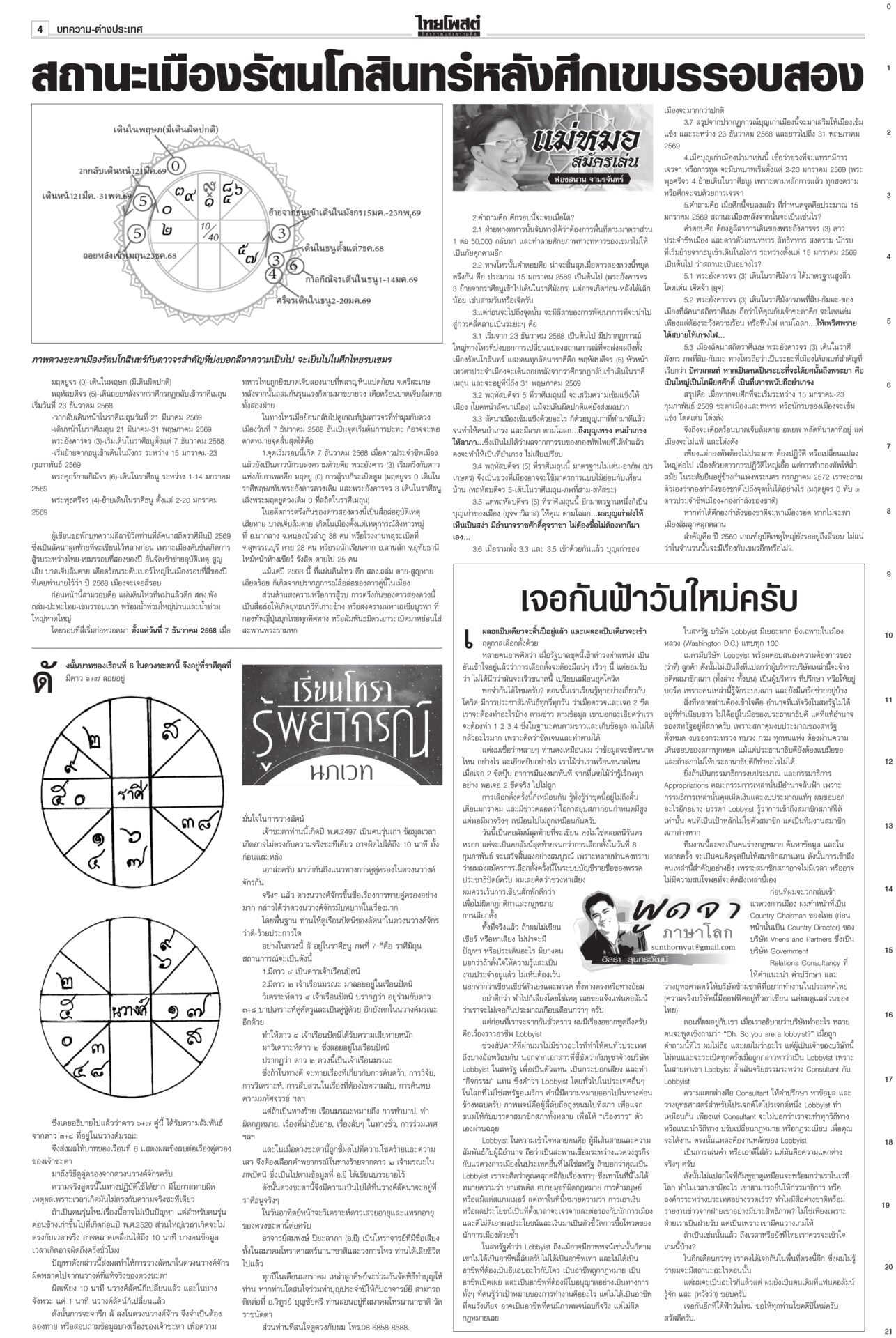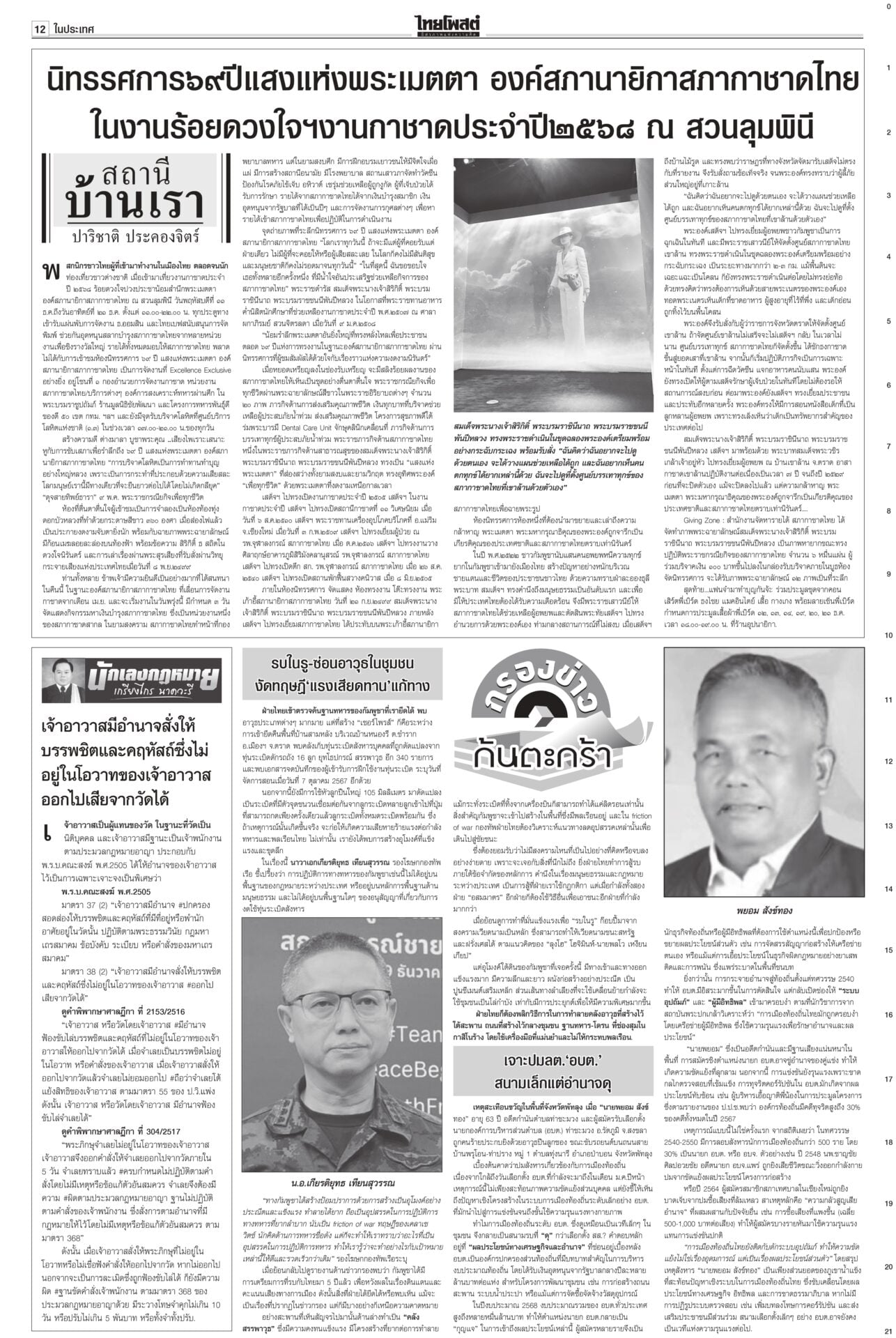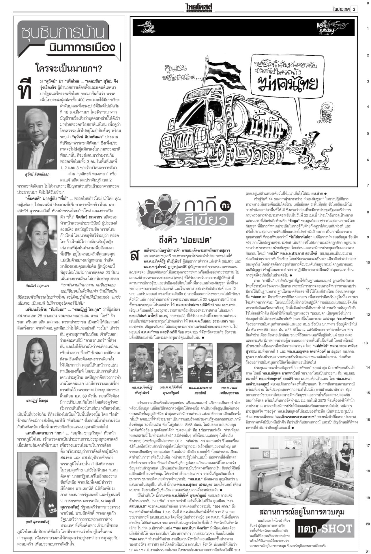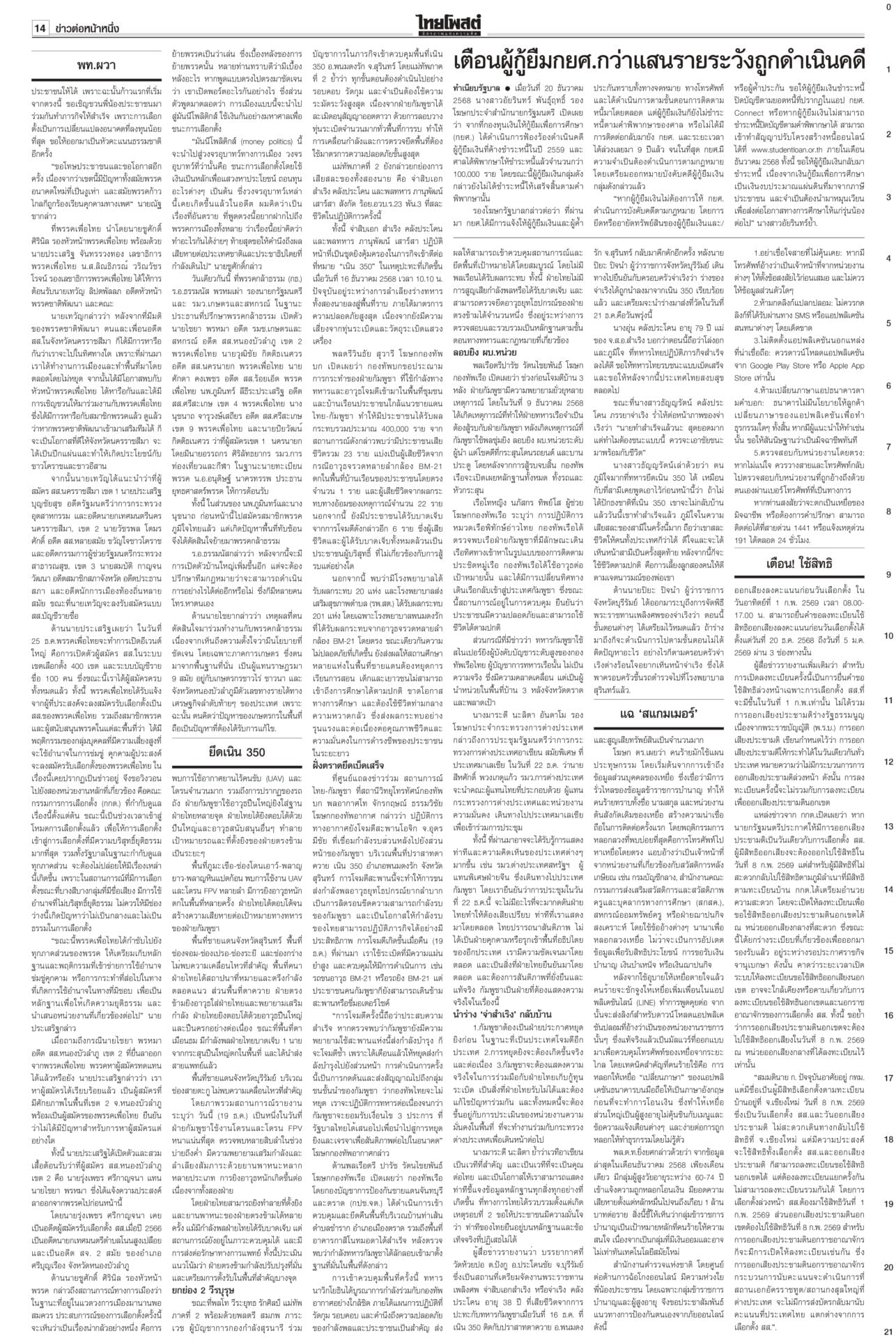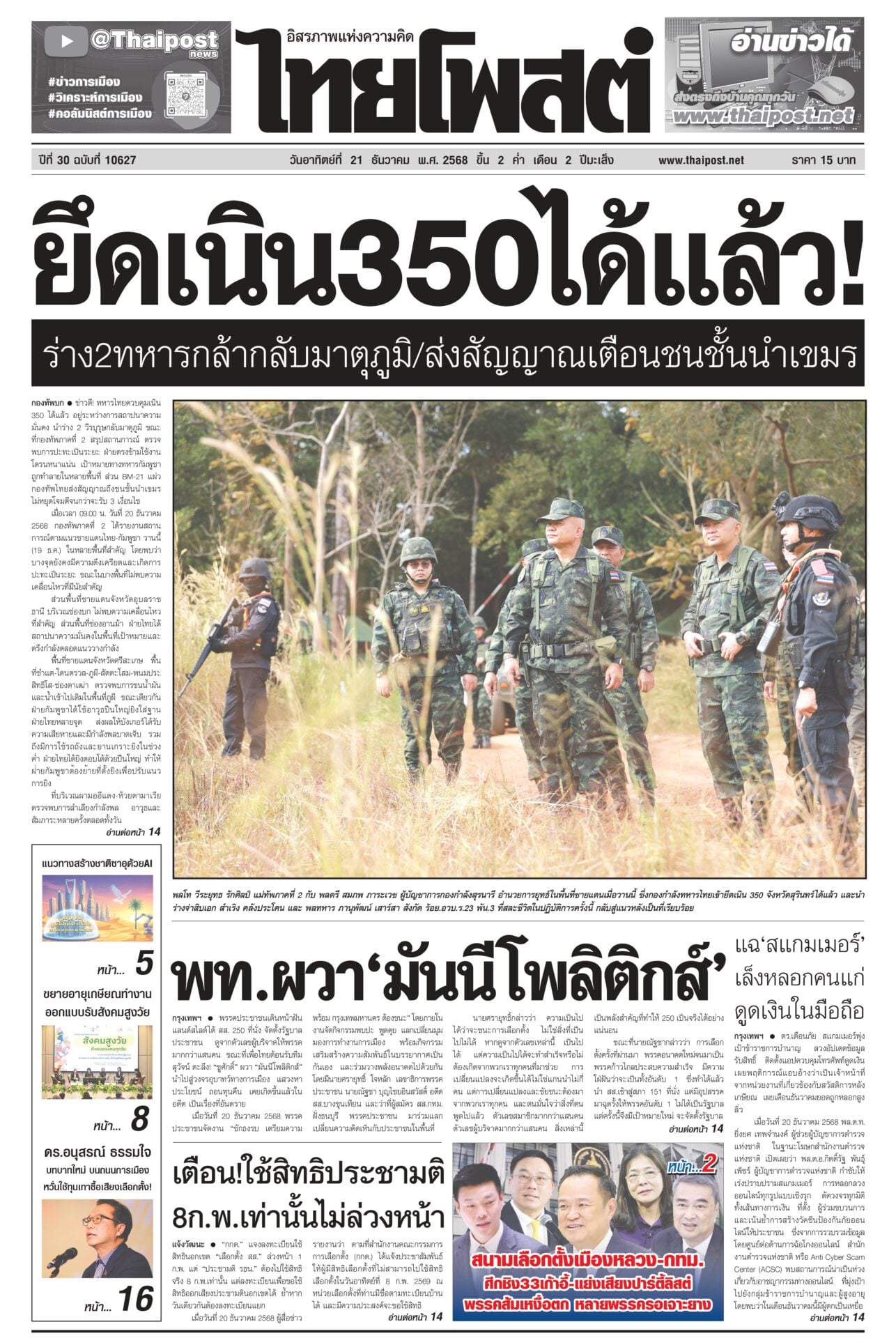 หนังสือพิมพ์ฉบับวันที่ 21 ธันวาคม 2568ข่าวหน้าหนึ่งยึดเนิน350ได้แล้ว! ร่าง2ทหารกล้ากลับมาตุภูมิ/ส่งสัญญาณเตือนชนชั้นนำเขมรข่าวดี! ทหารไทยควบคุมเนิน 350 ได้แล้ว อยู่ระหว่างการสถาปนาความมั่นคง นำร่าง 2 วีรบุรุษกลับมาตุภูมิ ขณะที่กองทัพภาคที่ 2 สรุปสถานการณ์ ตรวจพบการปะทะเป็นระยะ แฉ‘สแกมเมอร์’ เล็งหลอกคนแก่ ดูดเงินในมือถือตร.เตือนภัย สแกมเมอร์พุ่งเป้าข้าราชการบำนาญ ลวงอัปเดตข้อมูล รับสิทธิ์ ติดตั้งแอปควบคุมโทรศัพท์ดูดเงิน เตือน!ใช้สิทธิประชามติ 8ก.พ.เท่านั้นไม่ล่วงหน้า“กกต.” แจงลงทะเบียนใช้สิทธินอกเขต “เลือกตั้ง สส.” ล่วงหน้า 1 ก.พ. แต่ “ประชามติ รธน.”