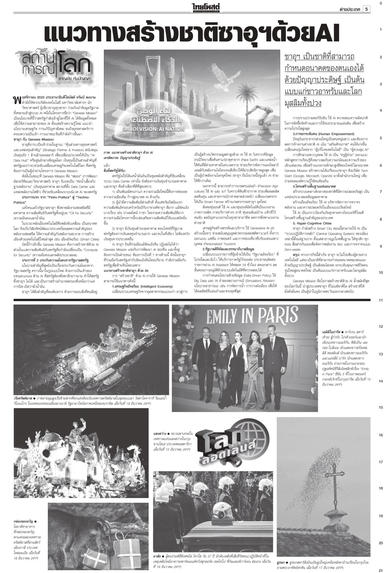 ฉบับวันที่ 21 ธันวาคม 2568 21 ธันวาคม 2568 เวลา 0:01 น. หนังสือพิมพ์ฉบับวันที่ 21 ธันวาคม 2568ข่าวหน้าหนึ่งยึดเนิน350ได้แล้ว! ร่าง2ทหารกล้ากลับมาตุภูมิ/ส่งสัญญาณเตือนชนชั้นนำเขมรข่าวดี! ทหารไทยควบคุมเนิน 350 ได้แล้ว อยู่ระหว่างการสถาปนาความมั่นคง นำร่าง 2 วีรบุรุษกลับมาตุภูมิ ขณะที่กองทัพภาคที่ 2 สรุปสถานการณ์ ตรวจพบการปะทะเป็นระยะ แฉ‘สแกมเมอร์’ เล็งหลอกคนแก่ ดูดเงินในมือถือตร.เตือนภัย สแกมเมอร์พุ่งเป้าข้าราชการบำนาญ ลวงอัปเดตข้อมูล รับสิทธิ์ ติดตั้งแอปควบคุมโทรศัพท์ดูดเงิน เตือน!ใช้สิทธิประชามติ 8ก.พ.เท่านั้นไม่ล่วงหน้า“กกต.” แจงลงทะเบียนใช้สิทธินอกเขต “เลือกตั้ง สส.” ล่วงหน้า 1 ก.พ. แต่ “ประชามติ รธน.” Tagsรายวันหนังสือพิมพ์ ข่าวที่เกี่ยวข้อง ฉบับวันที่ 20 ธันวาคม 2568 ฉบับวันที่ 19 ธันวาคม 2568 ฉบับวันที่ 18 ธันวาคม 2568 ฉบับวันที่ 17 ธันวาคม 2568 ฉบับวันที่ 16 ธันวาคม 2568 ฉบับวันที่ 15 ธันวาคม 2568 NEWS UPDATE 0:01 น. สนามเลือกตั้งเมืองหลวง-กทม. ศึกชิง33เก้าอี้-แย่งเสียงปาร์ตี้ลิสต์ พรรคส้มเหงื่อตก หลายพรรครอเจาะยาง 21:42 น. ปิดฉากซีเกมส์ ครั้งที่ 33 อย่างสมบูรณ์ ส่งไม้ต่อมาเลเซีย ปี 2027 20:05 น. คืนอธิปไตยสู่มาตุภูมิ! 'แม่ทัพกุ้ง' ผู้แทน ผบ.ทบ. ตรวจแนวรบปราสาทตาควาย-เนิน 350 19:49 น. นายกฯอนุทิน เดินชมงานโอทอป วันแรก ก่อนเป็นประธานพิธีเปิด 22 ธ.ค.นี้ 19:04 น. เปิดภาพ แม่ทัพภาค 2-ผบ.กกล.สุรนารี สั่งการร่วมภารกิจยึด 'เนิน 350'