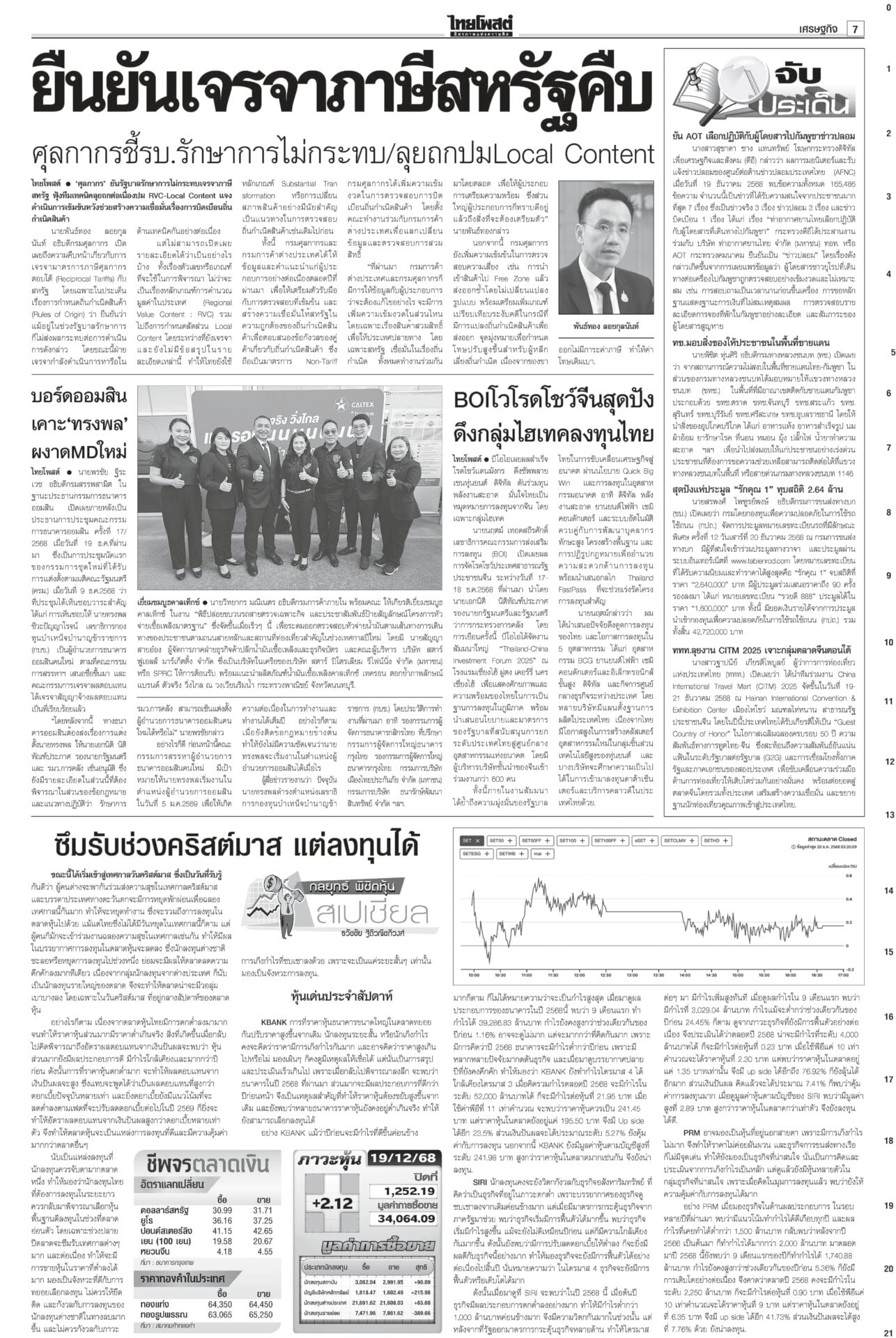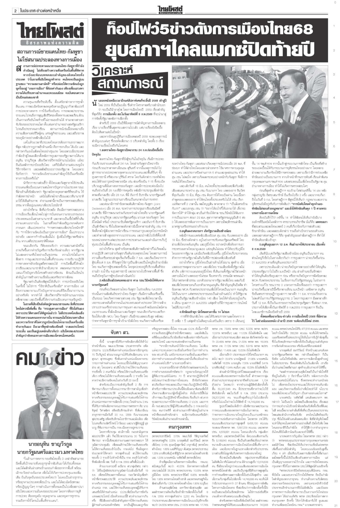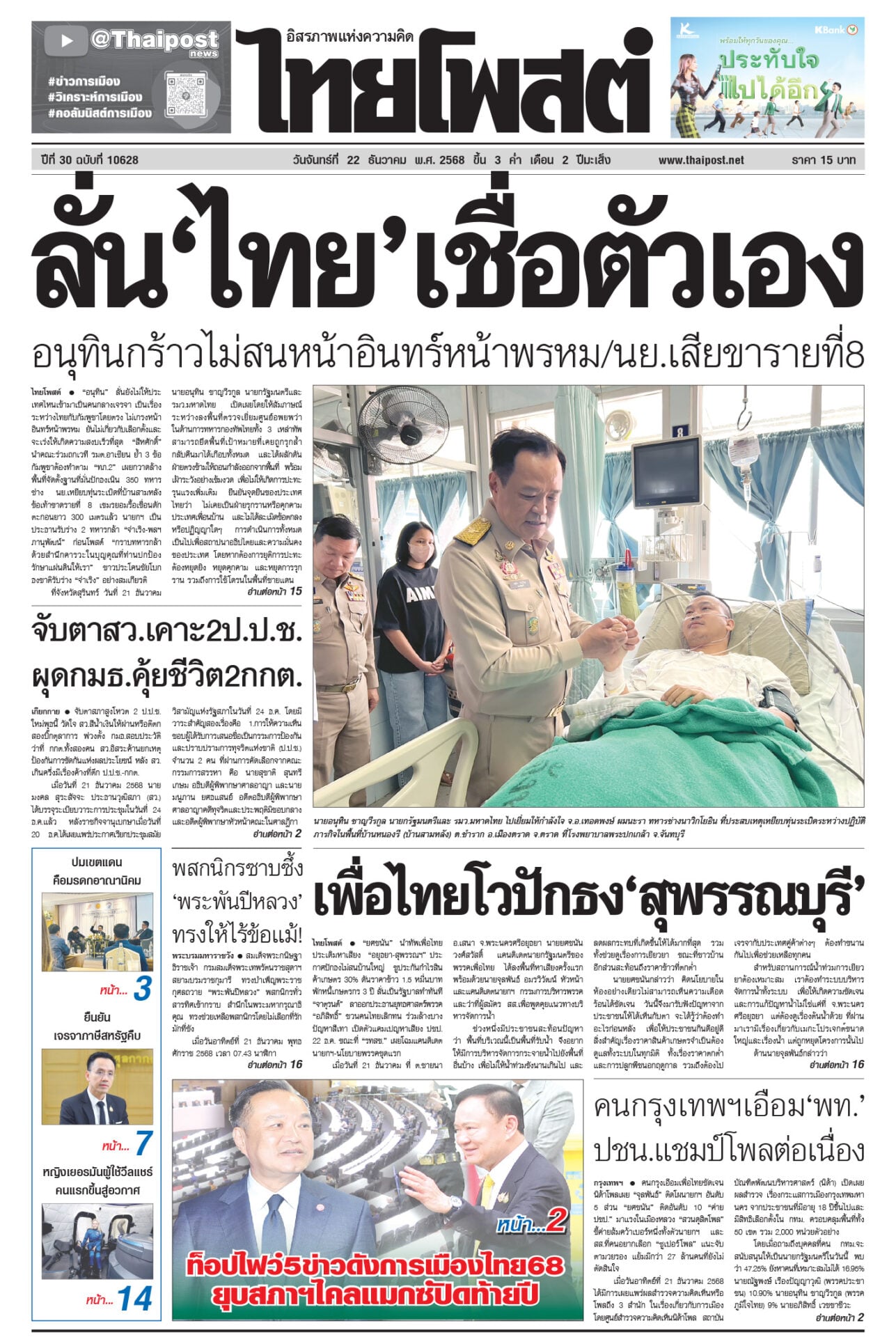 หนังสือพิมพ์ ฉบับวันที่ 22 ธันวาคม 2568ข่าวหน้าหนึ่งลั่น‘ไทย’เชื่อตัวเอง อนุทินกร้าวไม่สนหน้าอินทร์หน้าพรหม/นย.เสียขารายที่8“อนุทิน” ลั่นยังไม่ให้ประเทศไหนเข้ามาเป็นคนกลางเจรจา เป็นเรื่องระหว่างไทยกับกัมพูชาโดยตรง ไม่เกรงหน้าอินทร์หน้าพรหม เพื่อไทยโวปักธง‘สุพรรณบุรี’“ยศชนัน” นำทัพเพื่อไทยประเดิมหาเสียง “อยุธยา-สุพรรณฯ” ประกาศปักธงไม่สนบ้านใหญ่ คนกรุงเทพฯเอือม‘พท.’ ปชน.แชมป์โพลต่อเนื่องคนกรุงเอือมเพื่อไทยชัดเจน นิด้าโพลเผย “จุลพันธ์” ติดโผนายกฯ อันดับ 5 จับตาสว.เคาะ2ป.ป.ช. ผุดกมธ.คุ้ยชีวิต2กกต.จับตาสภาสูงโหวต 2 ป.ป.ช.ใหม่พุธนี้ วัดใจ สว.สีน้ำเงินให้ผ่านหรือตีตกสองบิ๊กตุลาการ พสกนิกรซาบซึ้ง ‘พระพันปีหลวง’ ทรงให้ไร้ข้อแม้!สมเด็จพระกนิษฐาธิราชเจ้า กรมสมเด็จพระเทพรัตนราชสุดาฯ สยามบรมราชกุมารี