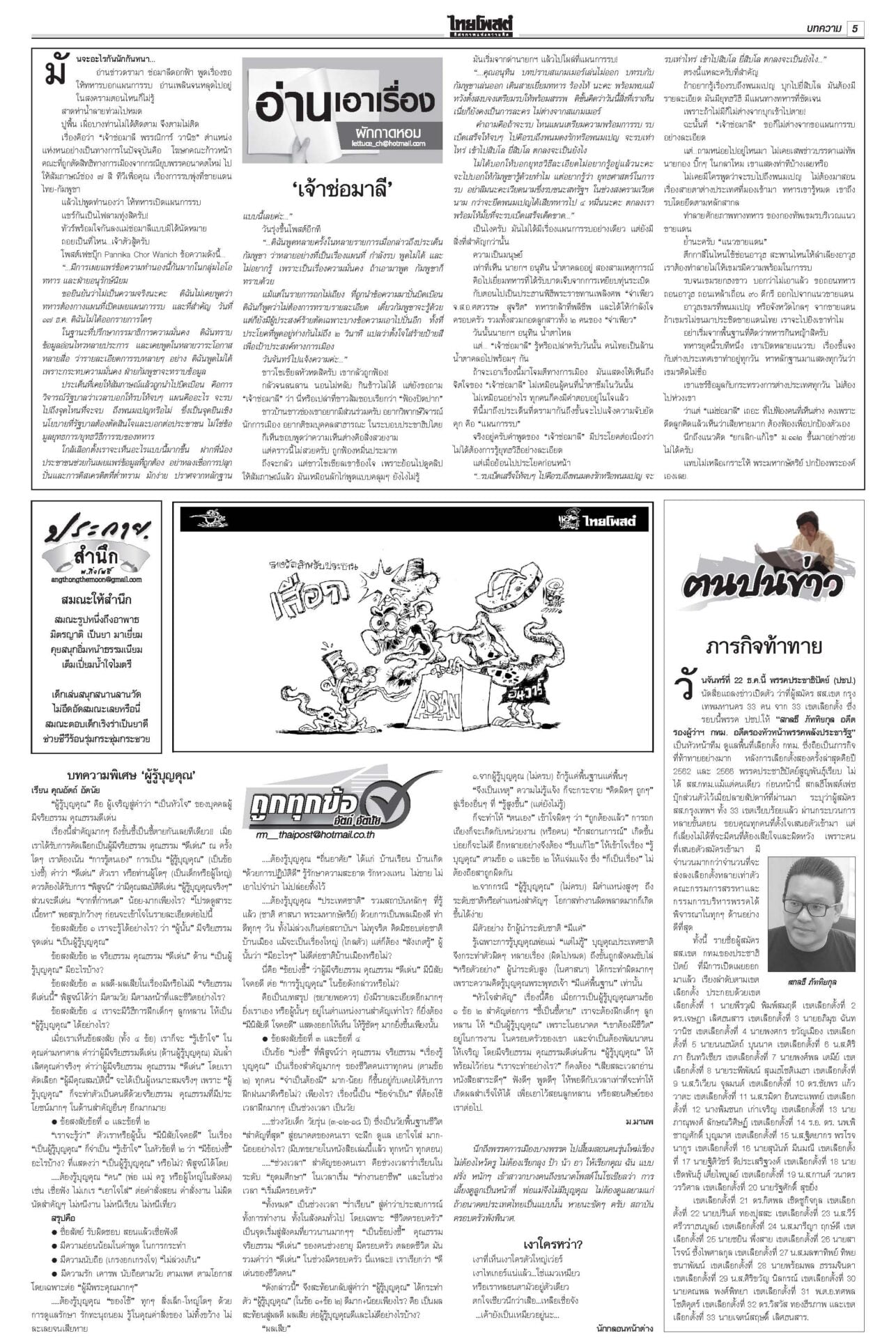 ฉบับวันที่ 22 ธันวาคม 2568 22 ธันวาคม 2568 เวลา 0:01 น. หนังสือพิมพ์ ฉบับวันที่ 22 ธันวาคม 2568ข่าวหน้าหนึ่งลั่น‘ไทย’เชื่อตัวเอง อนุทินกร้าวไม่สนหน้าอินทร์หน้าพรหม/นย.เสียขารายที่8“อนุทิน” ลั่นยังไม่ให้ประเทศไหนเข้ามาเป็นคนกลางเจรจา เป็นเรื่องระหว่างไทยกับกัมพูชาโดยตรง ไม่เกรงหน้าอินทร์หน้าพรหม เพื่อไทยโวปักธง‘สุพรรณบุรี’“ยศชนัน” นำทัพเพื่อไทยประเดิมหาเสียง “อยุธยา-สุพรรณฯ” ประกาศปักธงไม่สนบ้านใหญ่ คนกรุงเทพฯเอือม‘พท.’ ปชน.แชมป์โพลต่อเนื่องคนกรุงเอือมเพื่อไทยชัดเจน นิด้าโพลเผย “จุลพันธ์” ติดโผนายกฯ อันดับ 5 จับตาสว.เคาะ2ป.ป.ช. ผุดกมธ.คุ้ยชีวิต2กกต.จับตาสภาสูงโหวต 2 ป.ป.ช.ใหม่พุธนี้ วัดใจ สว.สีน้ำเงินให้ผ่านหรือตีตกสองบิ๊กตุลาการ พสกนิกรซาบซึ้ง ‘พระพันปีหลวง’ ทรงให้ไร้ข้อแม้!สมเด็จพระกนิษฐาธิราชเจ้า กรมสมเด็จพระเทพรัตนราชสุดาฯ สยามบรมราชกุมารี Tagsรายวันหนังสือพิมพ์ ข่าวที่เกี่ยวข้อง ฉบับวันที่ 21 ธันวาคม 2568 ฉบับวันที่ 21 ธันวาคม 2568 ฉบับวันที่ 20 ธันวาคม 2568 ฉบับวันที่ 19 ธันวาคม 2568 ฉบับวันที่ 18 ธันวาคม 2568 ฉบับวันที่ 17 ธันวาคม 2568 ฉบับวันที่ 16 ธันวาคม 2568 NEWS UPDATE 0:01 น. ท็อปไฟว์5ข่าวดังการเมืองไทย68 ยุบสภาฯไคลแมกซ์ปิดท้ายปี 21:12 น. พยากรณ์อากาศ 24 ชม.ข้างหน้า เหนือ-อีสาน อากาศเย็น 'กทม.' ช่วงเช้าต่ำสุด 20 องศาฯ 21:00 น. เปิด 100 ชื่อ ปาร์ตี้ลิสต์พรรคเพื่อไทย 'ยศชนัน' นำทีมเอง 20:48 น. ส่องบิ๊กเนมปาร์ตี้ลิสต์ 'ภูมิใจไทย' บ้านใหญ่พรึ่บ 'รมต.-นายกเบี้ยว' ลงด้วย 20:33 น. สั่งเด้งด่วน! 'ผู้การเมืองคอน' เข้ากรุ ศปก.ตร. เซ่นปมคลิปเสียงเรียกรับผลประโยชน์