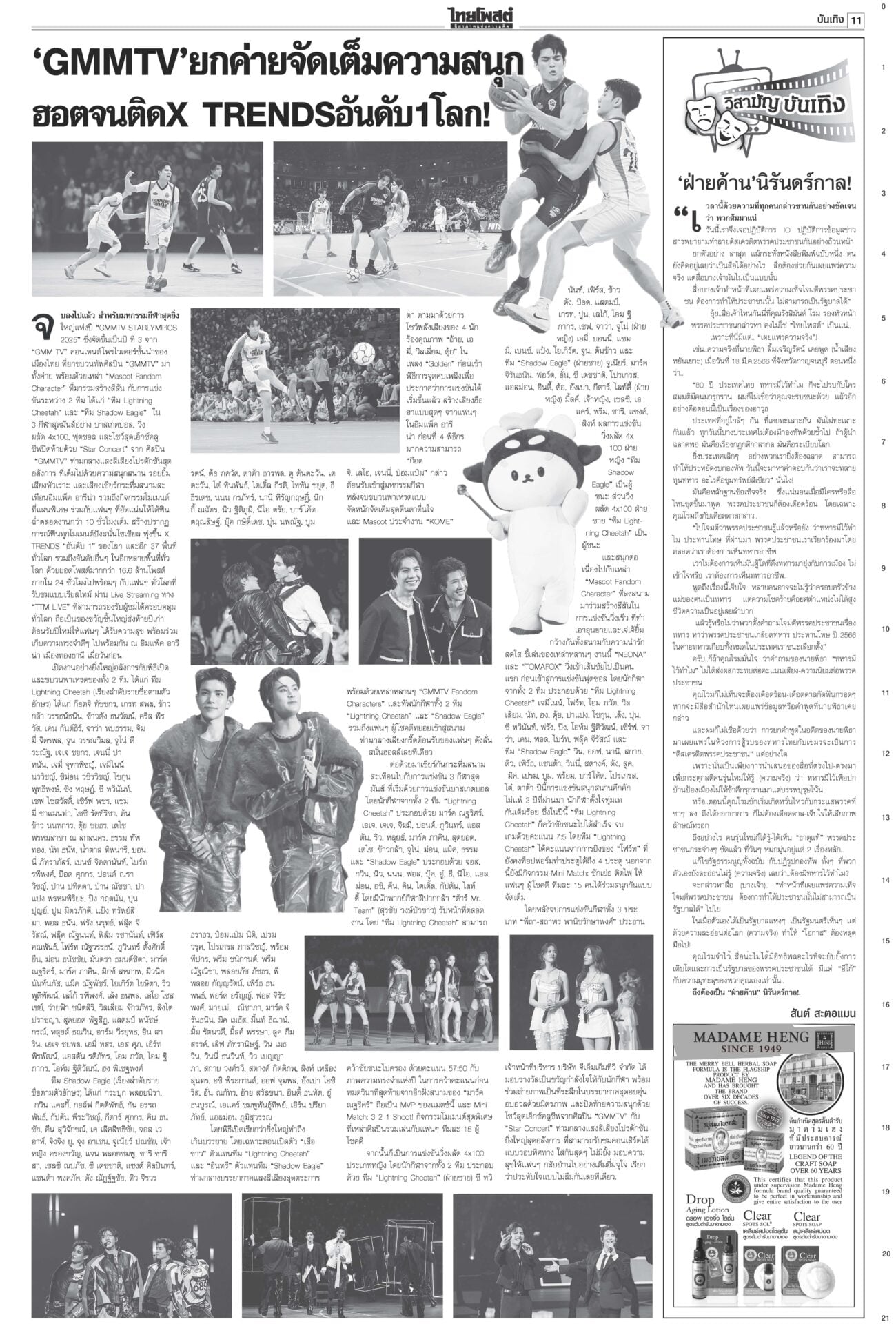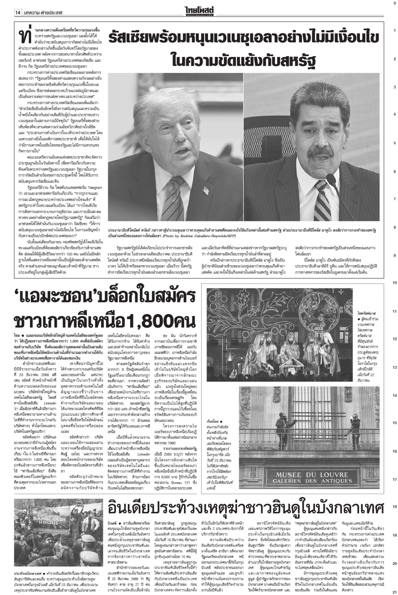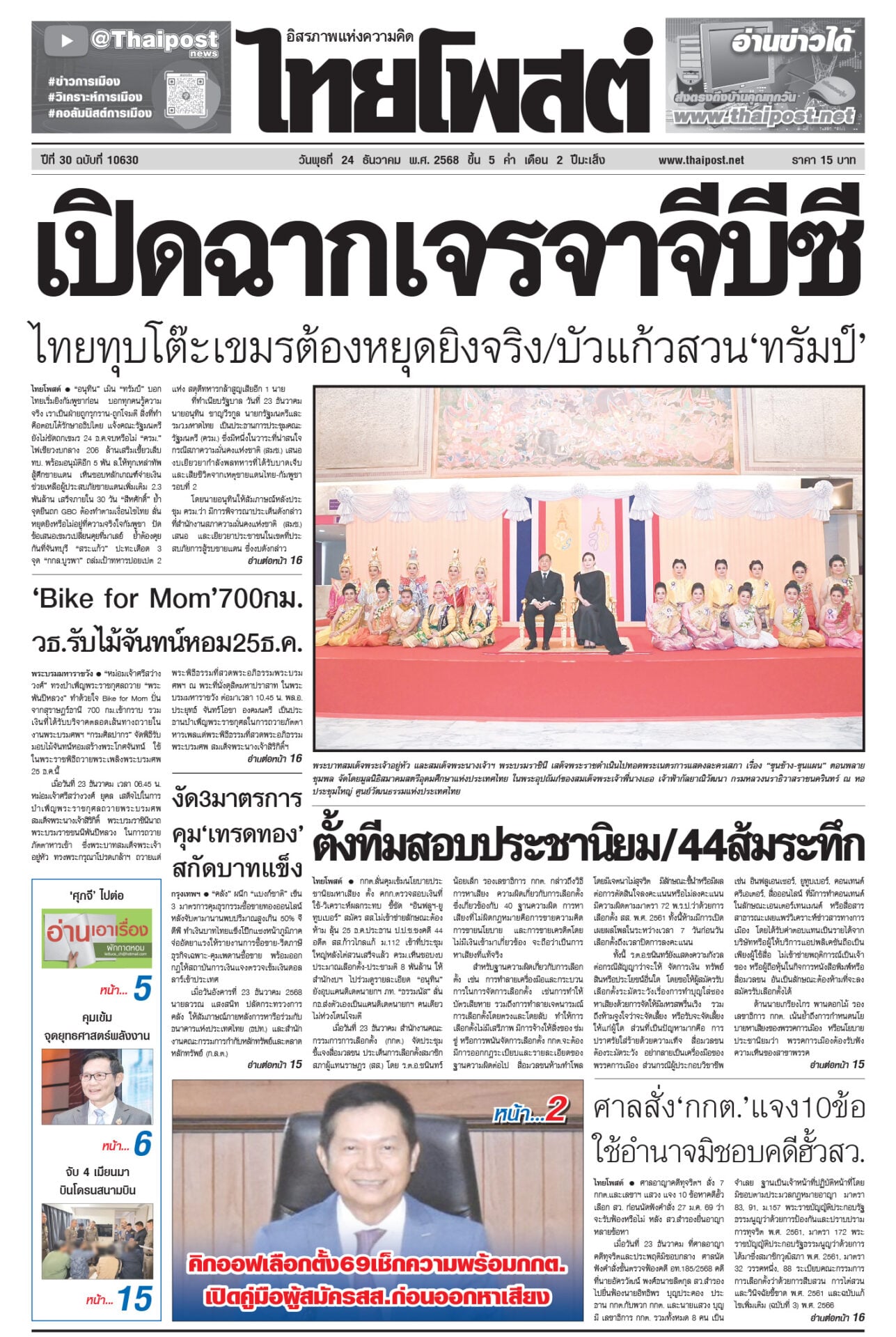 หนังสือพิมพ์ฉบับวันที่ 24 ธันวาคม 2568ข่าวหน้าหนึ่งเปิดฉากเจรจาจีบีซี ไทยทุบโต๊ะเขมรต้องหยุดยิงจริง/บัวแก้วสวน‘ทรัมป์’“อนุทิน” เมิน “ทรัมป์” บอกไทยเริ่มยิงกัมพูชาก่อน บอกทุกคนรู้ความจริง ตั้งทีมสอบประชานิยม/44ส้มระทึกกกต.ลั่นคุมเข้มนโยบายประชานิยมหาเสียง ตั้ง คกก.ตรวจสอบเงินที่ใช้-วิเคราะห์ผลกระทบ ชี้ชัด “อินฟลูฯ-ยูทูบเบอร์” สมัคร สส. ศาลสั่ง‘กกต.’แจง10ข้อ ใช้อำนาจมิชอบคดีฮั้วสว.ศาลอาญาคดีทุจริตฯ สั่ง 7 กกต.และเลขาฯ แสวง แจง 10 ข้อหาคดีฮั้วเลือก สว. งัด3มาตรการ คุม‘เทรดทอง’ สกัดบาทแข็ง“คลัง” ผนึก “แบงก์ชาติ” เข็น 3 มาตรการคุมธุรกรรมซื้อขายทองออนไลน์ ‘Bike for Mom’700กม. วธ.รับไม้จันทน์หอม25ธ.ค.“หม่อมเจ้าศรีสว่างวงศ์” ทรงบำเพ็ญพระราชกุศลถวาย “พระพันปีหลวง”