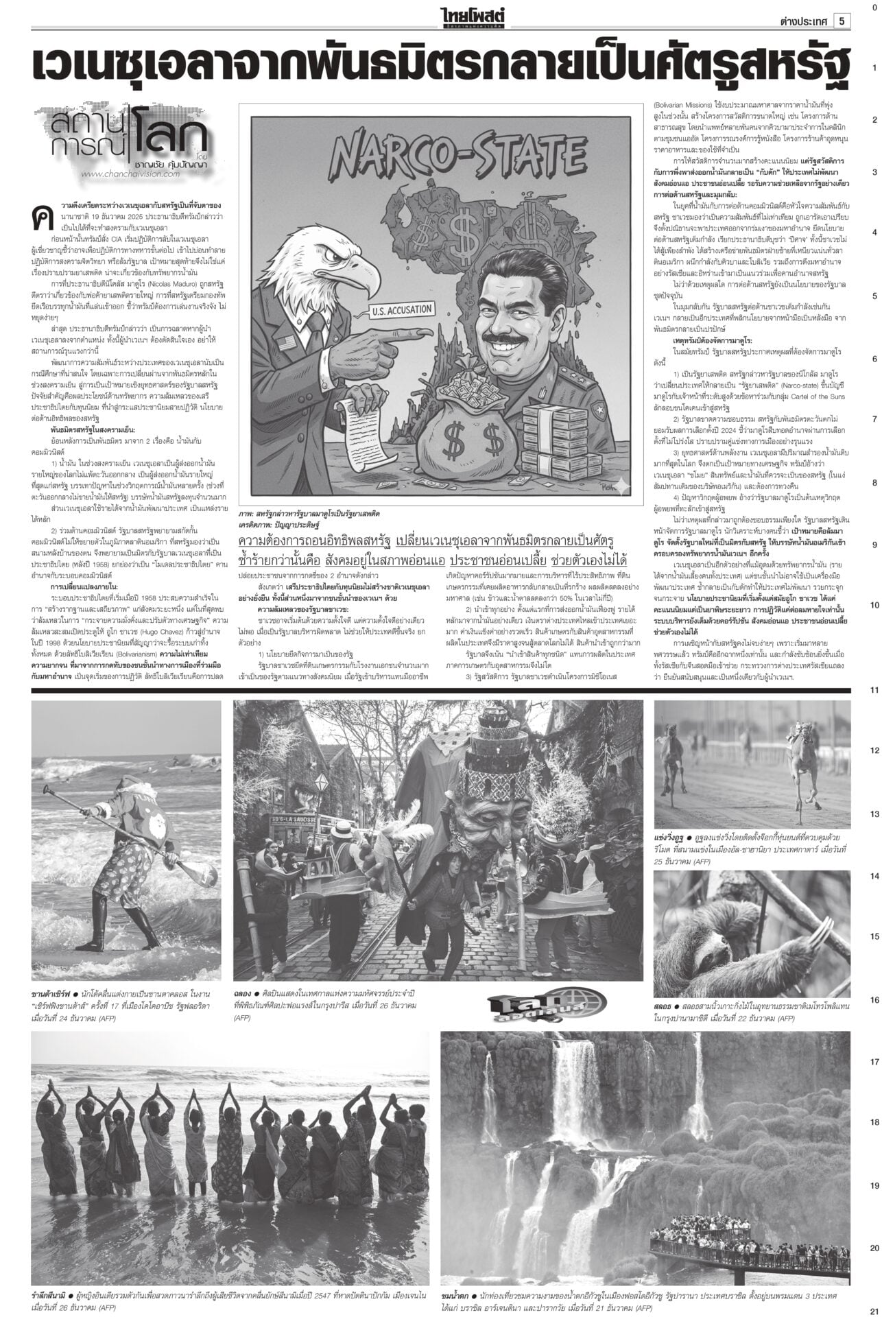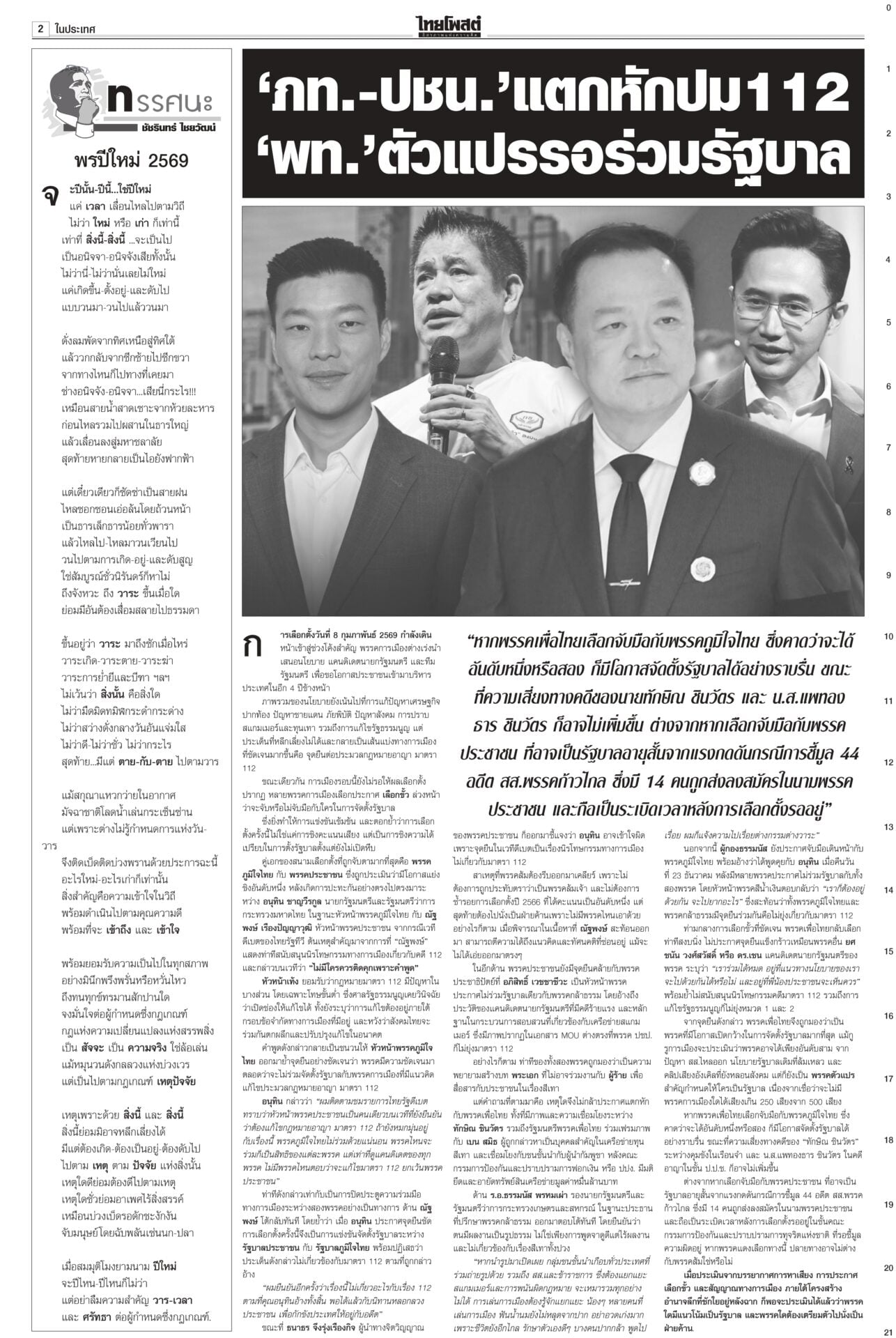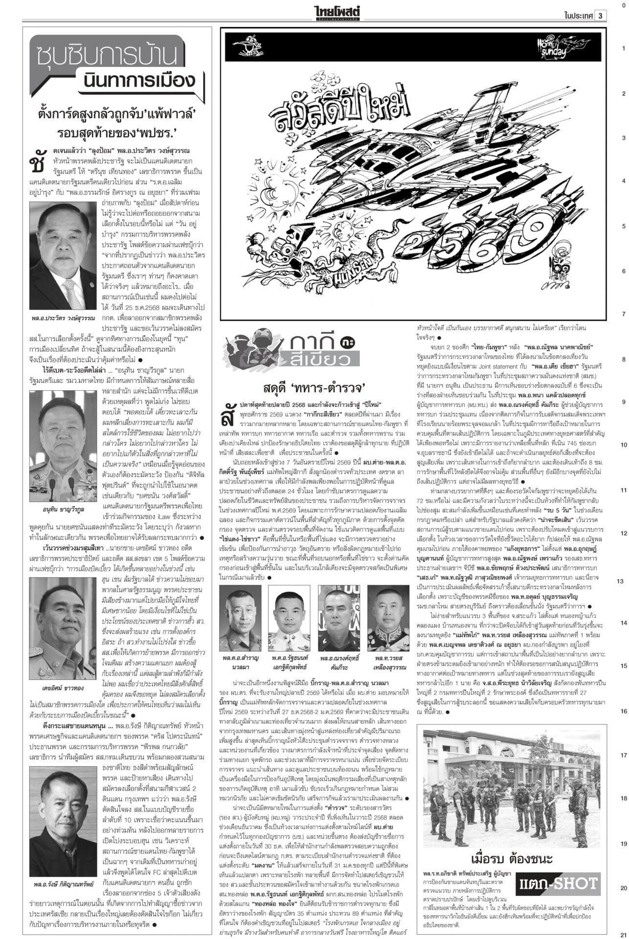 หนังสือพิมพ์ฉบับวันที่ 28 ธันวาคม 2568ข่าวหน้าหนึ่งหยุดยิงเขมรกระอัก ลงนาม16ข้อยึดตรงไหน‘ทหารไทย’ปักหลักตรงนั้น!ไทย-เขมรเห็นพ้องหยุดยิงทันทีเที่ยงวัน 27 ธ.ค. ยึดปฏิญญากัวลาลัมเปอร์ เปิดแถลงการณ์ร่วมยาวเหยียด 16 ข้อ เขมรกระอักเลือด พื้นที่ไทยยึดได้ยึดเลย การวางกำลังทหารในปัจจุบันโดยไม่มีการเคลื่อนย้ายเพิ่มเติม เฝ้าระวัง72ชม. จับตา‘กัมพูชา’ เบี้่ยวเจอสวน!ผอ.ศูนย์แถลงข่าวร่วมฯ แจงเฝ้าระวังหยุดยิง 72 ชั่วโมง ชี้ตัวเลขที่เหมาะสม-ระดับมาตรฐานสากลใช้กันทั่วโลก ชี้บทเรียนฉีกข้อตกลงไทยพร้อมตอบโต้ป้องกันตนเองตามกฎบัตรสหประชาชาติข้อ ตามล่าอาชญากร ‘ฮุนเซน-ฮุนมาเนต’ไม่ปล่อยให้ลอยนวล เดินหน้าเอาผิด 2 พ่อลูกตระกูลฮุน อธิบดีอัยการฯ ลงพื้นที่ประชุม ผบช.ภ.3 สอบเสธ.ทหารเป็นพยานมัด “ฮุน เซน-ฮุน มาเนต”