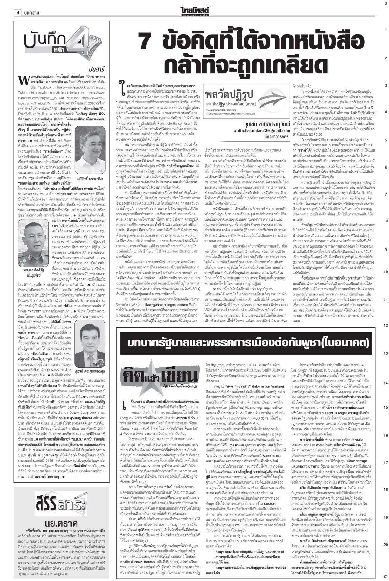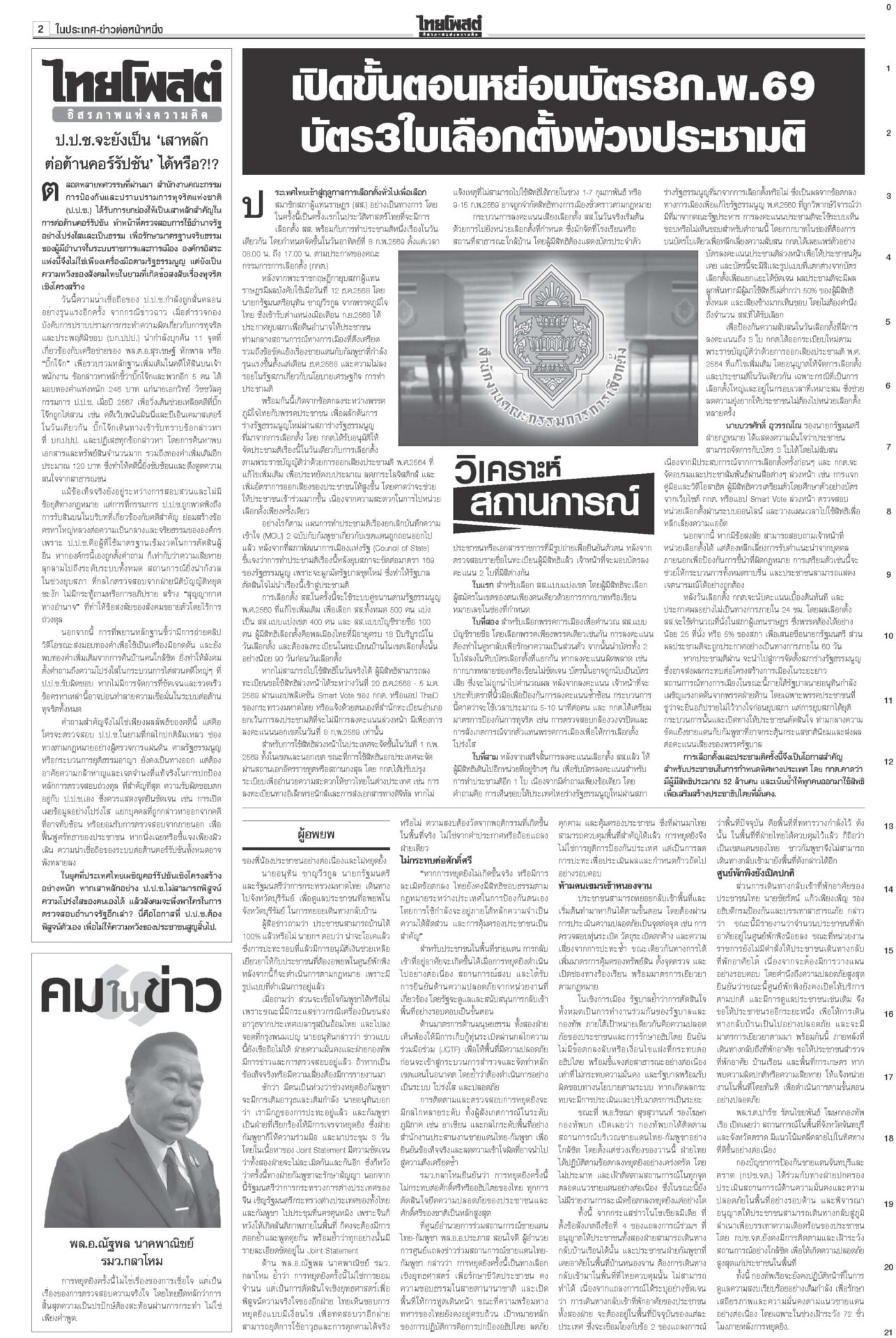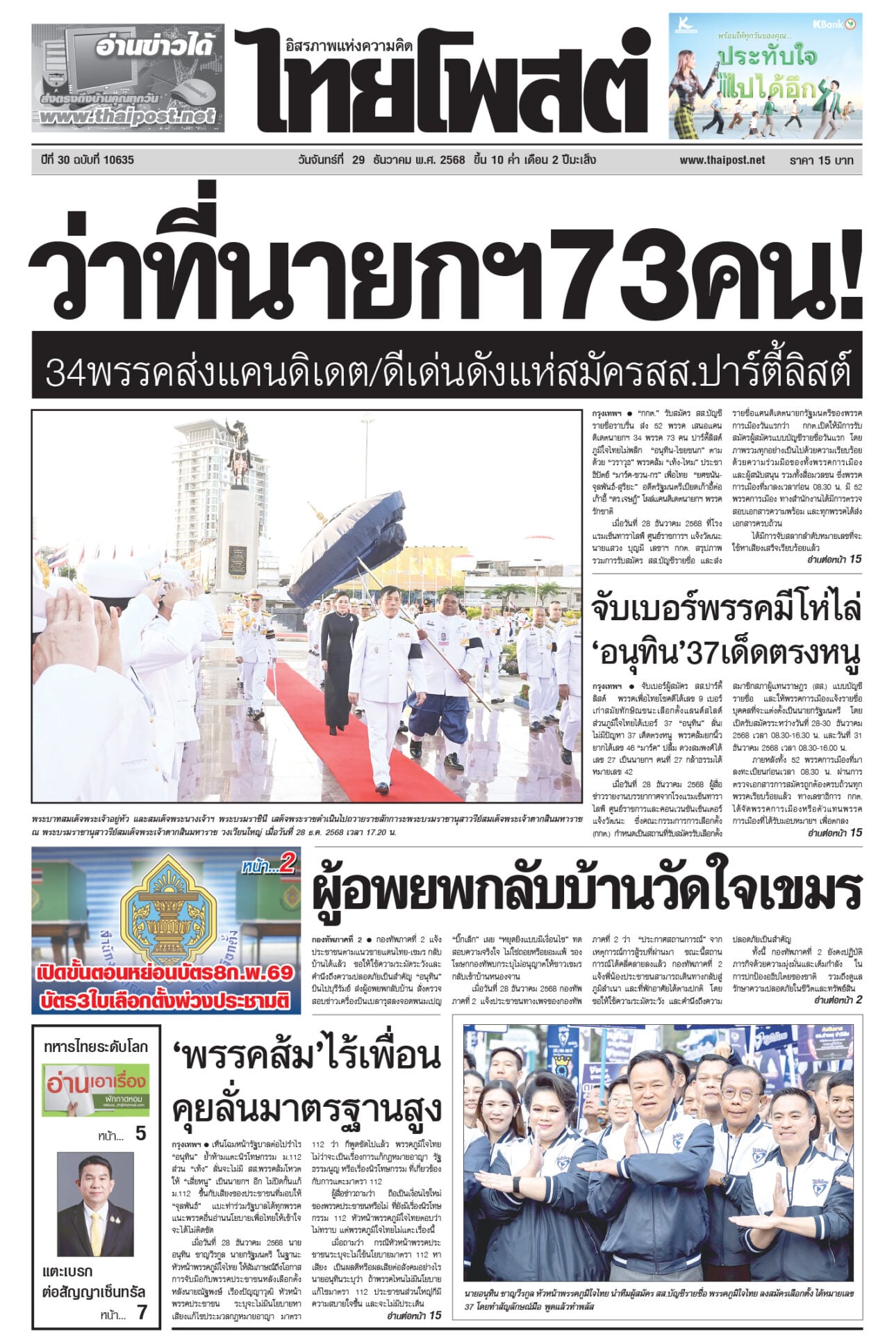 หนังสือพิมพ์ ฉบับวันที่ 29 ธันวาคม 2568ข่าวหน้าหนึ่งว่าที่นายกฯ73คน! 34พรรคส่งแคนดิเดต/ดีเด่นดังแห่สมัครสส.ปาร์ตี้ลิสต์“กกต.” รับสมัคร สส.บัญชีรายชื่อราบรื่น ส่ง 52 พรรค เสนอแคนดิเดตนายกฯ 34 จับเบอร์พรรคมีโห่ไล่ ‘อนุทิน’37เด็ดตรงหนูจับเบอร์ผู้สมัคร สส.ปาร์ตี้ลิสต์ พรรคเพื่อไทยโชคดีได้เลข 9 เบอร์เก่า ‘พรรคส้ม’ไร้เพื่อน คุยลั่นมาตรฐานสูงเห็นโฉมหน้ารัฐบาลต่อไปรำไร “อนุทิน” ย้ำห้ามแตะนิรโทษกรรม ม.112 ผู้อพยพกลับบ้านวัดใจเขมรกองทัพภาคที่ 2 แจ้งประชาชนตามแนวชายแดนไทย-เขมร