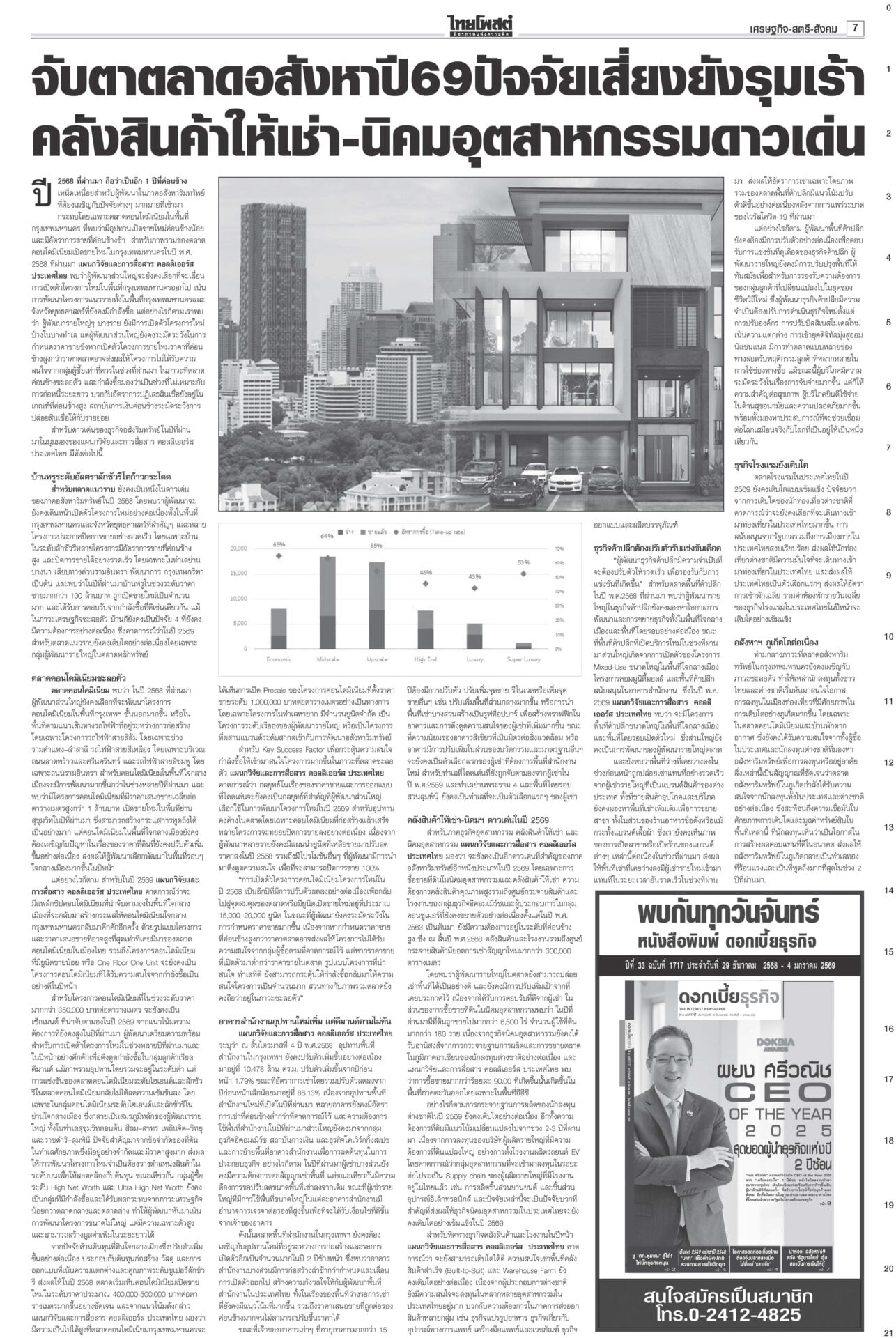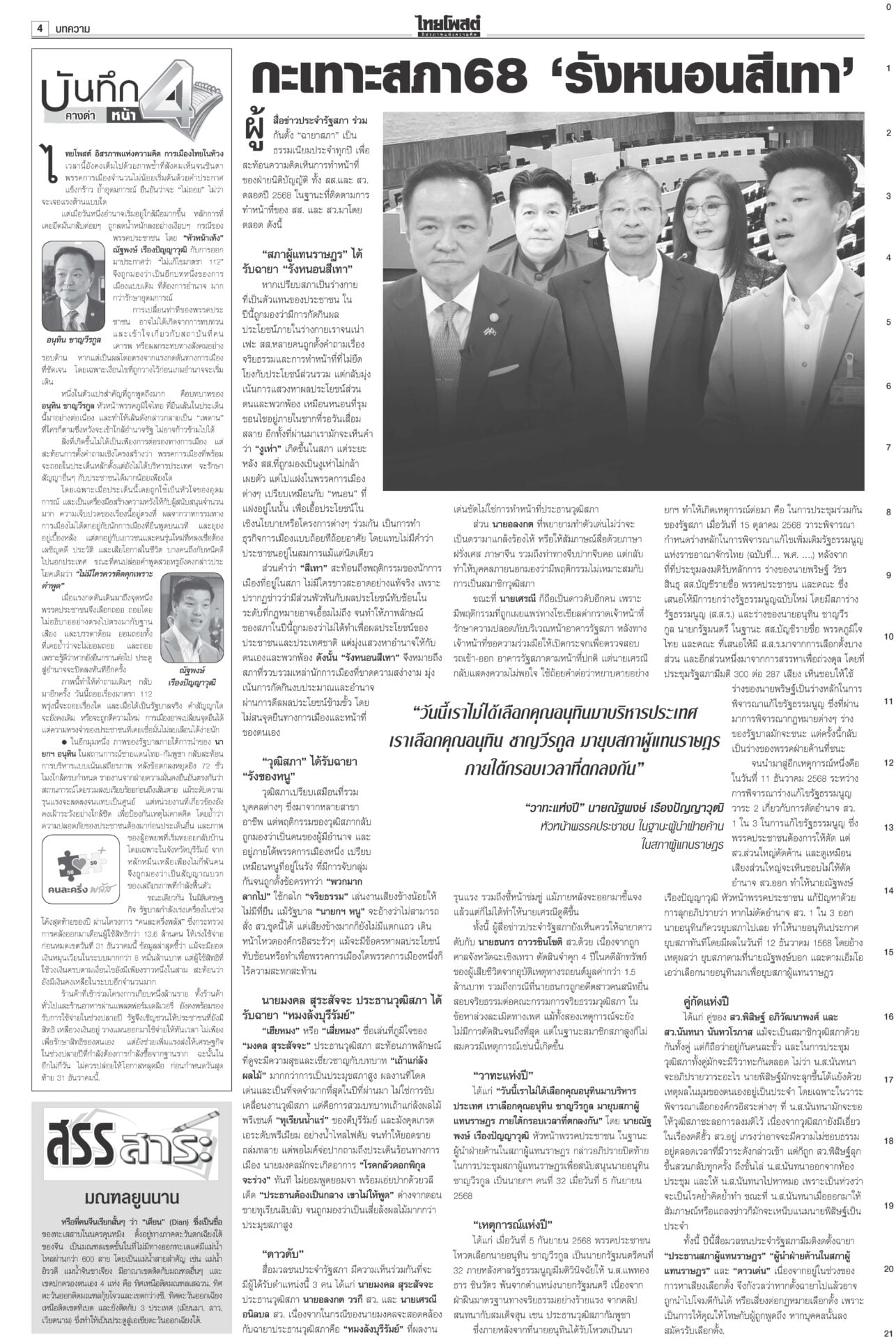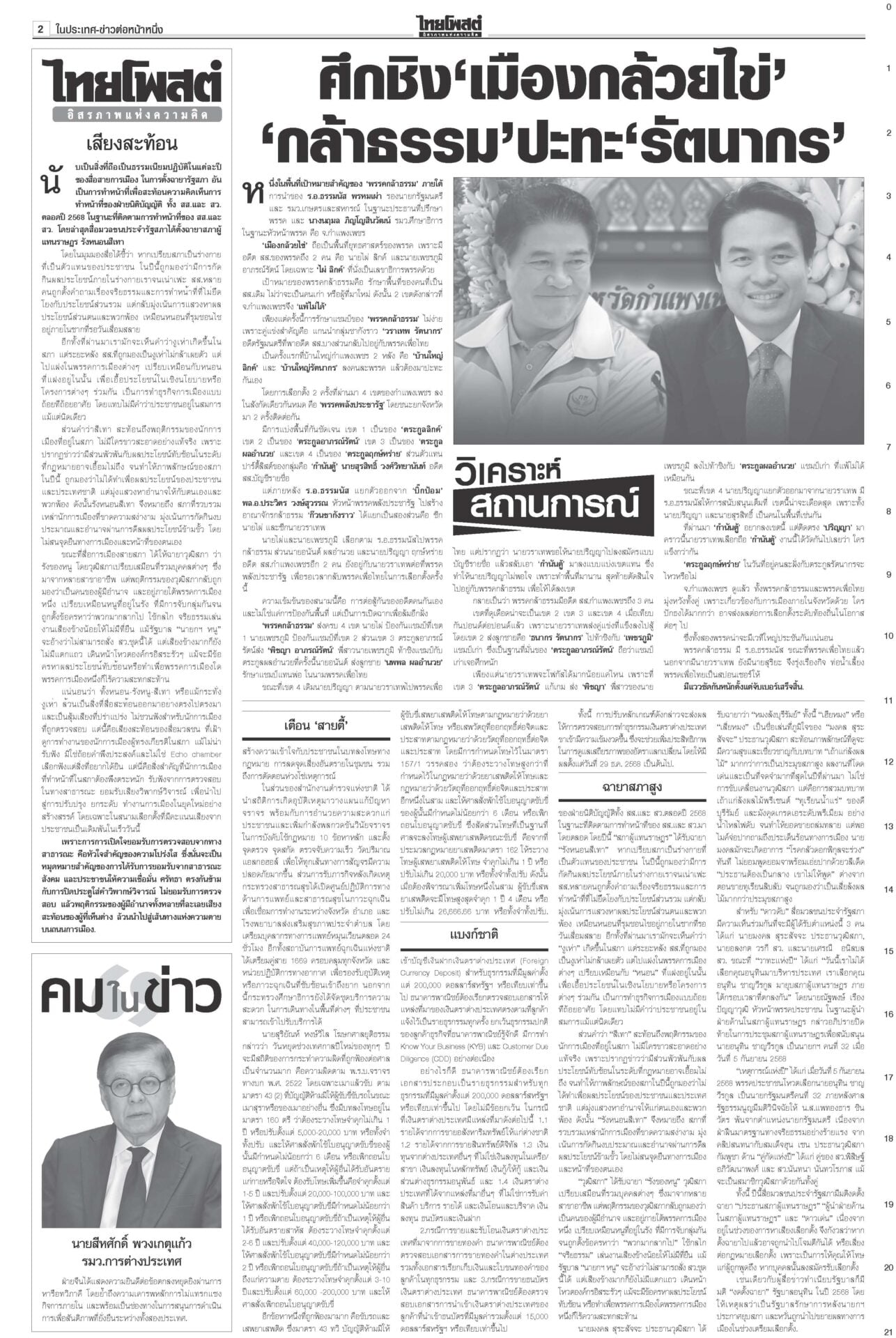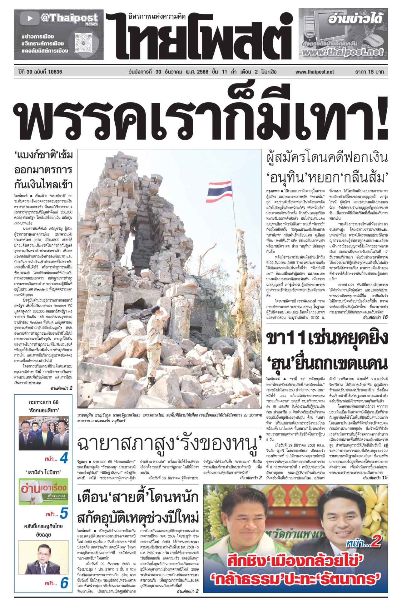 หนังสือพิมพ์ ฉบับวันที่ 30 ธันวาคม 2568ข่าวหน้าหนึ่งพรรคเราก็มีเทา! ผู้สมัครโดนคดีฟอกเงิน ‘อนุทิน’หยอก‘กลืนส้ม’โป๊ะแตก! เรามีเทาอยู่ในพรรค ผู้สมัคร สส.กทม.เขตบางพลัด “พรรคส้ม” ขา11เซ่นหยุดยิง ‘ฮุน’ยื่นถกเขตแดน“ขาที่ 11” หลังหยุดยิง ทหารไทยเหยียบกับระเบิดที่ “เขาสัตตะโสม” เขมรยังส่งโดรน 250 ลำก่อกวน ฉายาสภาสูง‘รังของหนู’ฉายาสภา 68 “รังหนอนสีเทา” ขณะที่สภาสูงคือ “รังของหนู” ‘แบงก์ชาติ’เข้ม ออกมาตรการ กันเงินไหลเข้าเริ่มแล้ว!! “แบงก์ชาติ” ยกระดับความเข้มงวดตรวจสอบธุรกรรมเงินตราต่างประเทศขาเข้า เตือน‘สายตี้’โดนหนัก สกัดอุบัติเหตุช่วงปีใหม่เปิดศูนย์อำนวยการป้องกันและลดอุบัติเหตุทางถนนช่วงเทศกาลปีใหม่ 2569
