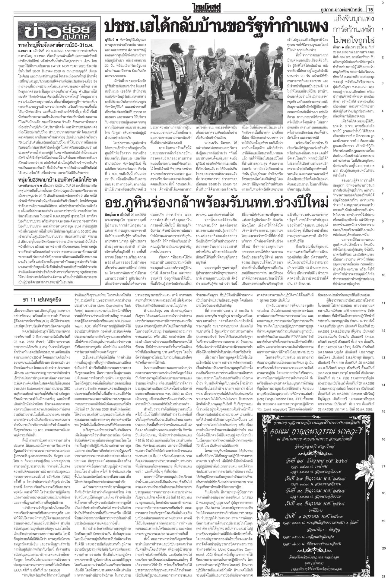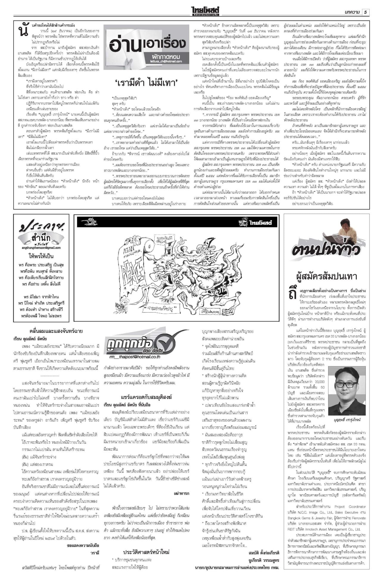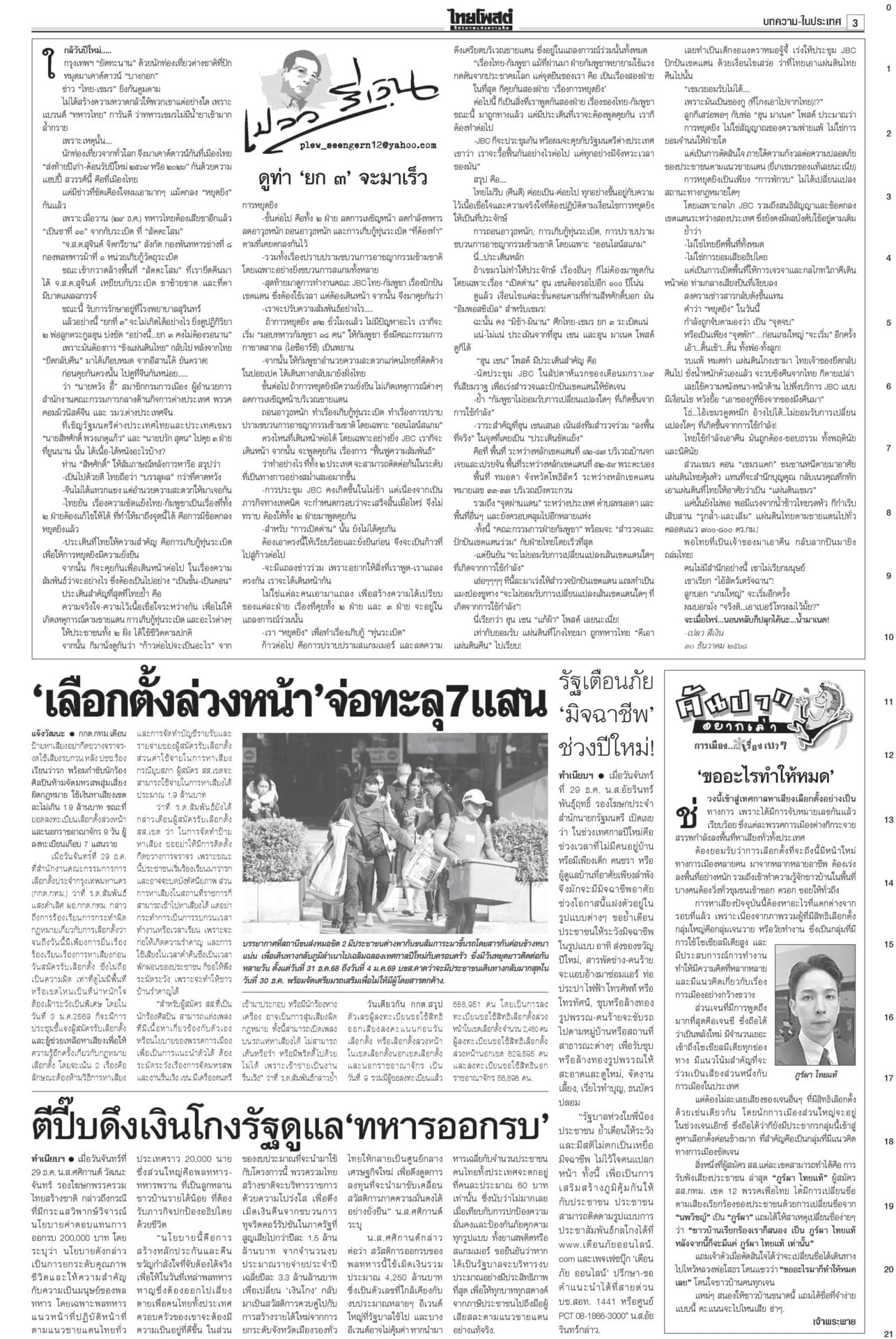 ฉบับวันที่ 30 ธันวาคม 2568 30 ธันวาคม 2568 เวลา 0:01 น. หนังสือพิมพ์ ฉบับวันที่ 30 ธันวาคม 2568ข่าวหน้าหนึ่งพรรคเราก็มีเทา! ผู้สมัครโดนคดีฟอกเงิน ‘อนุทิน’หยอก‘กลืนส้ม’โป๊ะแตก! เรามีเทาอยู่ในพรรค ผู้สมัคร สส.กทม.เขตบางพลัด “พรรคส้ม” ขา11เซ่นหยุดยิง ‘ฮุน’ยื่นถกเขตแดน“ขาที่ 11” หลังหยุดยิง ทหารไทยเหยียบกับระเบิดที่ “เขาสัตตะโสม” เขมรยังส่งโดรน 250 ลำก่อกวน ฉายาสภาสูง‘รังของหนู’ฉายาสภา 68 “รังหนอนสีเทา” ขณะที่สภาสูงคือ “รังของหนู” ‘แบงก์ชาติ’เข้ม ออกมาตรการ กันเงินไหลเข้าเริ่มแล้ว!! “แบงก์ชาติ” ยกระดับความเข้มงวดตรวจสอบธุรกรรมเงินตราต่างประเทศขาเข้า เตือน‘สายตี้’โดนหนัก สกัดอุบัติเหตุช่วงปีใหม่เปิดศูนย์อำนวยการป้องกันและลดอุบัติเหตุทางถนนช่วงเทศกาลปีใหม่ 2569 Tagsรายวันหนังสือพิมพ์ ข่าวที่เกี่ยวข้อง ฉบับวันที่ 29 ธันวาคม 2568 ฉบับวันที่ 28 ธันวาคม 2568 ฉบับวันที่ 28 ธันวาคม 2568 ฉบับวันที่ 27 ธันวาคม 2568 ฉบับวันที่ 26 ธันวาคม 2568 ฉบับวันที่ 25 ธันวาคม 2568 ฉบับวันที่ 24 ธันวาคม 2568 NEWS UPDATE 0:01 น. ศึกชิง ‘เมืองกล้วยไข่’ ‘กล้าธรรม’ ปะทะ ‘รัตนากร’ 20:26 น. พรรคโปรกองทัพอ้างชัยชนะถล่มทลายในการเลือกตั้งเมียนมาระยะแรก 20:10 น. ศาลอุทธรณ์ยืนยัน จับอดีตนายพลคดีล่วงละเมิดร้อยโทหญิง ไม่ให้ประกันตัว 18:35 น. ฟุตซอลไทยแพ้ทางอินโดฯ ชุดU16พ่าย3-4 จบรองแชมป์อาเซียน2025 18:23 น. 'แล็กลัน'ล็อกเข่า'มาร์เซโล' คว้ารางวัล'ซับมิชชันยอดเยี่ยม' ประจำปี2568