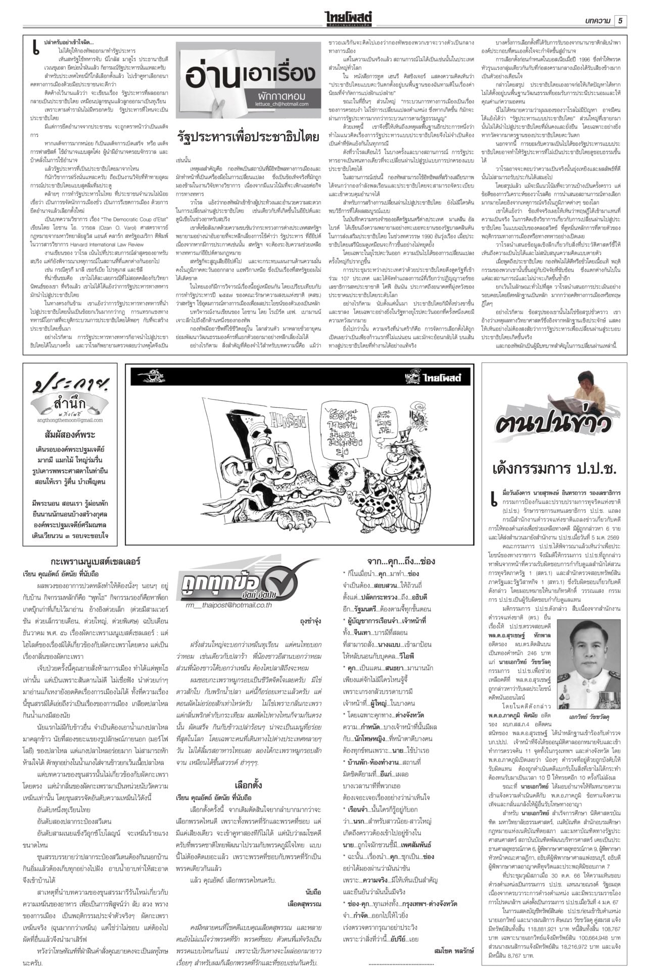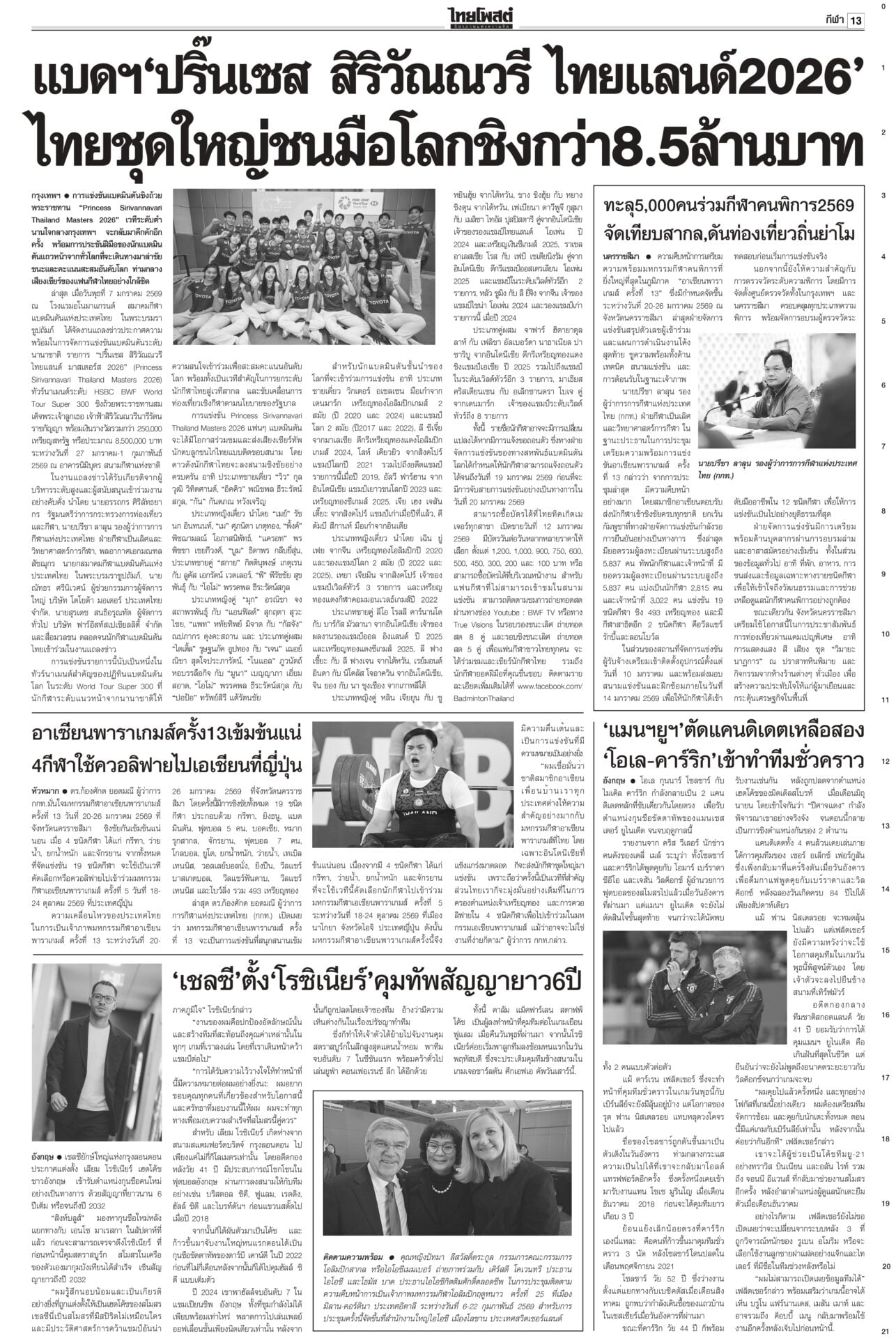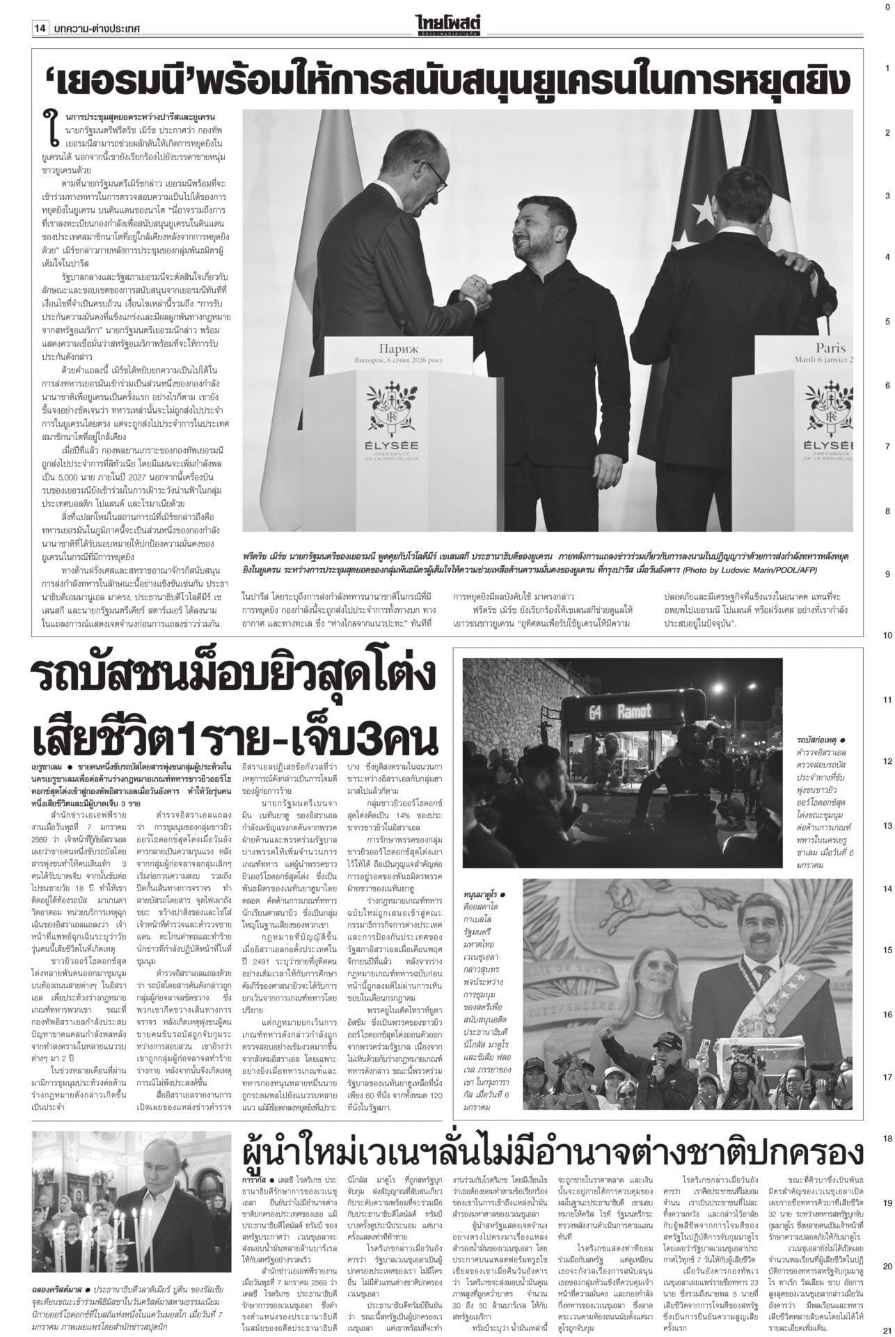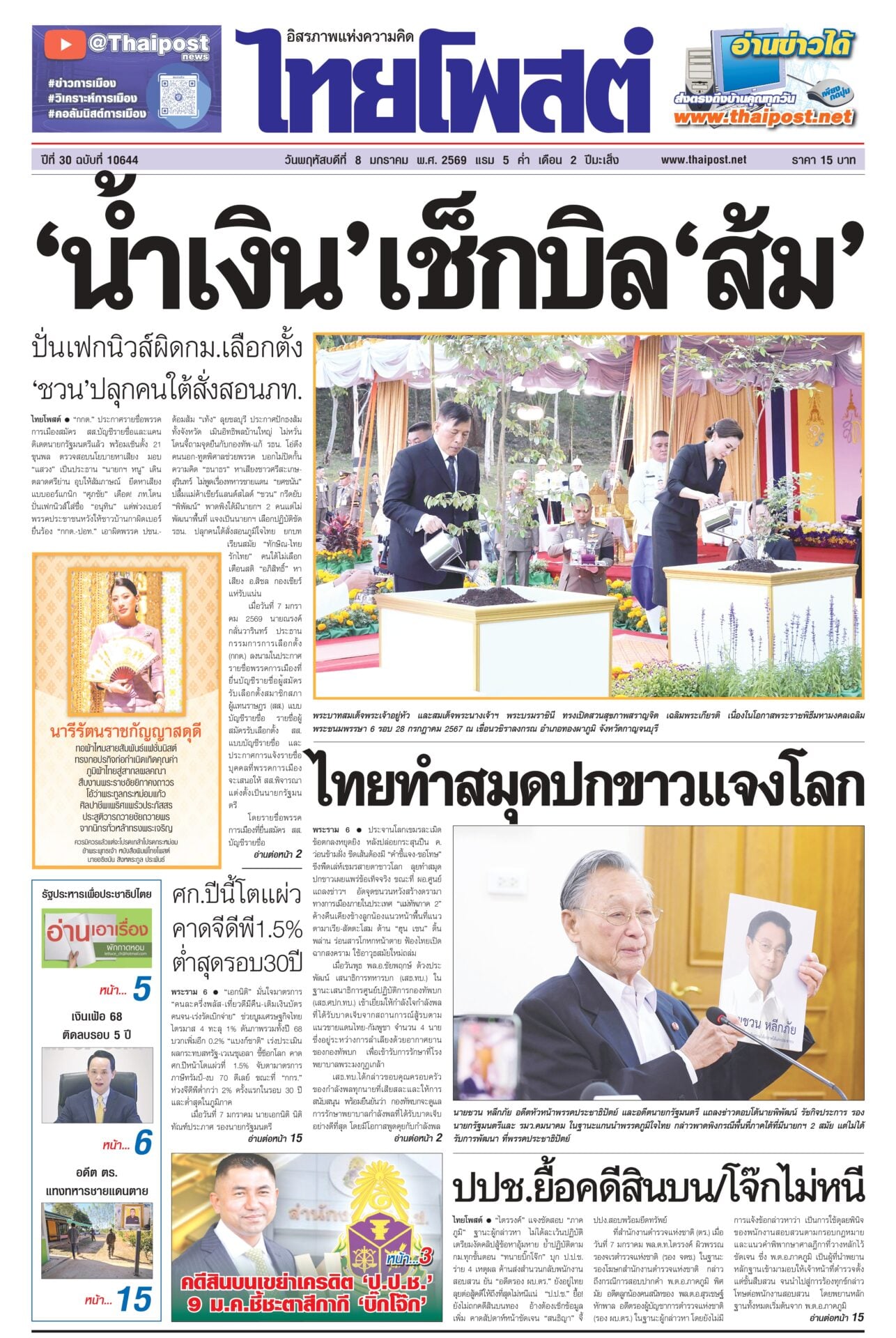 หนังสือพิมพ์ฉบับวันที่ 8 มกราคม 2569ข่าวหน้าหนึ่ง‘น้ำเงิน’เช็กบิล‘ส้ม’ ปั่นเฟกนิวส์ผิดกม.เลือกตั้ง ‘ชวน’ปลุกคนใต้สั่งสอนภท.“กกต.” ประกาศรายชื่อพรรคการเมืองสมัคร สส.บัญชีรายชื่อและแคนดิเดตนายกรัฐมนตรีแล้ว พร้อมเซ็นตั้ง 21 ขุนพล ตรวจสอบนโยบายหาเสียง มอบ “แสวง” เป็นประธาน “นายกฯ หนู” ปปช.ยื้อคดีสินบน/โจ๊กไม่หนี“ไตรรงค์” แจงชัดสอบ “ภาคภูมิ” ฐานะผู้กล่าวหา ไม่ได้ละเว้นปฏิบัติ เตรียมงัดคลิปสู้ข้อหาอุ้มหาย ย้ำปฏิบัติตาม กม.ทุกขั้นตอน “ทนายบิ๊กโจ๊ก” บุก ป.ป.ช. ศก.ปีนี้โตแผ่ว คาดจีดีพี1.5% ต่าสุดรอบ30ปี“เอกนิติ” มั่นใจมาตรการ “คนละครึ่งพลัส-เที่ยวดีมีคืน-เติมเงินบัตรคนจน-เร่งรัดเบิกจ่าย” ช่วยบูมเศรษฐกิจไทยไตรมาส 4/68 โตทะลุ 1% ดันภาพรวมทั้งปีบวกเพิ่มอีก 0.2% ไทยทำสมุดปกขาวแจงโลกประจานโลก เขมรละเมิดข้อตกลงหยุดยิง หลังปล่อยกระสุนปืน ค.ว่อนข้ามฝั่ง ขีดเส้นต้องมี “คำชี้แจง-ขอโทษ” ขึงพืดเล่ห์เขมรสายตาชาวโลก ลุยทำสมุดปกขาวเผยแพร่ข้อเท็จจริง