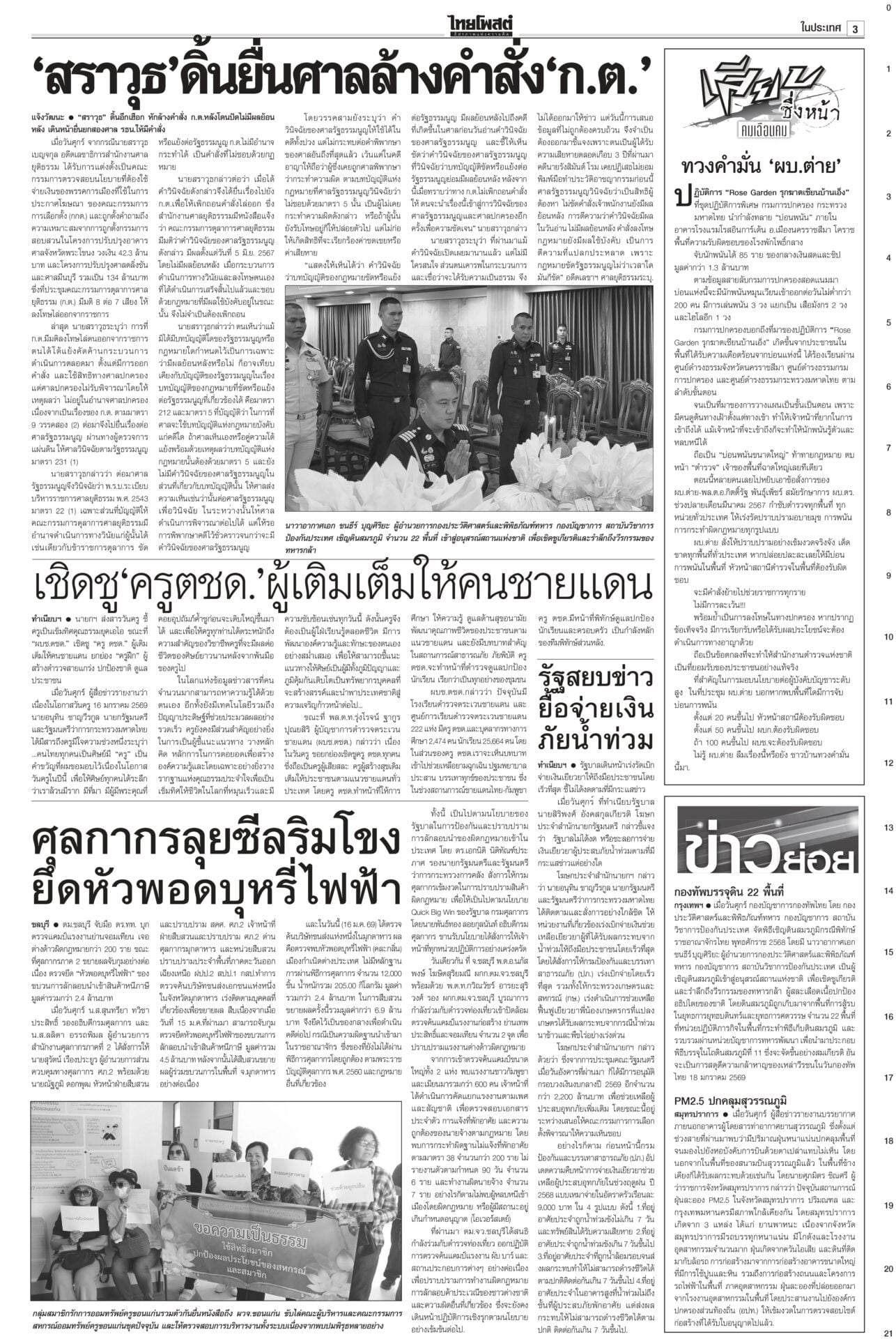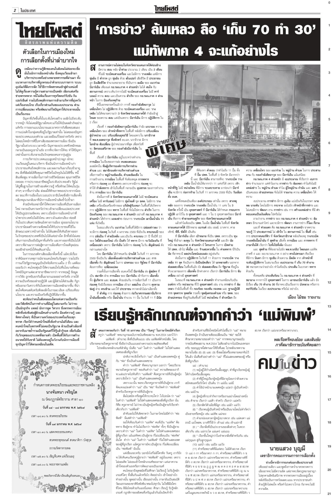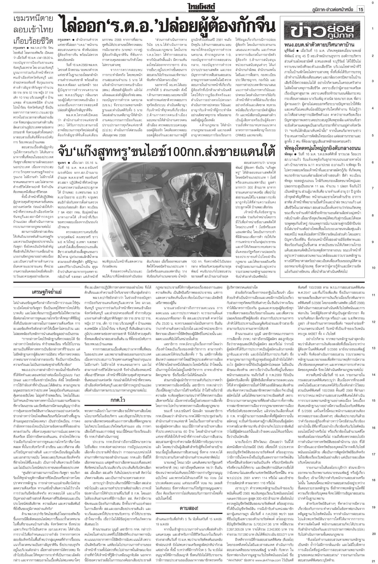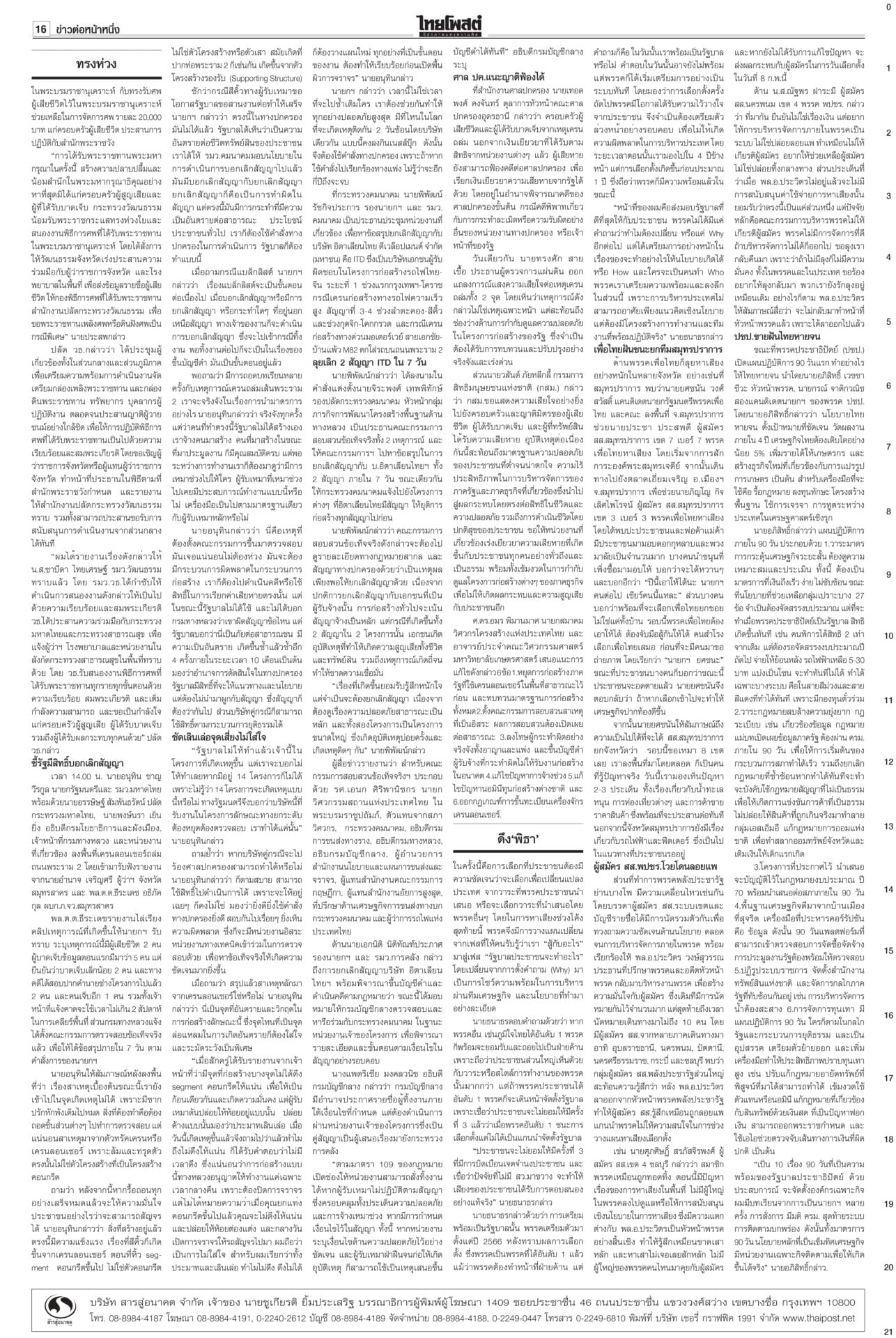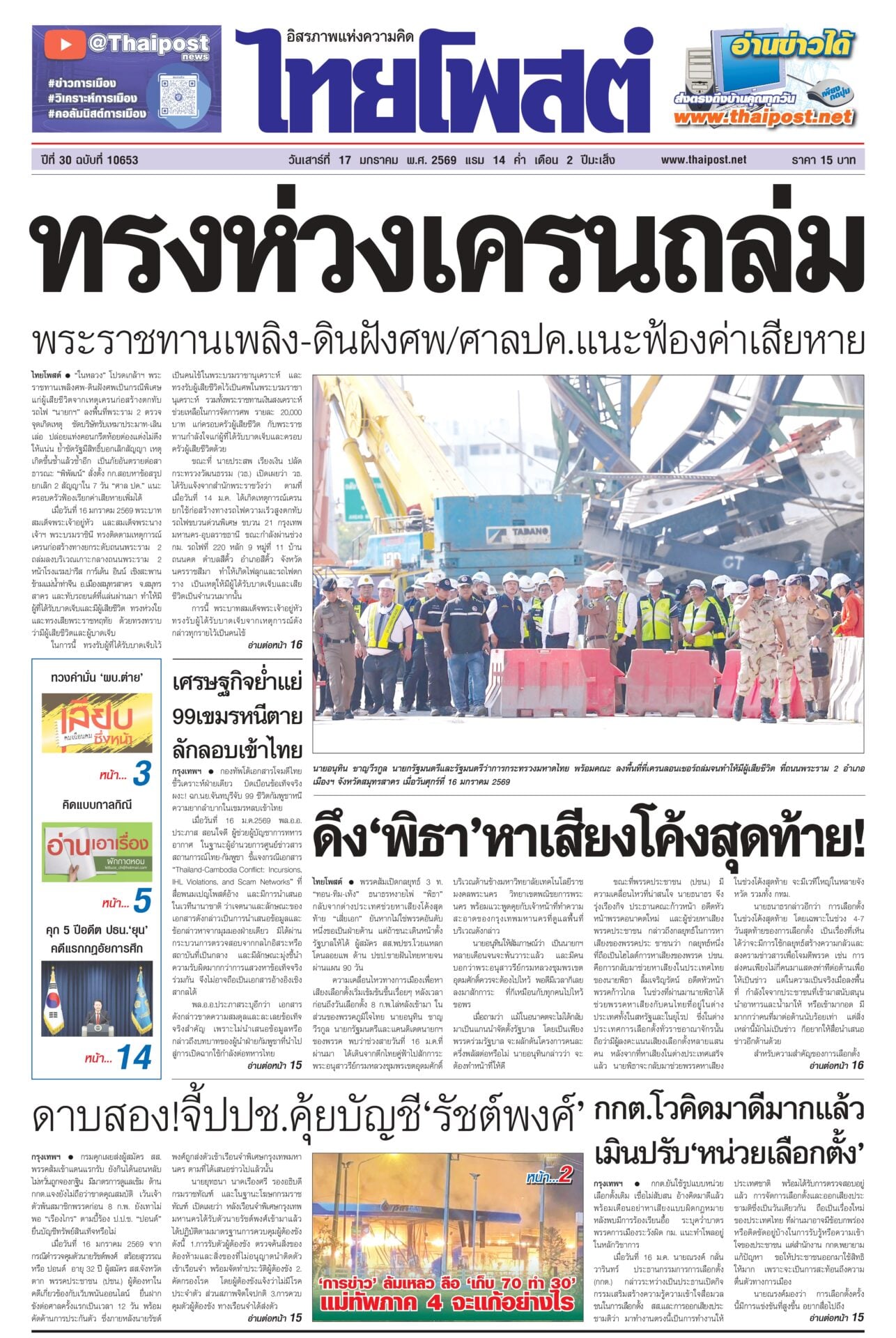 หนังสือพิมพ์ฉบับวันที่ 17 มกราคม 2569ข่าวหน้าหนึ่งทรงห่วงเครนถล่ม พระราชทานเพลิง-ดินฝังศพ/ศาลปค.แนะฟ้องค่าเสียหาย“ในหลวง” โปรดเกล้าฯ พระราชทานเพลิงศพ-ดินฝังศพเป็นกรณีพิเศษ แก่ผู้เสียชีวิตจากเหตุเครนก่อสร้างตกทับรถไฟ “นายกฯ” ลงพื้นที่พระราม 2 ตรวจจุดเกิดเหตุ ซัดบริษัทรับเหมาประมาท-เลินเล่อ เศรษฐกิจยํ่าแย่ 99เขมรหนีตาย ลักลอบเข้าไทยกองทัพโต้เอกสารโจมตีไทย ชี้วิเคราะห์ฝ่ายเดียว บิดเบือนข้อเท็จจริง ผงะ! ฉก.นย.จันทบุรีจับ 99 ชีวิตกัมพูชาหนีความยากลำบากในเขมรหลบเข้าไทย ดึง‘พิธา’หาเสียงโค้งสุดท้าย!พรรคส้มเปิดกลยุทธ์ 3 ท. “ทอน-ทิม-เท้ง” ธนาธรหงายไพ่ “พิธา” กลับจากต่างประเทศช่วยหาเสียงโค้งสุดท้าย “เสี่ยเอก” ยันหากไม่ใช่พรรคอันดับหนึ่งขอเป็นฝ่ายค้าน ดาบสอง! จี้ปปช.คุ้ยบัญชี ‘รัชต์พงศ์’กรมคุกเผยส่งผู้สมัคร สส.พรรคส้มเข้าแดนแรกรับ ยังกินได้นอนหลับ ไม่หวั่นถูกจองกฐิน มีมาตรการดูแลเข้ม ด้าน กกต.แจงยังไม่ถือว่าขาดคุณสมบัติ กกต.โวคิดมาดีมากแล้ว เมินปรับ‘หน่วยเลือกตั้ง’กกต.ยันใช้รูปแบบหน่วยเลือกตั้งเดิม เชื่อไม่สับสน อ้างคิดมาดีแล้ว พร้อมเตือนอย่าหาเสียงแบบผิดกฎหมาย หลังพบมีการร้องเรียนอื้อ