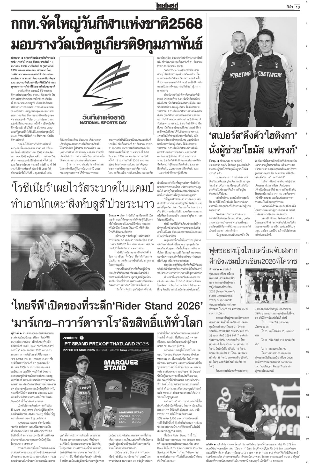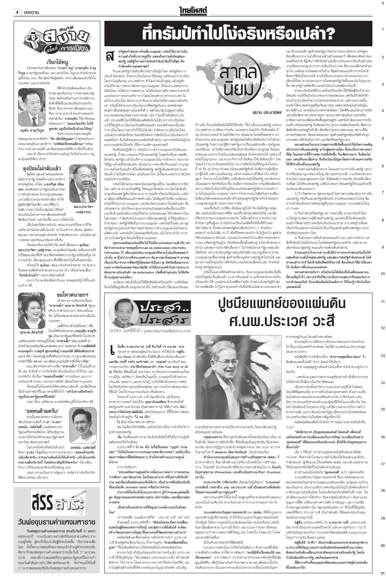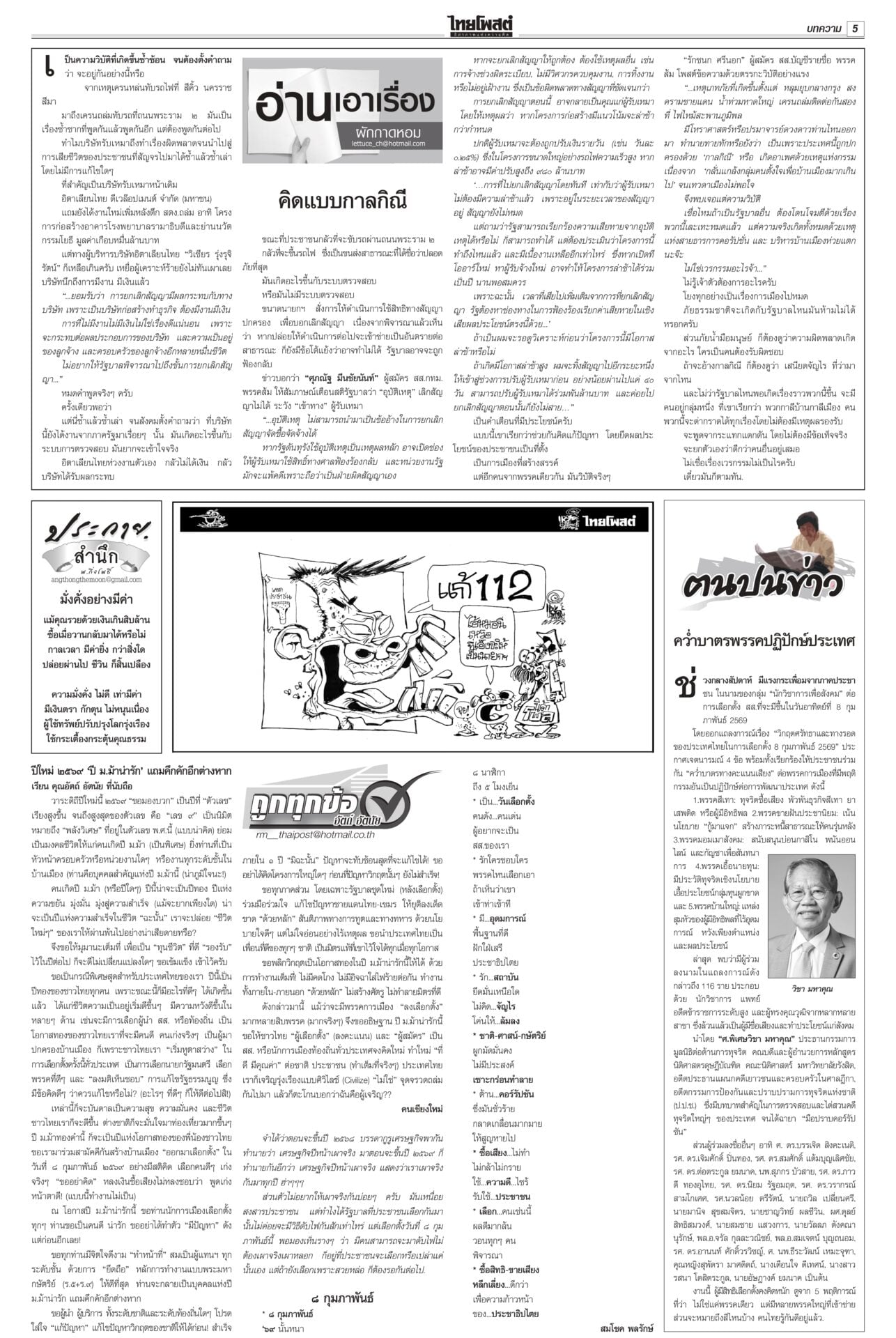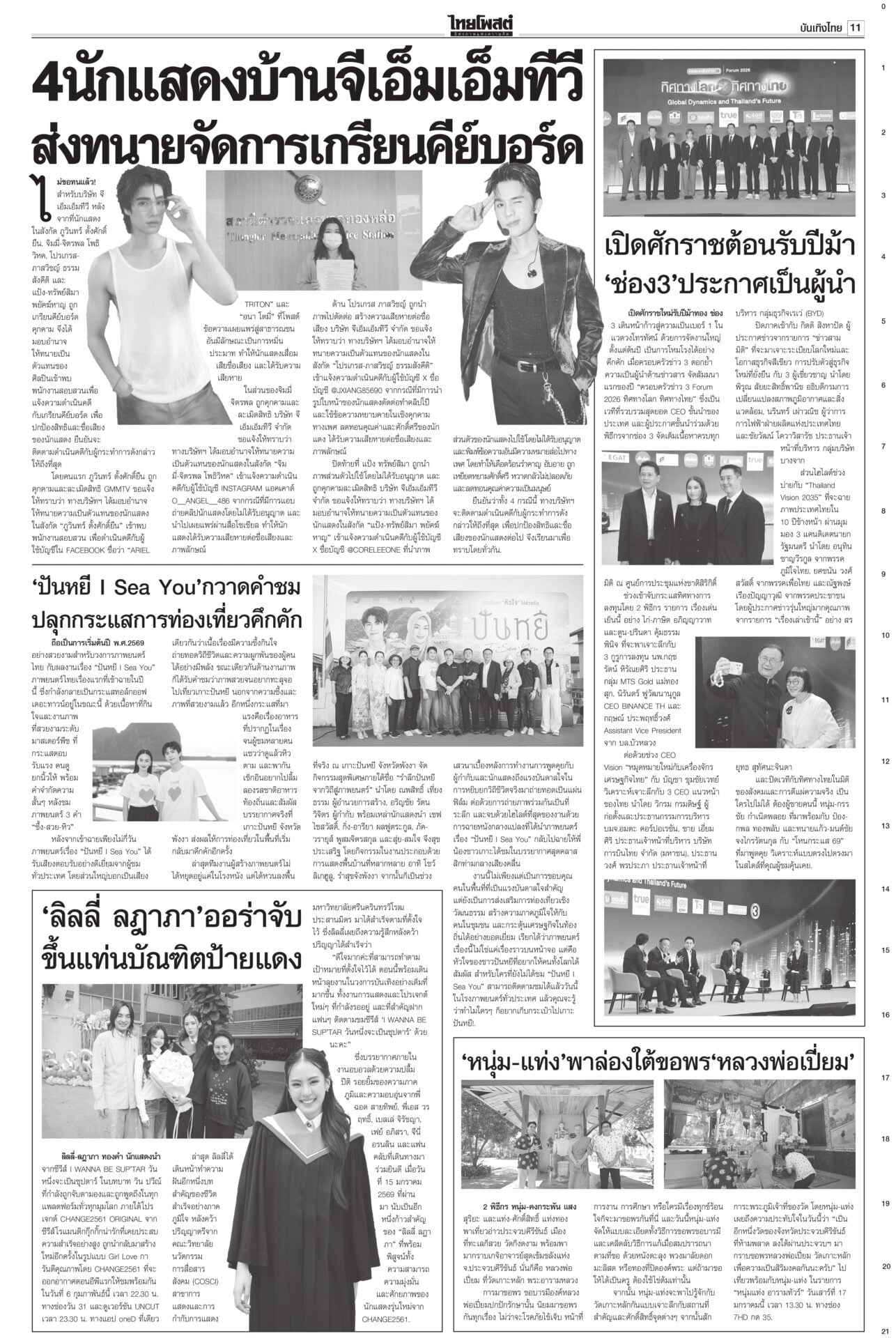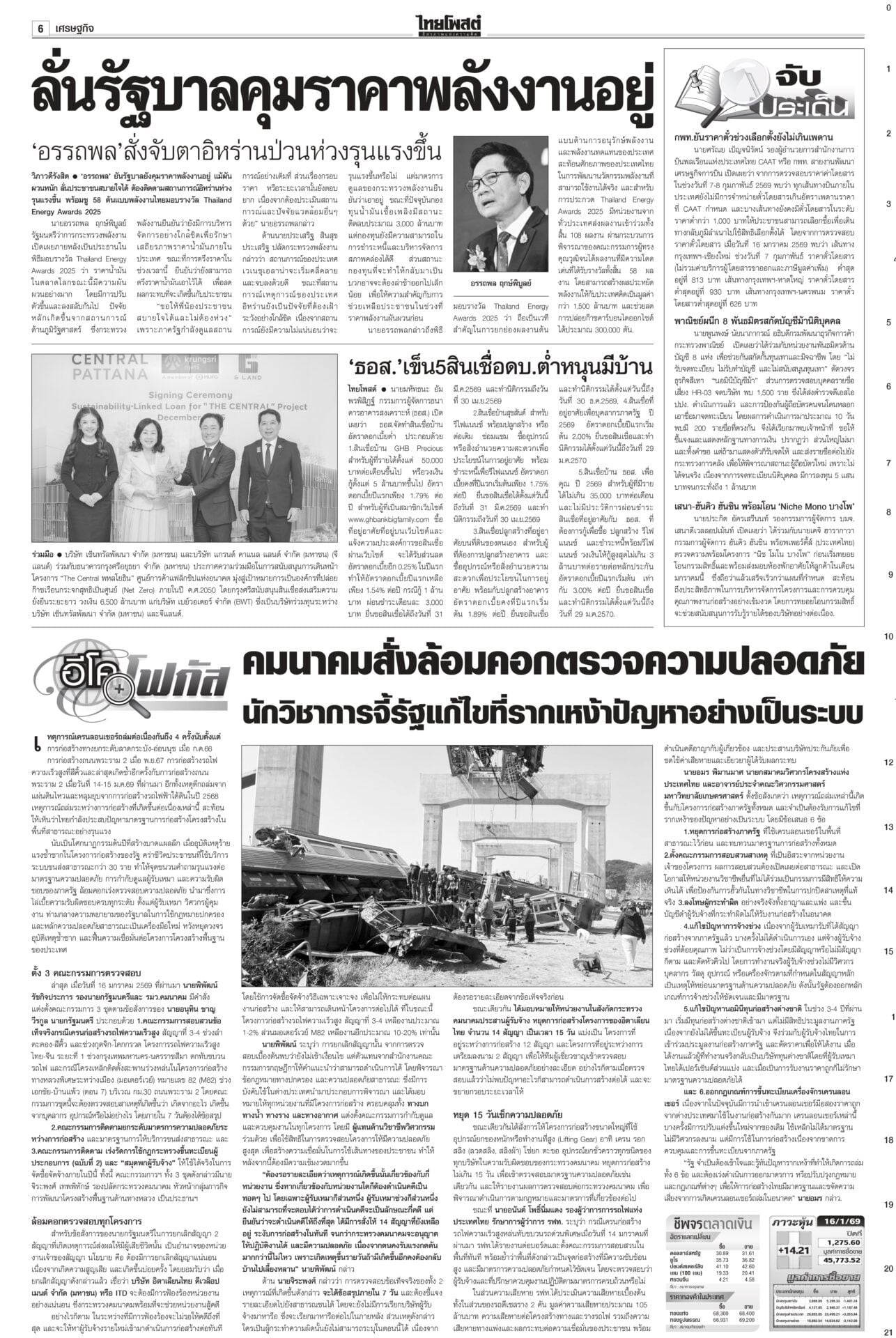 หนังสือพิมพ์ฉบับวันที่ 17 มกราคม 2569ข่าวหน้าหนึ่งทรงห่วงเครนถล่ม พระราชทานเพลิง-ดินฝังศพ/ศาลปค.แนะฟ้องค่าเสียหาย“ในหลวง” โปรดเกล้าฯ พระราชทานเพลิงศพ-ดินฝังศพเป็นกรณีพิเศษ แก่ผู้เสียชีวิตจากเหตุเครนก่อสร้างตกทับรถไฟ “นายกฯ” ลงพื้นที่พระราม 2 ตรวจจุดเกิดเหตุ ซัดบริษัทรับเหมาประมาท-เลินเล่อ เศรษฐกิจยํ่าแย่ 99เขมรหนีตาย ลักลอบเข้าไทยกองทัพโต้เอกสารโจมตีไทย ชี้วิเคราะห์ฝ่ายเดียว บิดเบือนข้อเท็จจริง ผงะ! ฉก.นย.จันทบุรีจับ 99 ชีวิตกัมพูชาหนีความยากลำบากในเขมรหลบเข้าไทย ดึง‘พิธา’หาเสียงโค้งสุดท้าย!พรรคส้มเปิดกลยุทธ์ 3 ท. “ทอน-ทิม-เท้ง” ธนาธรหงายไพ่ “พิธา” กลับจากต่างประเทศช่วยหาเสียงโค้งสุดท้าย “เสี่ยเอก” ยันหากไม่ใช่พรรคอันดับหนึ่งขอเป็นฝ่ายค้าน ดาบสอง! จี้ปปช.คุ้ยบัญชี ‘รัชต์พงศ์’กรมคุกเผยส่งผู้สมัคร สส.พรรคส้มเข้าแดนแรกรับ ยังกินได้นอนหลับ ไม่หวั่นถูกจองกฐิน มีมาตรการดูแลเข้ม ด้าน กกต.แจงยังไม่ถือว่าขาดคุณสมบัติ กกต.โวคิดมาดีมากแล้ว เมินปรับ‘หน่วยเลือกตั้ง’กกต.ยันใช้รูปแบบหน่วยเลือกตั้งเดิม เชื่อไม่สับสน อ้างคิดมาดีแล้ว พร้อมเตือนอย่าหาเสียงแบบผิดกฎหมาย หลังพบมีการร้องเรียนอื้อ