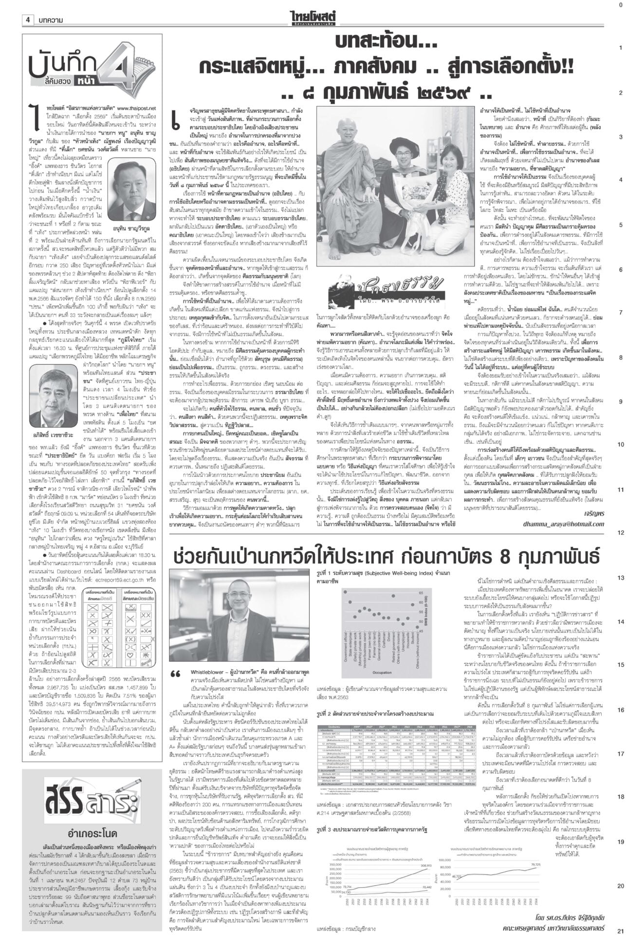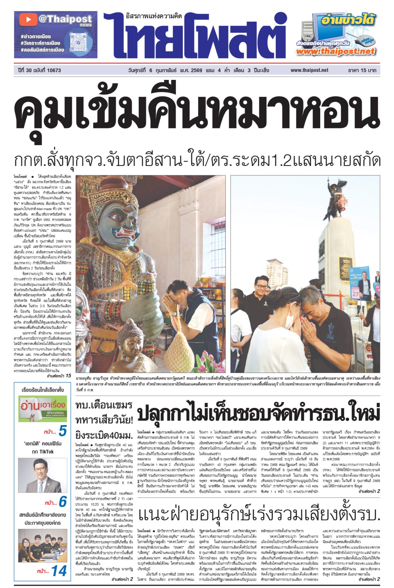 หนังสือพิมพ์ ฉบับวันที่ 6 กุมภาพันธ์ 2569ข่าวหน้าหนึ่งคุมเข้มคืนหมาหอน กกต.สั่งทุกจว.จับตาอีสาน-ใต้/ตร.ระดม1.2แสนนายสกัดโค้งสุดท้ายเลือกตั้งเดือด! “แสวง” สั่ง ผอ.กกต.จังหวัดจับตาซื้อเสียง “อีสาน-ใต้” ผบ.ตร.ระดมตำรวจ 1.2 แสน ปลุกกาไม่เห็นชอบจัดทำรธน.ใหม่กลุ่มรวมพลังแผ่นดินฯ แถลงคัดค้านการออกเสียงประชามติ 8 ก.พ. แนะฝ่ายอนุรักษ์เร่งรวมเสียงตั้งรบ.นักวิชาการวิเคราะห์เลือกตั้งโค้งสุดท้าย “ภูมิใจไทย-อนุทิน” ครบเครื่อง ทบ.เตือนเขมร ทหารเสียวินัย! ยิงระเบิด40มม.กัมพูชายิงลูกระเบิด 40 มม. ตกใกล้ฐานไทยพื้นที่กันทรลักษ์ อ้างกำลังพลชุดใหม่เสียวินัย