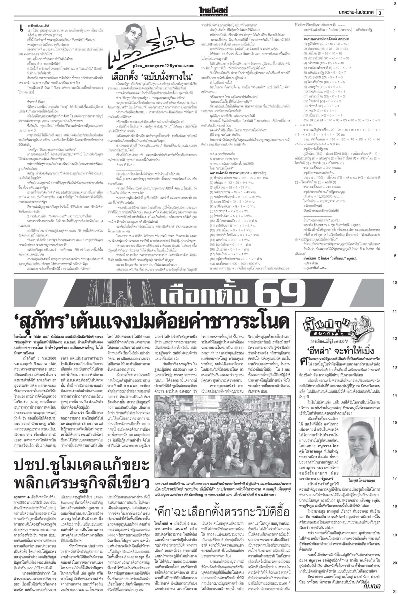 ฉบับวันที่ 6 กุมภาพันธ์ 2569 6 กุมภาพันธ์ 2569 เวลา 0:01 น. หนังสือพิมพ์ ฉบับวันที่ 6 กุมภาพันธ์ 2569ข่าวหน้าหนึ่งคุมเข้มคืนหมาหอน กกต.สั่งทุกจว.จับตาอีสาน-ใต้/ตร.ระดม1.2แสนนายสกัดโค้งสุดท้ายเลือกตั้งเดือด! “แสวง” สั่ง ผอ.กกต.จังหวัดจับตาซื้อเสียง “อีสาน-ใต้” ผบ.ตร.ระดมตำรวจ 1.2 แสน ปลุกกาไม่เห็นชอบจัดทำรธน.ใหม่กลุ่มรวมพลังแผ่นดินฯ แถลงคัดค้านการออกเสียงประชามติ 8 ก.พ. แนะฝ่ายอนุรักษ์เร่งรวมเสียงตั้งรบ.นักวิชาการวิเคราะห์เลือกตั้งโค้งสุดท้าย “ภูมิใจไทย-อนุทิน” ครบเครื่อง ทบ.เตือนเขมร ทหารเสียวินัย! ยิงระเบิด40มม.กัมพูชายิงลูกระเบิด 40 มม. ตกใกล้ฐานไทยพื้นที่กันทรลักษ์ อ้างกำลังพลชุดใหม่เสียวินัย Tagsรายวันหนังสือพิมพ์ ข่าวที่เกี่ยวข้อง ฉบับวันที่ 5 กุมภาพันธ์ 2569 ฉบับวันที่ 4 กุมภาพันธ์ 2569 ฉบับวันที่ 3 กุมภาพันธ์ 2569 ฉบับวันที่ 2 กุมภาพันธ์ 2569 ฉบับวันที่ 1 กุมภาพันธ์ 2569 ฉบับวันที่ 1 กุมภาพันธ์ 2569 ฉบับวันที่ 31 มกราคม 2569 NEWS UPDATE 2:21 น. 'เก้า สุภัสสรา' ดังข้ามประเทศ 1 นาทีบัตรแฟนไซน์ที่จีนหมด 2:16 น. 'เบียร์ พร้อมพงษ์' ลดน้ำหนัก 15 กก. ดูแลเรื่องอาหารและออกกำลังกาย 2:14 น. 'บาส-หลงชาง' ขอบคุณล้านวิวแรก สุดปลื้มแรงซัปพอร์ตซีรีส์ท่วมท้น 22:34 น. เช็กอากาศทั่วไทย 7 วันข้างหน้า ช่วงแรกอุณหภูมิสูงขึ้น มีฝนฟ้าคะนอง ตามด้วยลมหนาวระลอกใหม่ 22:14 น. 'สาธิต' รวมพลังประชาธิปัตย์ระยอง ปราศรัยโค้งสุดท้าย ชูพรรค ปชป. เป็นทางรอดประเทศ