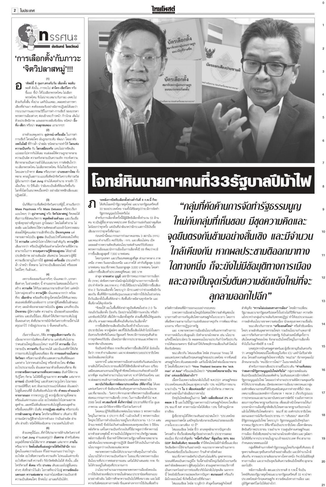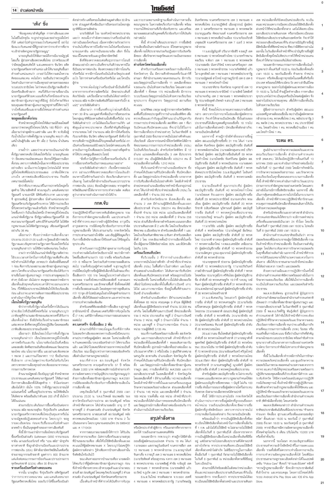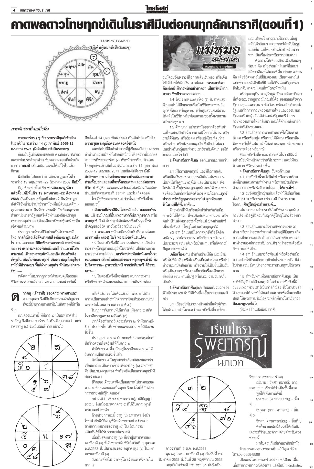 ฉบับวันที่ 8 กุมภาพันธ์ 2569 8 กุมภาพันธ์ 2569 เวลา 0:01 น. หนังสือพิมพ์ฉบับวันที่ 8 กุมภาพันธ์ 2569ข่าวหน้าหนึ่ง‘เท้ง’ชิ่งเรือบินเทา ไม่ตอบสื่อปม‘สุริยะ-เบนสมิธ’/‘อนุทิน’โต้ภาพAIเก่าแต่ดูแก่“อนุทิน” โต้ภาพเอไอ หลังถูกเพจดังแฉนั่งกินข้าวคู่ “เบน สมิธ” ชี้ภาพเก่าทำไมดูแก่ สาธุ หลังผลโพลให้ ภท.ได้ สส.เกิน 180 ที่นั่ง ขอรอชัดเจนก่อนฟอร์มรัฐบาล ย้ำเงื่อนไขจับขั้ว ไม่แก้หมวด กกต.จับคนซื้อเสียงกกต.คุมเข้มโค้งสุดท้ายก่อนเลือกตั้ง ระดมตำรวจ-อส.ตั้งด่านทั่วประเทศ เตรียมขยายผลซื้อเสียงเชียงราย-สุราษฎร์ธานี เจอโพยพร้อมเงิน 6 หมื่น ระดมตร.1.2แสน คุมหน่วยเลือกตั้งสตช.ระดม ตร. 1.2 แสนนายดูแลความปลอดภัย แจ้งนักท่องเที่ยวต่างชาติ มาตรการรักษาความปลอดภัยในการเลือกตั้ง งดจำหน่ายเครื่องดื่มแอลกอฮอล์ 24 ชั่วโมง ฝ่าฝืนคุก 6 เดือน สรุปคำสั่งศาล สอย49ผู้สมัครกกต.เปิดคำสั่งศาล สั่งถอนชื่อผู้สมัคร สส.เขต 18 คน กล้าธรรมโดนไป 6 และบัญชีรายชื่อ 31 ราย ขอ ปชช.ตรวจสอบรายชื่อ-เตรียมหลักฐานแสดงตนก่อนไปใช้สิทธิ เน้นย้ำ Tagsรายวันหนังสือพิมพ์ ข่าวที่เกี่ยวข้อง ฉบับวันที่ 7 กุมภาพันธ์ 2569 ฉบับวันที่ 7 กุมภาพันธ์ 2569 ฉบับวันที่ 6 กุมภาพันธ์ 2569 ฉบับวันที่ 5 กุมภาพันธ์ 2569 ฉบับวันที่ 4 กุมภาพันธ์ 2569 ฉบับวันที่ 3 กุมภาพันธ์ 2569 ฉบับวันที่ 2 กุมภาพันธ์ 2569 NEWS UPDATE 0:01 น. โจทย์หินนายกฯคนที่33รัฐบาลปีม้าไฟ 22:20 น. ลักลอบปล่อยน้ำเสียลงทะเลพัทยา สะท้อนช่องโหว่การกำกับดูแลสิ่งแวดล้อม 22:11 น. ในหลวงพระราชทานพระบรมราชวโรกาสให้นายกฯ-รมว.คลัง เฝ้าฯ 21:58 น. ในหลวงพระราชทานเพลิงศพท่านผู้หญิงพันธุ์สวลี กิติยากร 21:29 น. 'ฮาเมส' ย้ายเล่นเมเจอร์ลีกฯ เซ็นซบ 'มินเนโซตา' ระยะสั้น