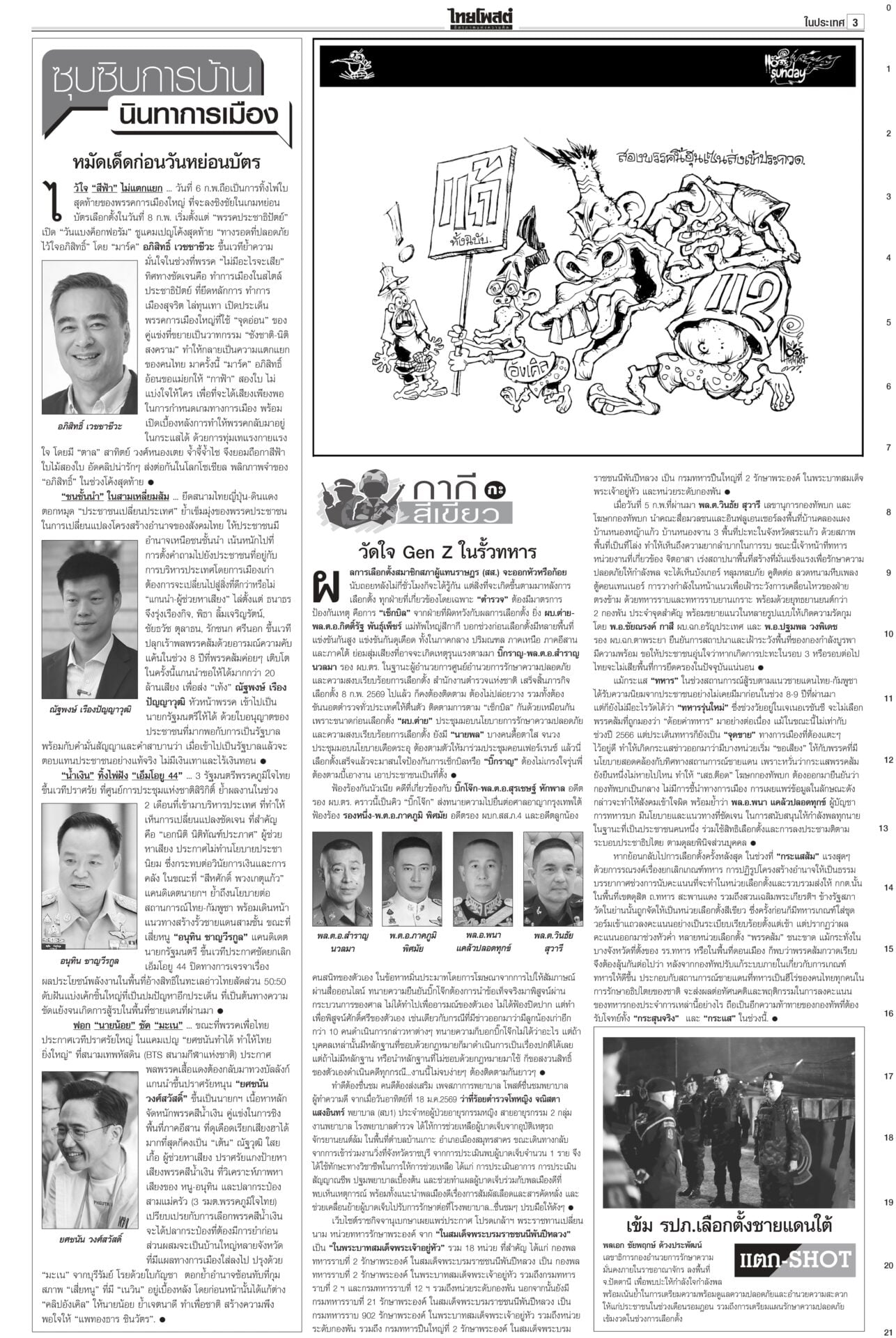 หนังสือพิมพ์ฉบับวันที่ 8 กุมภาพันธ์ 2569ข่าวหน้าหนึ่ง‘เท้ง’ชิ่งเรือบินเทา ไม่ตอบสื่อปม‘สุริยะ-เบนสมิธ’/‘อนุทิน’โต้ภาพAIเก่าแต่ดูแก่“อนุทิน” โต้ภาพเอไอ หลังถูกเพจดังแฉนั่งกินข้าวคู่ “เบน สมิธ” ชี้ภาพเก่าทำไมดูแก่ สาธุ หลังผลโพลให้ ภท.ได้ สส.เกิน 180 ที่นั่ง ขอรอชัดเจนก่อนฟอร์มรัฐบาล ย้ำเงื่อนไขจับขั้ว ไม่แก้หมวด กกต.จับคนซื้อเสียงกกต.คุมเข้มโค้งสุดท้ายก่อนเลือกตั้ง ระดมตำรวจ-อส.ตั้งด่านทั่วประเทศ เตรียมขยายผลซื้อเสียงเชียงราย-สุราษฎร์ธานี เจอโพยพร้อมเงิน 6 หมื่น ระดมตร.1.2แสน คุมหน่วยเลือกตั้งสตช.ระดม ตร. 1.2 แสนนายดูแลความปลอดภัย แจ้งนักท่องเที่ยวต่างชาติ มาตรการรักษาความปลอดภัยในการเลือกตั้ง งดจำหน่ายเครื่องดื่มแอลกอฮอล์ 24 ชั่วโมง ฝ่าฝืนคุก 6 เดือน สรุปคำสั่งศาล สอย49ผู้สมัครกกต.เปิดคำสั่งศาล สั่งถอนชื่อผู้สมัคร สส.เขต 18 คน กล้าธรรมโดนไป 6 และบัญชีรายชื่อ 31 ราย ขอ ปชช.ตรวจสอบรายชื่อ-เตรียมหลักฐานแสดงตนก่อนไปใช้สิทธิ เน้นย้ำ