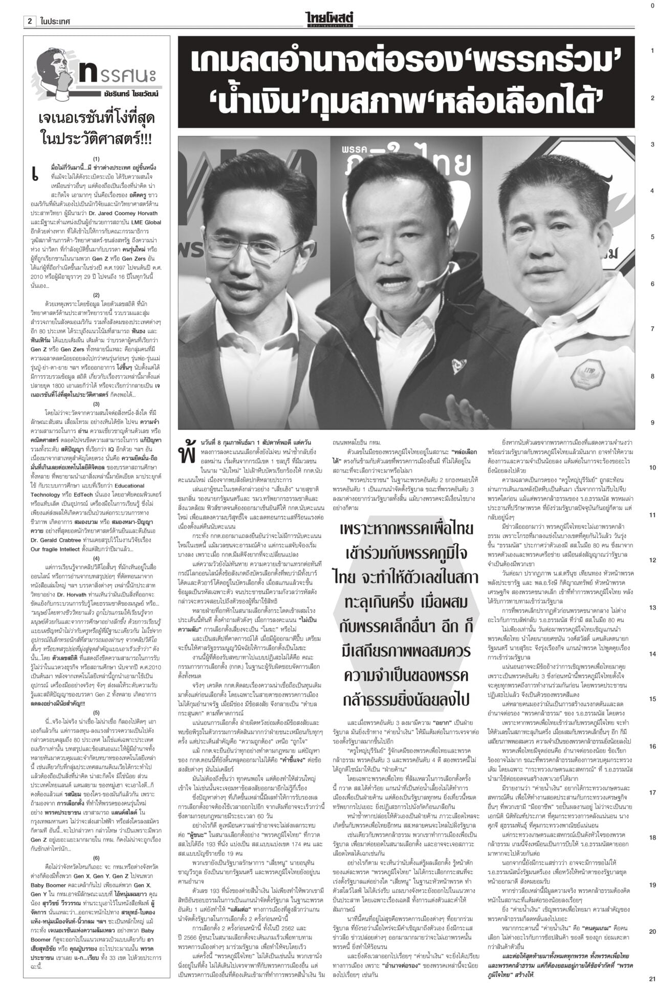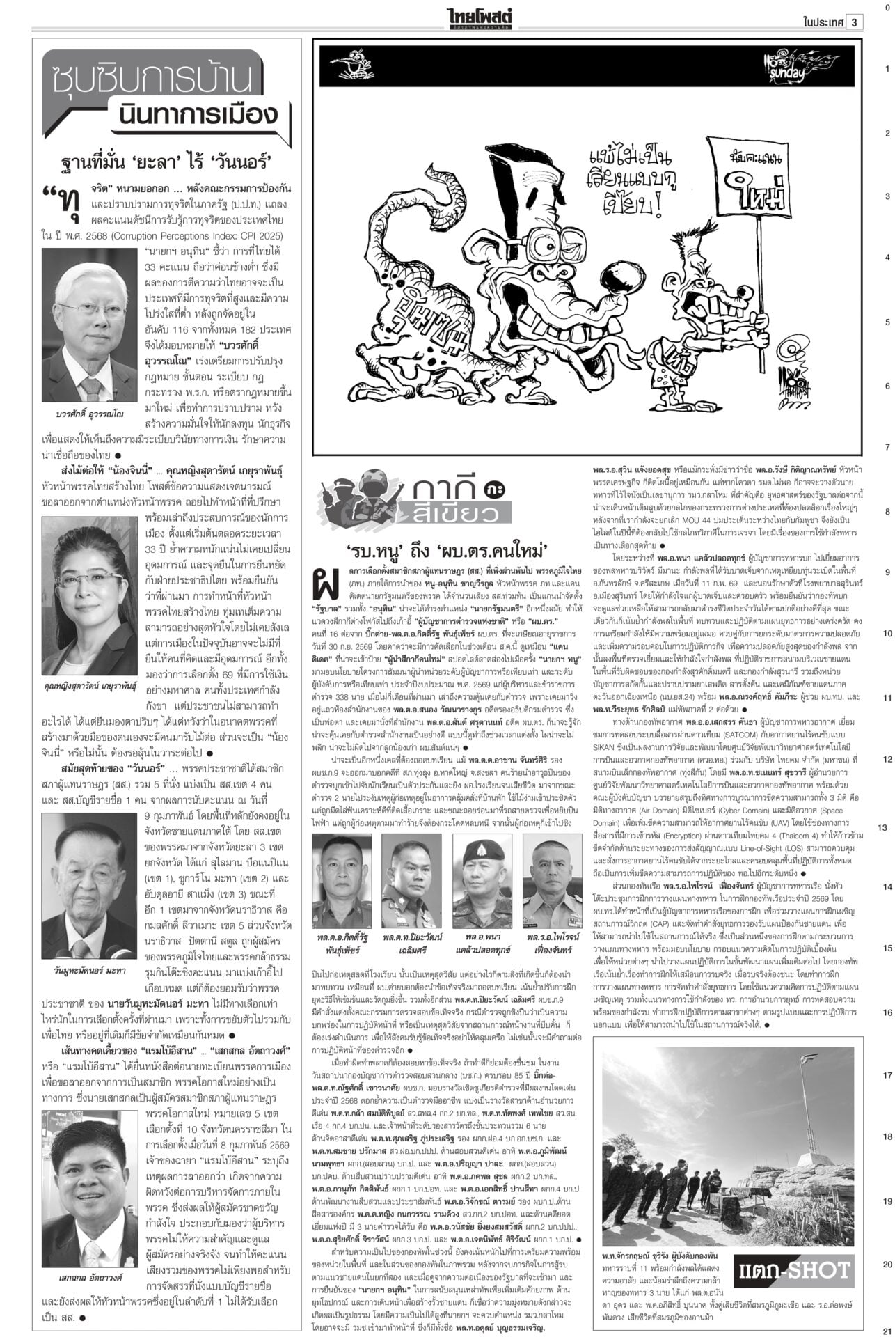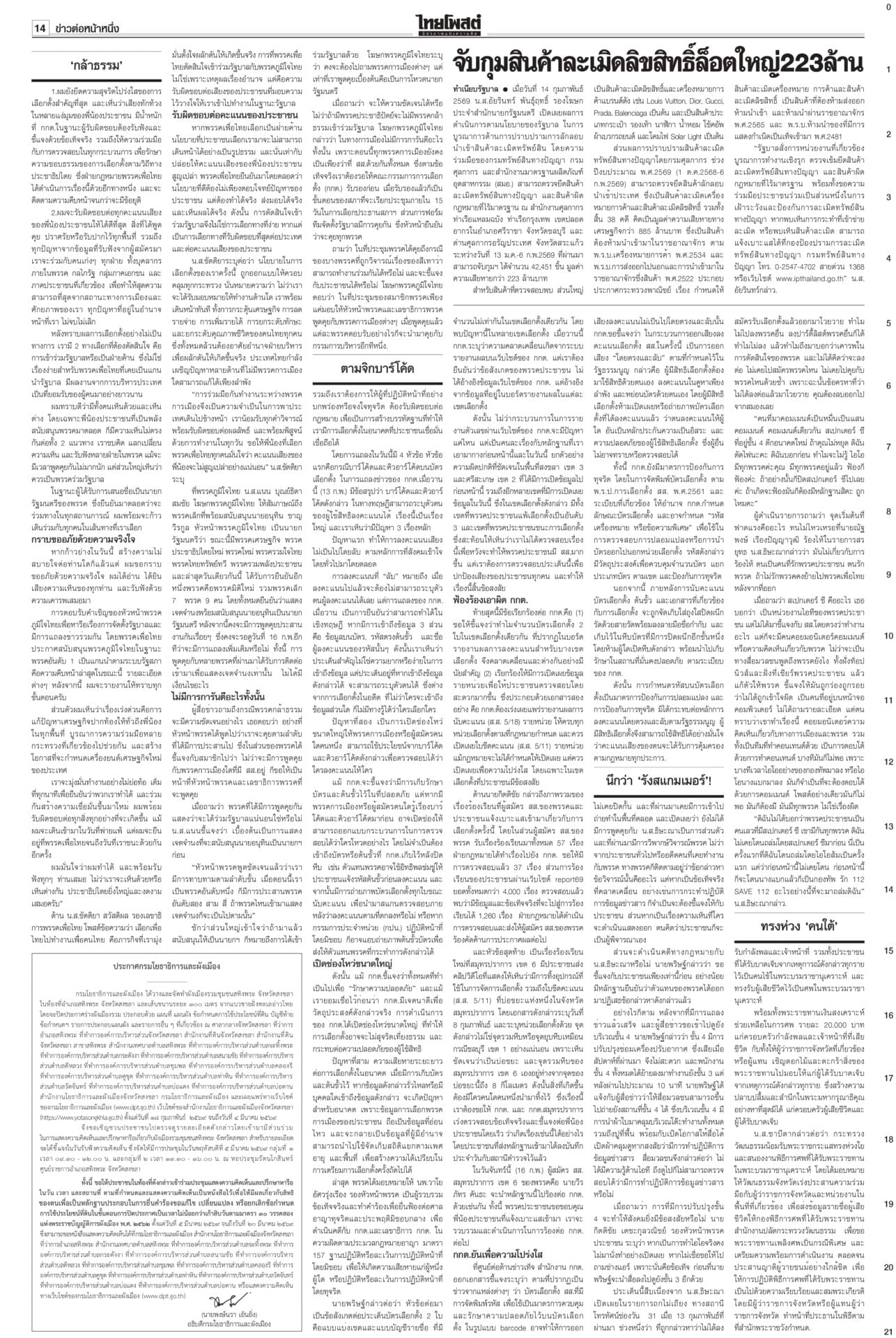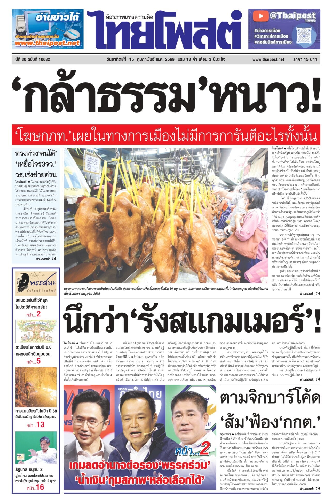หนังสือพิมพ์ฉบับวันที่ 15 กุมภาพันธ์ 2569ข่าวหน้าหนึ่งทรงห่วง‘คนใต้’ ‘เหยื่อโจร3จว.’ วธ.เร่งช่วยด่วนในหลวงทรงรับผู้ได้รับบาดเจ็บ-ผู้เสียชีวิตจากเหตุการณ์ความไม่สงบชายแดนใต้ ไว้ในพระบรมราชานุเคราะห์ ขณะที่ วธ.เร่งดำเนินการตามพระราชกระแสอย่างเร่งด่วนและครบถ้วน นึกว่า‘รังสแกมเมอร์’!“ไอติม” ดิ้น! แก้ข่าว “สเปกเตอร์ ซี” ไอโอสีส้ม เจอพิรุธเพียบ! ยอมรับเป็นบริษัทของเลขาฯ พรรค แต่ไม่ได้ปฏิบัติการข้อมูลข่าวสาร เผยชั้น 4 ที่ทำการพรรคเป็นที่ทำการของพนักงานประจำ ตามจิกบาร์โค้ด ‘ส้ม’ฟ้อง‘กกต.’ยังไม่ยอมแพ้ พรรคประชาชนชี้การมีบาร์โค้ด-คิวอาร์โค้ดบนบัตรเลือกตั้ง ทำลายหลักลงคะแนนโดยลับ-เปิดช่องทุจริต จี้ กกต.เร่งเปิดรายงานผลการนับคะแนนทุกหน่วย ‘กล้าธรรม’หนาว! ‘โฆษกภท.’เผยในทางการเมืองไม่มีการการันตีอะไรทั้งนั้นเพื่อไทยชักแม่น้ำทั้ง 5 รองรับการเข้าร่วมรัฐบาลอนุทิน “ยศชนัน” ยอมรับไม่ใช่เรื่องง่าย กราบขออภัยจากใจ หลังมีทั้งคนเห็นด้วย-ไม่เห็นด้วย แต่ส่วนใหญ่บอกให้ร่วม