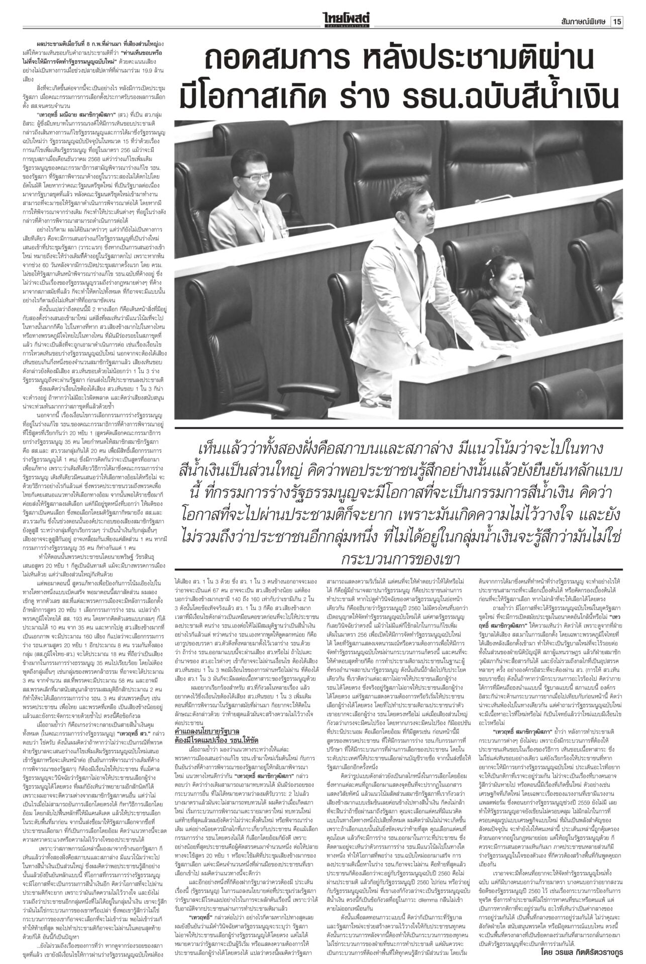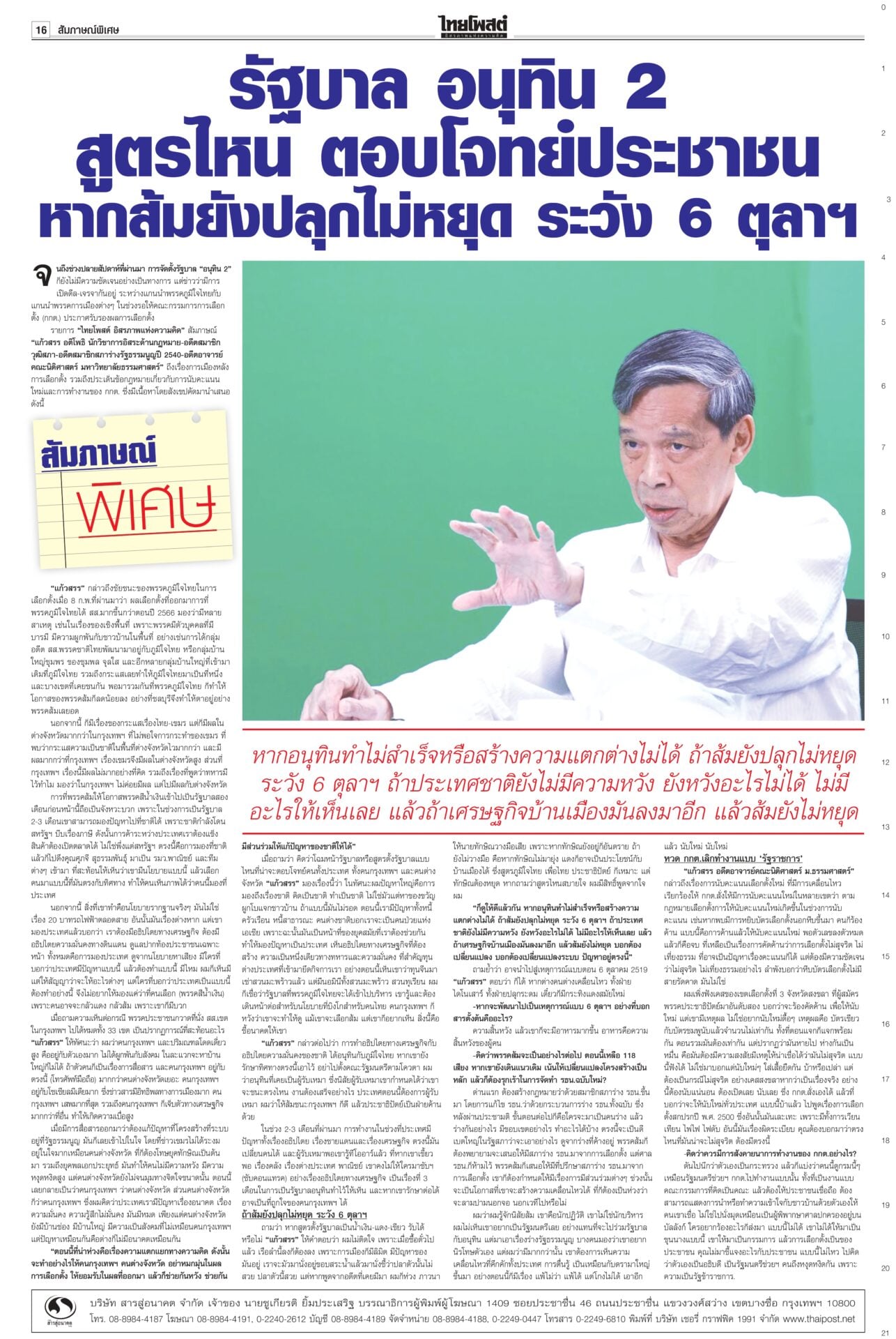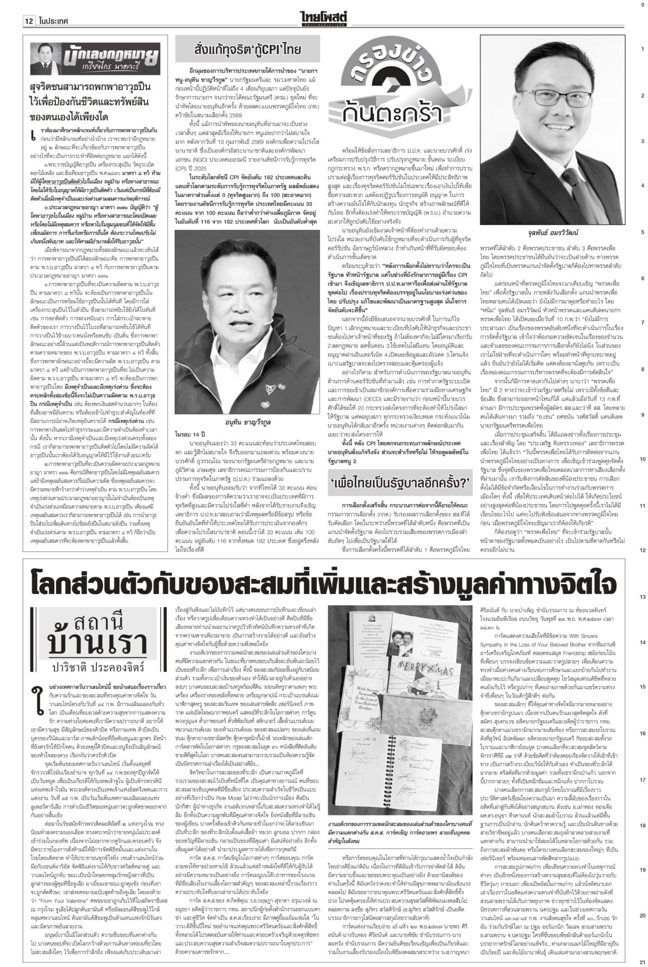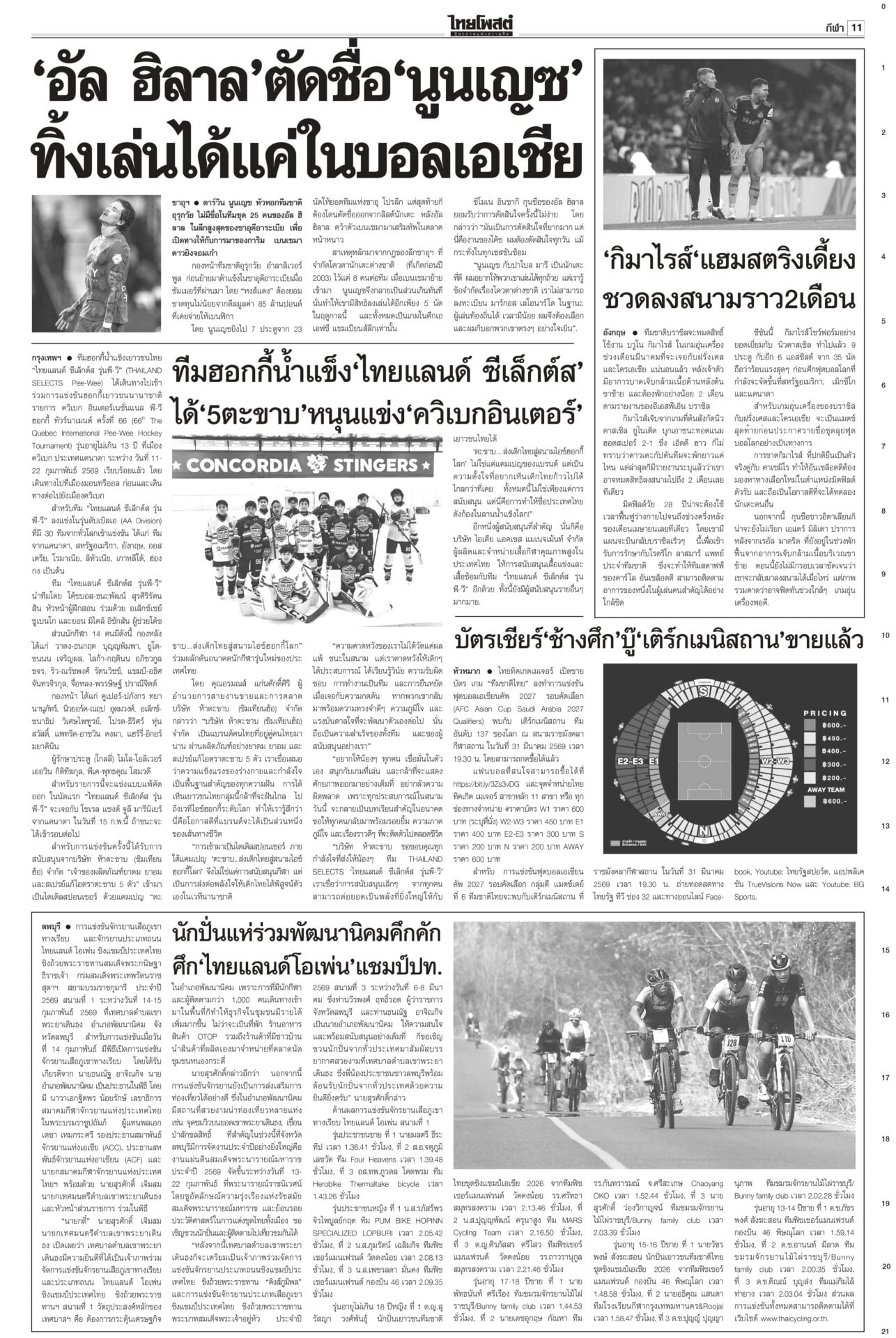 หนังสือพิมพ์ฉบับวันที่ 15 กุมภาพันธ์ 2569ข่าวหน้าหนึ่งทรงห่วง‘คนใต้’ ‘เหยื่อโจร3จว.’ วธ.เร่งช่วยด่วนในหลวงทรงรับผู้ได้รับบาดเจ็บ-ผู้เสียชีวิตจากเหตุการณ์ความไม่สงบชายแดนใต้ ไว้ในพระบรมราชานุเคราะห์ ขณะที่ วธ.เร่งดำเนินการตามพระราชกระแสอย่างเร่งด่วนและครบถ้วน นึกว่า‘รังสแกมเมอร์’!“ไอติม” ดิ้น! แก้ข่าว “สเปกเตอร์ ซี” ไอโอสีส้ม เจอพิรุธเพียบ! ยอมรับเป็นบริษัทของเลขาฯ พรรค แต่ไม่ได้ปฏิบัติการข้อมูลข่าวสาร เผยชั้น 4 ที่ทำการพรรคเป็นที่ทำการของพนักงานประจำ ตามจิกบาร์โค้ด ‘ส้ม’ฟ้อง‘กกต.’ยังไม่ยอมแพ้ พรรคประชาชนชี้การมีบาร์โค้ด-คิวอาร์โค้ดบนบัตรเลือกตั้ง ทำลายหลักลงคะแนนโดยลับ-เปิดช่องทุจริต จี้ กกต.เร่งเปิดรายงานผลการนับคะแนนทุกหน่วย ‘กล้าธรรม’หนาว! ‘โฆษกภท.’เผยในทางการเมืองไม่มีการการันตีอะไรทั้งนั้นเพื่อไทยชักแม่น้ำทั้ง 5 รองรับการเข้าร่วมรัฐบาลอนุทิน “ยศชนัน” ยอมรับไม่ใช่เรื่องง่าย กราบขออภัยจากใจ หลังมีทั้งคนเห็นด้วย-ไม่เห็นด้วย แต่ส่วนใหญ่บอกให้ร่วม