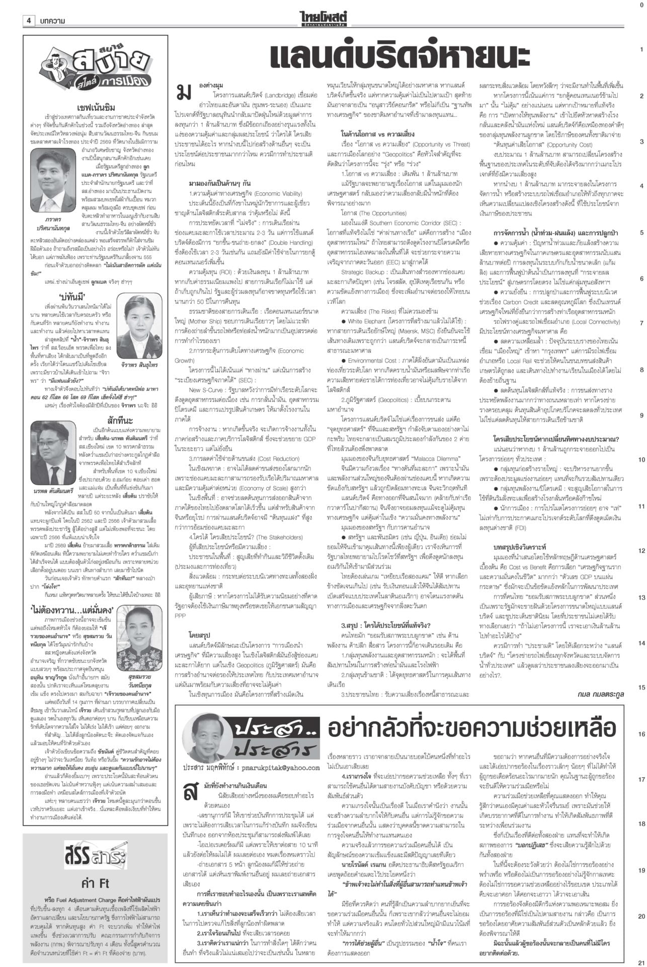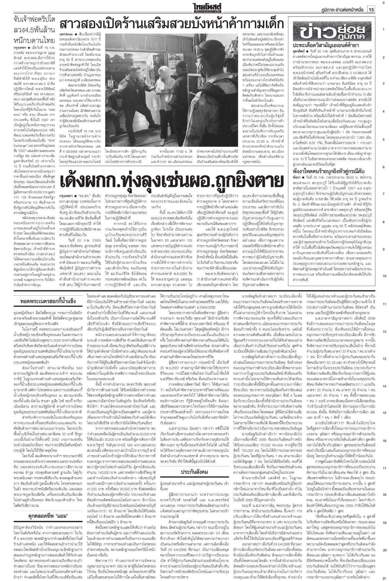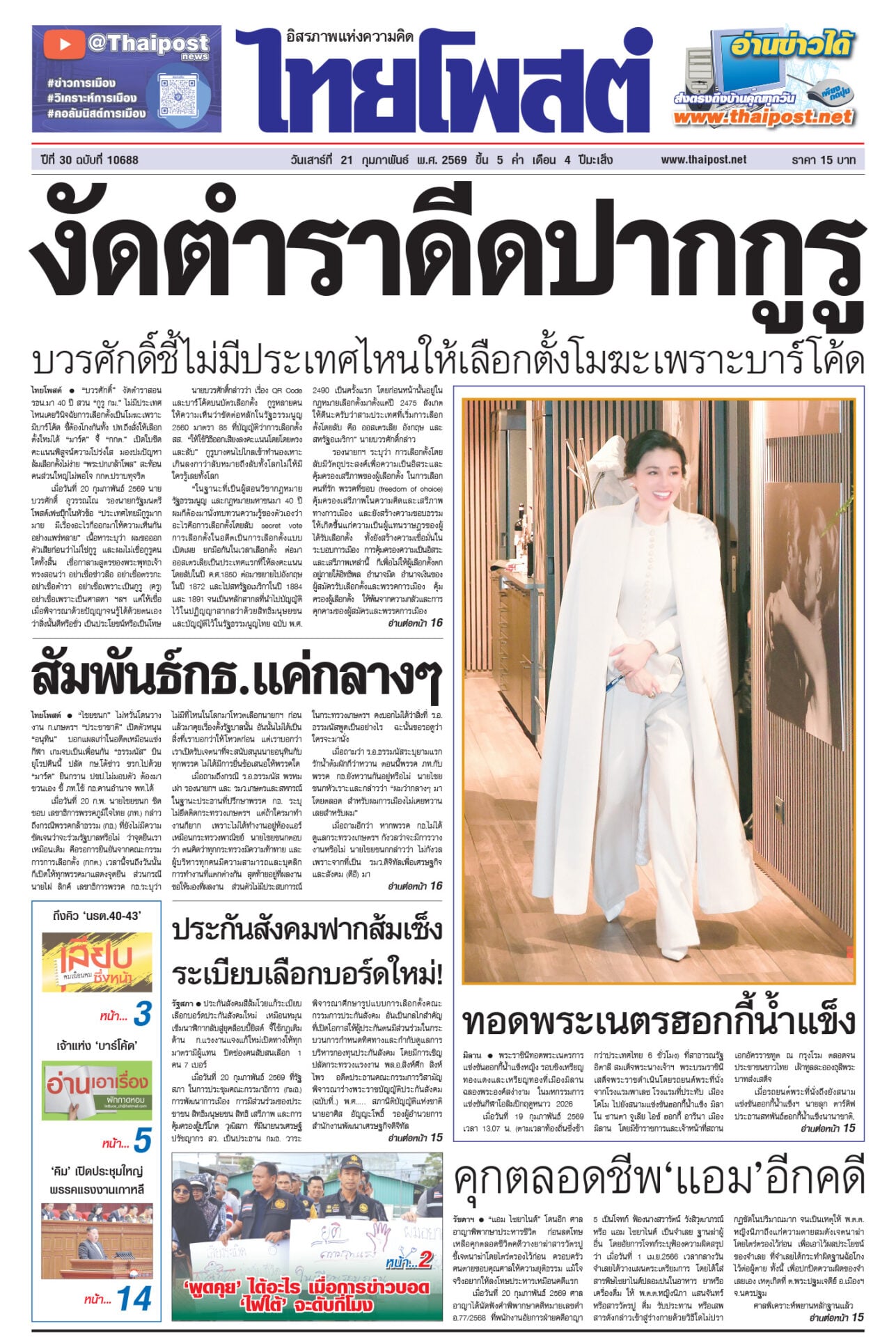 หนังสือพิมพ์ ฉบับวันที่ 21 กุมภาพันธ์ 2569ข่าวหน้าหนึ่งงัดตำราดีดปากกูรู บวรศักดิ์ชี้ไม่มีประเทศไหนให้เลือกตั้งโมฆะเพราะบาร์โค้ด“บวรศักดิ์” งัดตำรา สอน รธน.มา 40 ปี สวน “กูรู กม.” ไม่มีประเทศไหนเคยวินิจฉัยการเลือกตั้งเป็นโมฆะเพราะมีบาร์โค้ด สัมพันธ์กธ.แค่กลางๆ“ไชยชนก” ไม่หวั่นโดนวางงาน ก.เกษตรฯ “ประชาชาติ” เปิดตัวหนุน “อนุทิน” บอกแผลเก่าในอดีตเหมือนแข่งกีฬา ทอดพระเนตรฮอกกี้น้ำแข็งพระราชินีทอดพระเนตรการแข่งขันฮอกกี้น้ำแข็งหญิง รอบชิงเหรียญทองแดงและเหรียญทองที่เมืองมิลาน ฉลองพระองค์สง่างาม คุกตลอดชีพ‘แอม’อีกคดี“แอม ไซยาไนด์” โดนอีก ศาลอาญาพิพากษาประหารชีวิต ประกันสังคมฟากส้มเซ็ง ระเบียบเลือกบอร์ดใหม่!ประกันสังคมสีส้มโวยแก้ระเบียบเลือกบอร์ดประกันสังคมใหม่