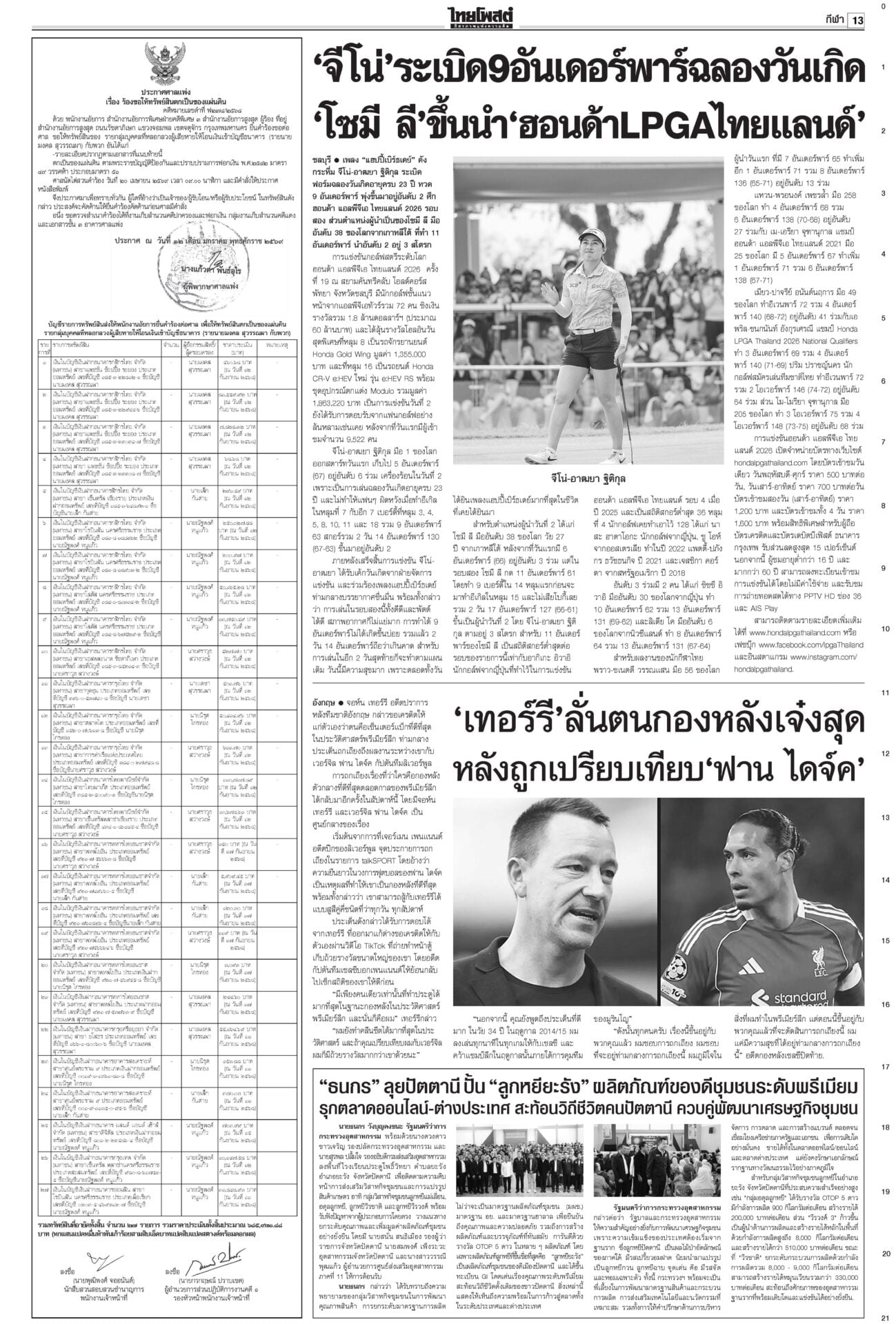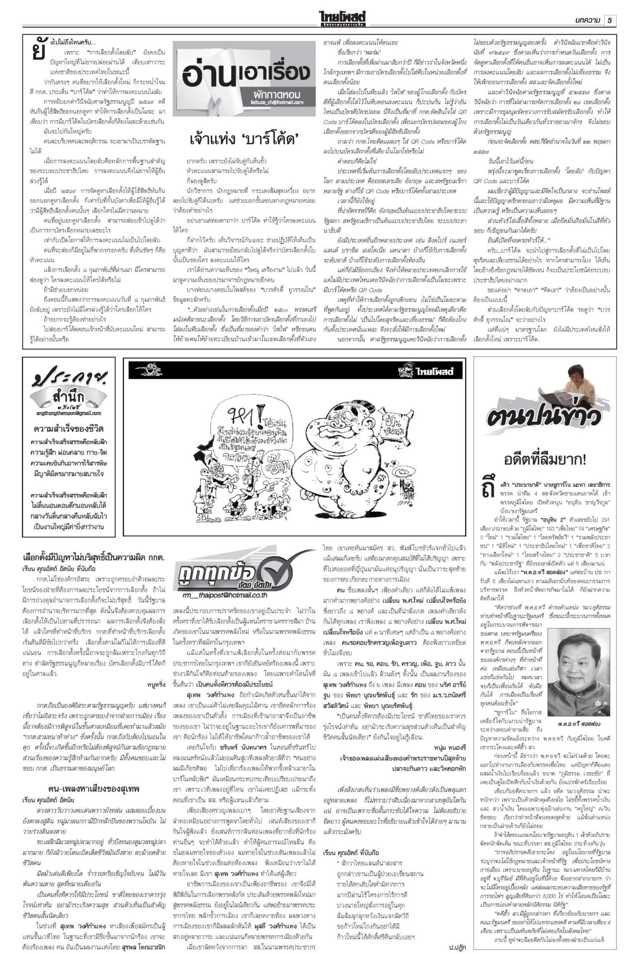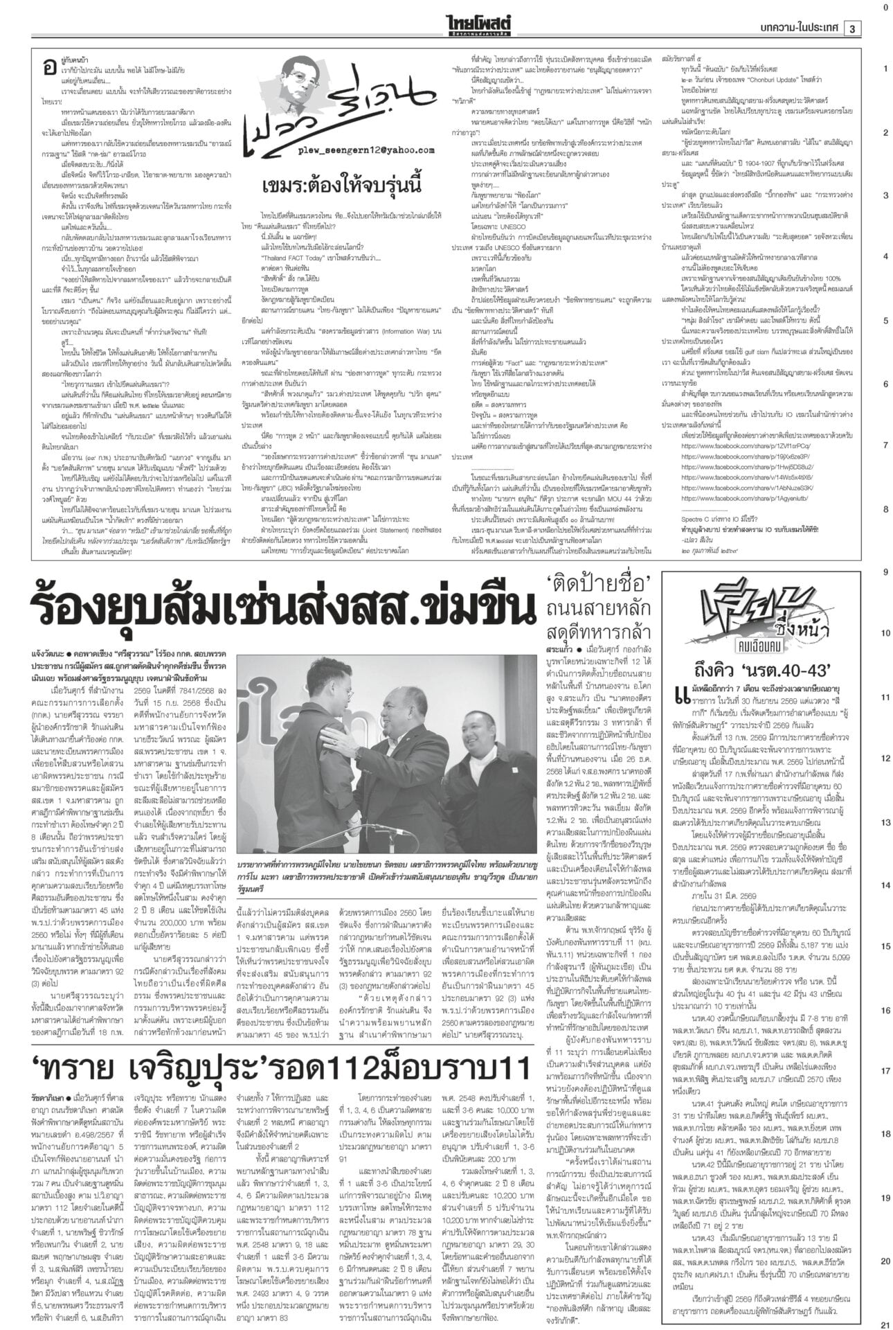 ฉบับวันที่ 21 กุมภาพันธ์ 2569 21 กุมภาพันธ์ 2569 เวลา 0:01 น. หนังสือพิมพ์ ฉบับวันที่ 21 กุมภาพันธ์ 2569ข่าวหน้าหนึ่งงัดตำราดีดปากกูรู บวรศักดิ์ชี้ไม่มีประเทศไหนให้เลือกตั้งโมฆะเพราะบาร์โค้ด“บวรศักดิ์” งัดตำรา สอน รธน.มา 40 ปี สวน “กูรู กม.” ไม่มีประเทศไหนเคยวินิจฉัยการเลือกตั้งเป็นโมฆะเพราะมีบาร์โค้ด สัมพันธ์กธ.แค่กลางๆ“ไชยชนก” ไม่หวั่นโดนวางงาน ก.เกษตรฯ “ประชาชาติ” เปิดตัวหนุน “อนุทิน” บอกแผลเก่าในอดีตเหมือนแข่งกีฬา ทอดพระเนตรฮอกกี้น้ำแข็งพระราชินีทอดพระเนตรการแข่งขันฮอกกี้น้ำแข็งหญิง รอบชิงเหรียญทองแดงและเหรียญทองที่เมืองมิลาน ฉลองพระองค์สง่างาม คุกตลอดชีพ‘แอม’อีกคดี“แอม ไซยาไนด์” โดนอีก ศาลอาญาพิพากษาประหารชีวิต ประกันสังคมฟากส้มเซ็ง ระเบียบเลือกบอร์ดใหม่!ประกันสังคมสีส้มโวยแก้ระเบียบเลือกบอร์ดประกันสังคมใหม่ Tagsรายวันหนังสือพิมพ์ ข่าวที่เกี่ยวข้อง ฉบับวันที่ 20 กุมภาพันธ์ 2569 ฉบับวันที่ 19 กุมภาพันธ์ 2569 ฉบับวันที่ 18 กุมภาพันธ์ 2569 ฉบับวันที่ 17 กุมภาพันธ์ 2569 ฉบับวันที่ 16 กุมภาพันธ์ 2569 ฉบับวันที่ 15 กุมภาพันธ์ 2569 ฉบับวันที่ 15 กุมภาพันธ์ 2569 NEWS UPDATE 23:11 น. ‘ปิยบุตร’ วิงวอน รมต.-สส.ชุดใหม่ นิรโทษฯคดีการเมือง รวมมาตรา 112 22:21 น. โปรดเกล้าฯ ให้ถอดยศตำรวจ 3 ราย และเรียกคืนเครื่องราชฯ 21:52 น. กรมอุตุฯประกาศ 22 ก.พ. ไทยเข้าฤดูร้อน คาดสิ้นสุดกลางพฤษภาคม 20:58 น. ผู้ตรวจการแผ่นดิน อนุญาต กกต. ขยายเวลาชี้แจงบาร์โค้ดบัตรเลือกตั้งออกไปอีก 7 วัน 20:36 น. ‘ไอซ์ รักชนก’ ทำใจชวดตำแหน่งรัฐมนตรี เล็งประธานกมธ.แรงงาน