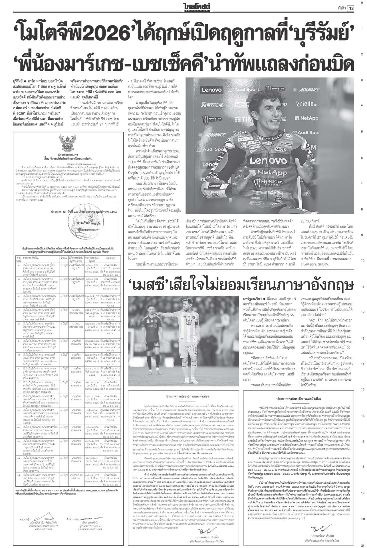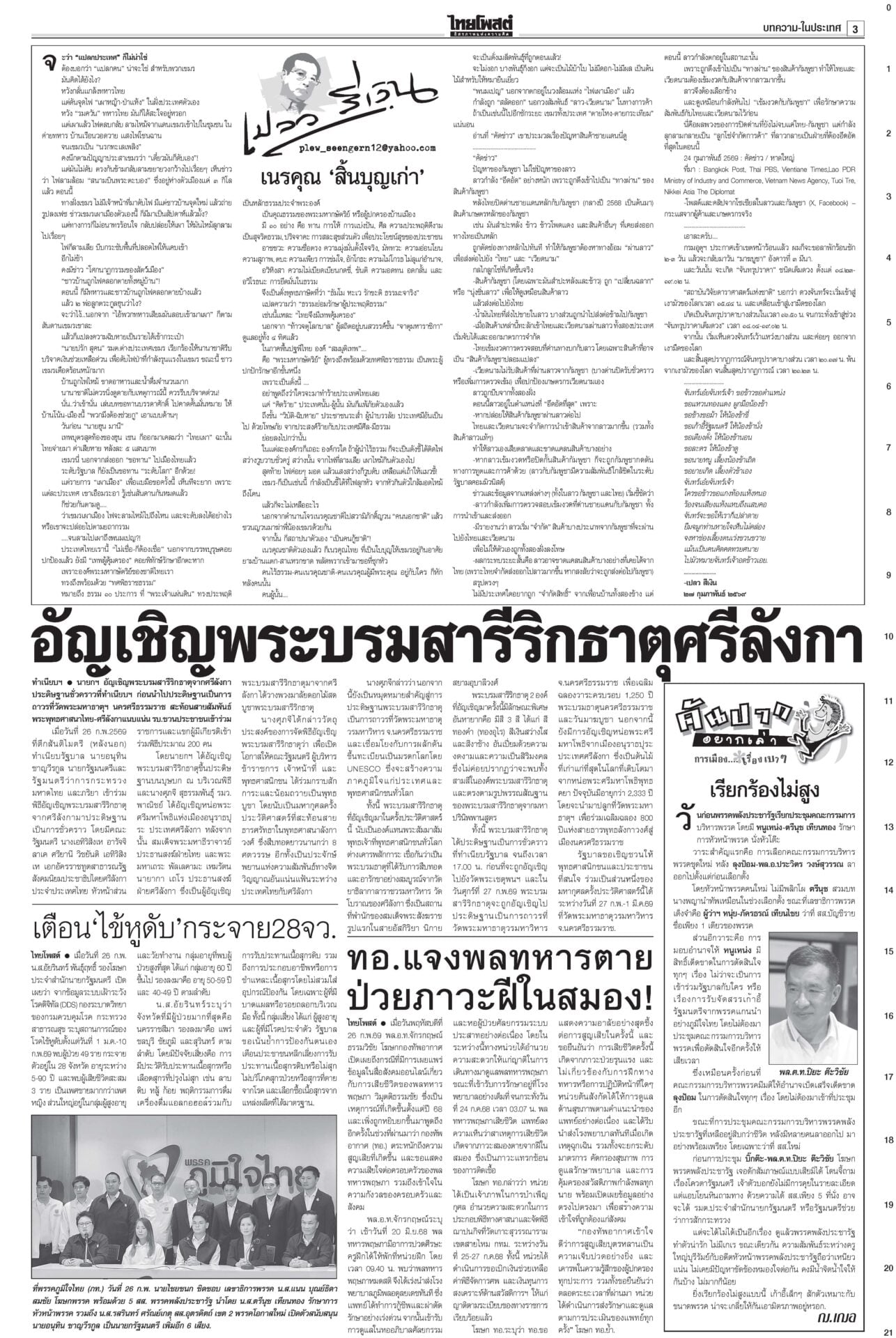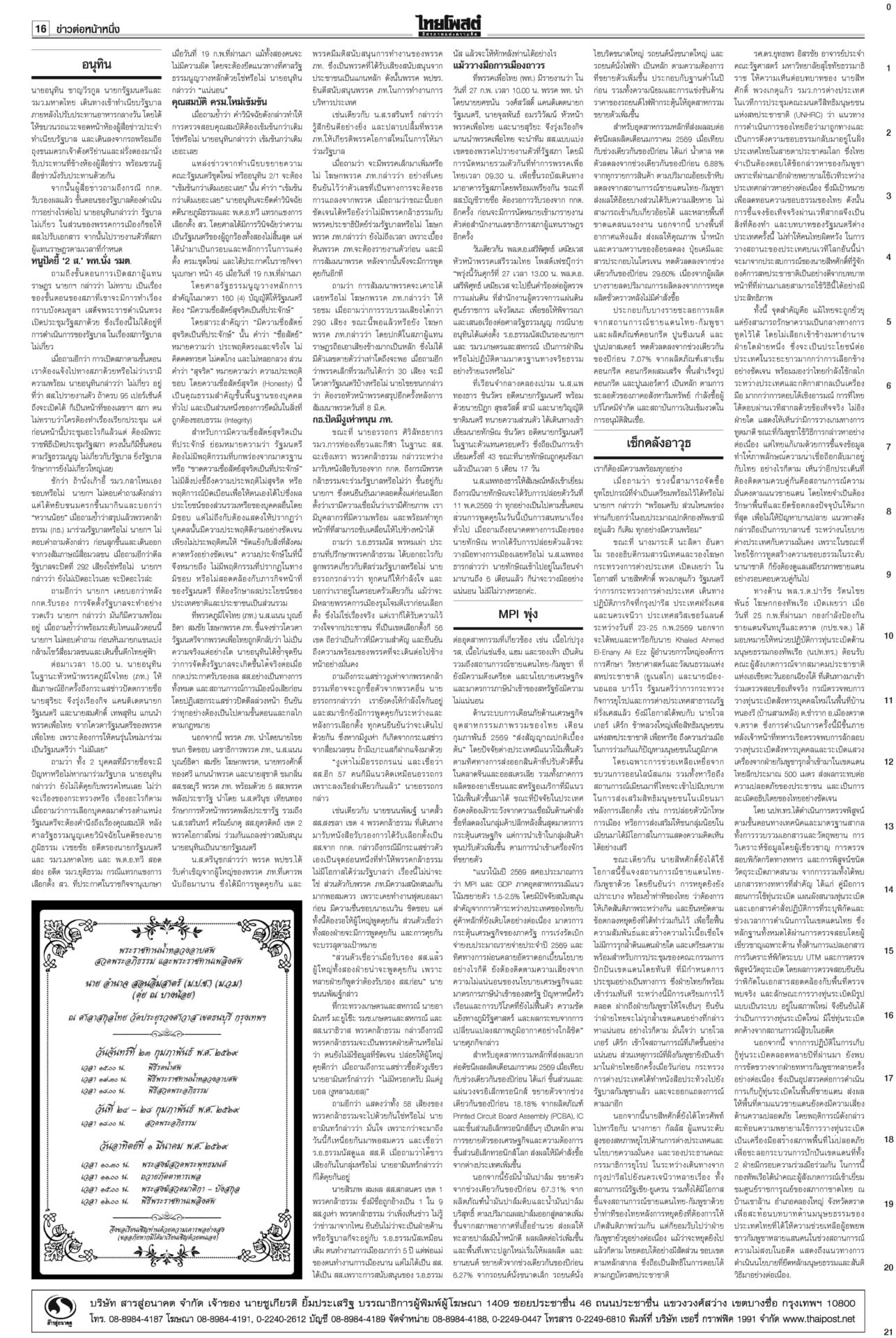 หนังสือพิมพ์ ฉบับวันที่ 27 กุมภาพันธ์ 2569ข่าวหน้าหนึ่งอนุทิน2ต้องไร้สีเทา ตรวจเข้มคุณสมบัติรมต. ยึดบรรทัดฐานศาลรธน.“สส.ใหม่” คึกคักรับหนังสือรับรอง กกต.วันแรก 141 คน เข้ารายงานตัวสภา 47 คน เช็กคลังอาวุธเตรียมพร้อม“อนุทิน” ไม่ประมาทเช็กคลังอาวุธกองทัพรับมือเหตุไม่คาดฝันชายแดน ‘สภาสูง’ตีตก‘มณฑล’ โหวต‘จิรุตม์’กกต.ใหม่วุฒิสภาเห็นชอบ “จิรุตม์ วิศาลวิจิตร” นั่ง กกต.ใหม่ ส่วน “มณฑล สุดประเสริฐ” อด สว.สองขั้วปะทะเดือด กกต.แจ้งจับ6คน ปชน.ฟ้อง‘7เสือ’“ไอติม-สมชัย-นักไอที-ช่างภาพสื่อ” รวม 6 ราย โดน กกต.จัดหนัก MPIพุ่ง1.46% ผลพวงส่งออก การเลือกตั้งสส.สศอ.เผยดัชนีผลผลิตอุตสาหกรรม-MPI เดือน ม.ค.69 อยู่ที่ระดับ 101.58 ขยายตัว 1.46%