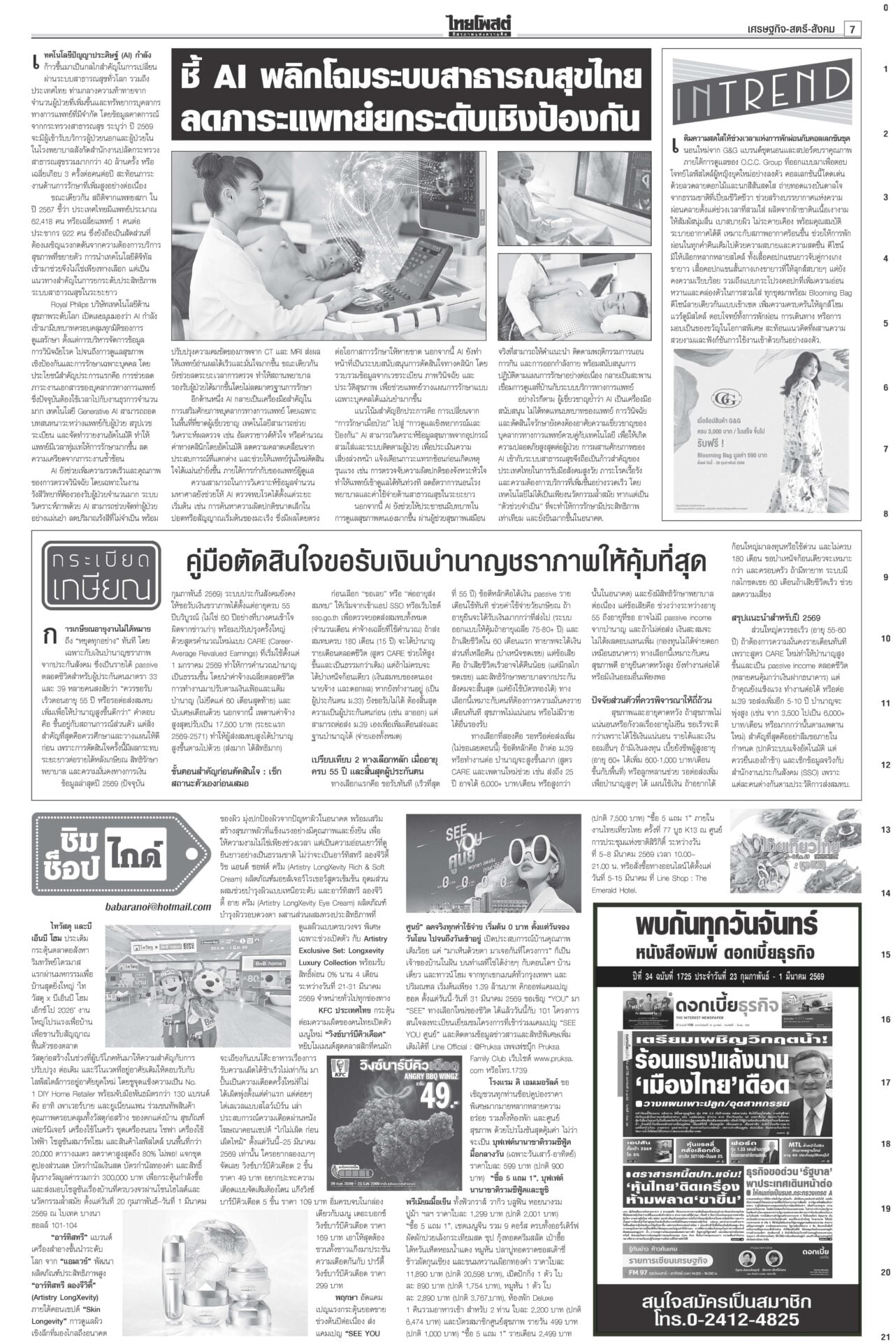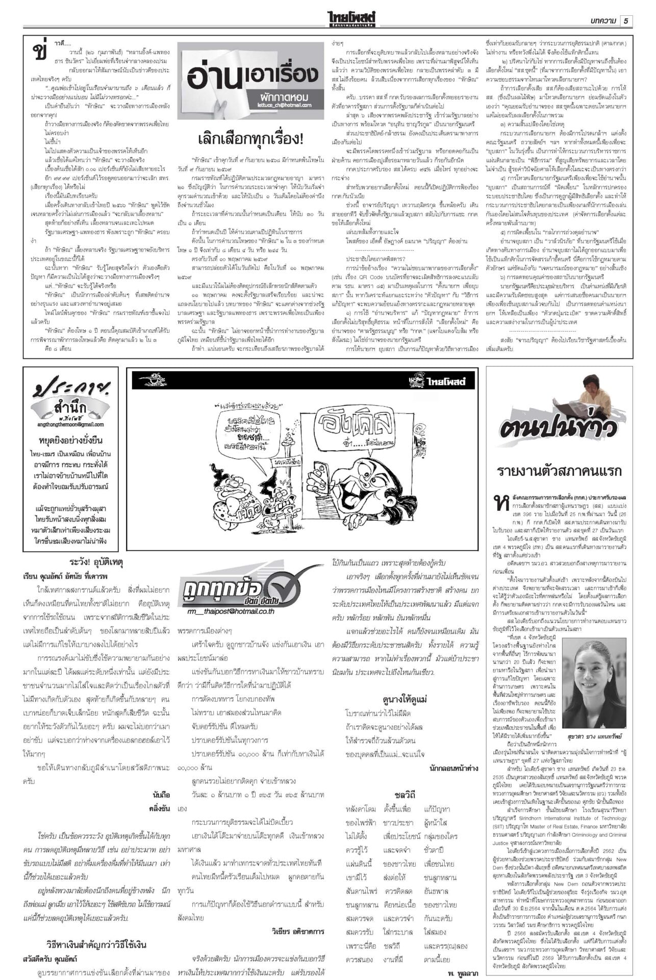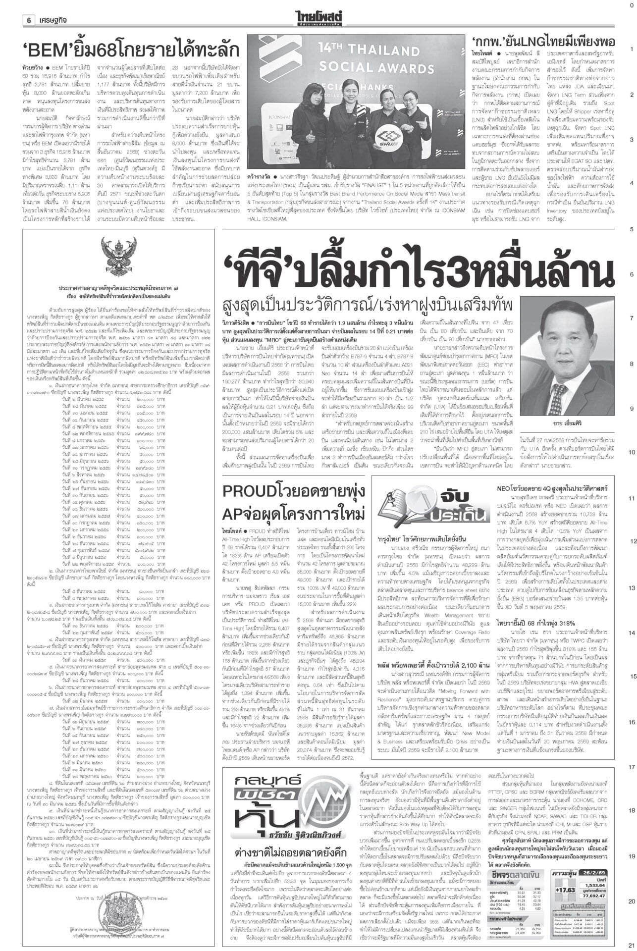 หนังสือพิมพ์ ฉบับวันที่ 27 กุมภาพันธ์ 2569ข่าวหน้าหนึ่งอนุทิน2ต้องไร้สีเทา ตรวจเข้มคุณสมบัติรมต. ยึดบรรทัดฐานศาลรธน.“สส.ใหม่” คึกคักรับหนังสือรับรอง กกต.วันแรก 141 คน เข้ารายงานตัวสภา 47 คน เช็กคลังอาวุธเตรียมพร้อม“อนุทิน” ไม่ประมาทเช็กคลังอาวุธกองทัพรับมือเหตุไม่คาดฝันชายแดน ‘สภาสูง’ตีตก‘มณฑล’ โหวต‘จิรุตม์’กกต.ใหม่วุฒิสภาเห็นชอบ “จิรุตม์ วิศาลวิจิตร” นั่ง กกต.ใหม่ ส่วน “มณฑล สุดประเสริฐ” อด สว.สองขั้วปะทะเดือด กกต.แจ้งจับ6คน ปชน.ฟ้อง‘7เสือ’“ไอติม-สมชัย-นักไอที-ช่างภาพสื่อ” รวม 6 ราย โดน กกต.จัดหนัก MPIพุ่ง1.46% ผลพวงส่งออก การเลือกตั้งสส.สศอ.เผยดัชนีผลผลิตอุตสาหกรรม-MPI เดือน ม.ค.69 อยู่ที่ระดับ 101.58 ขยายตัว 1.46%