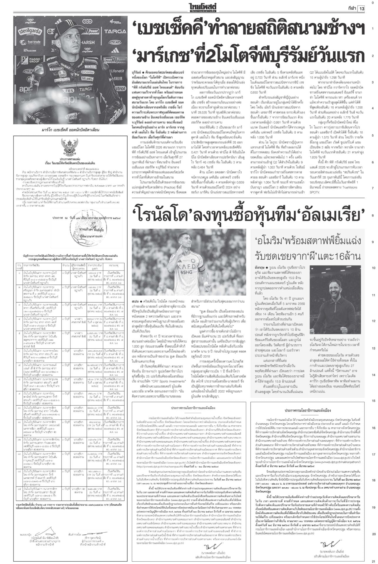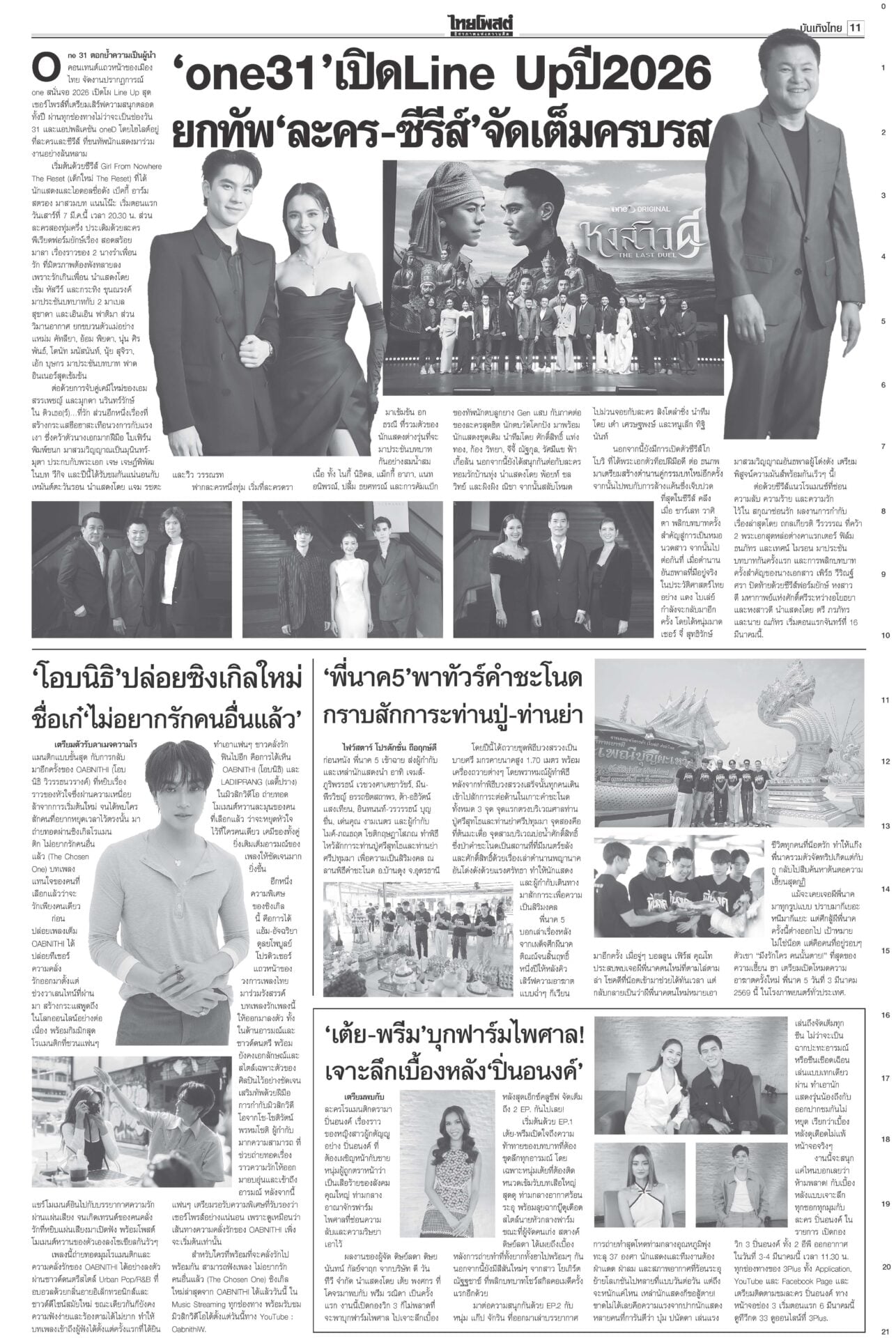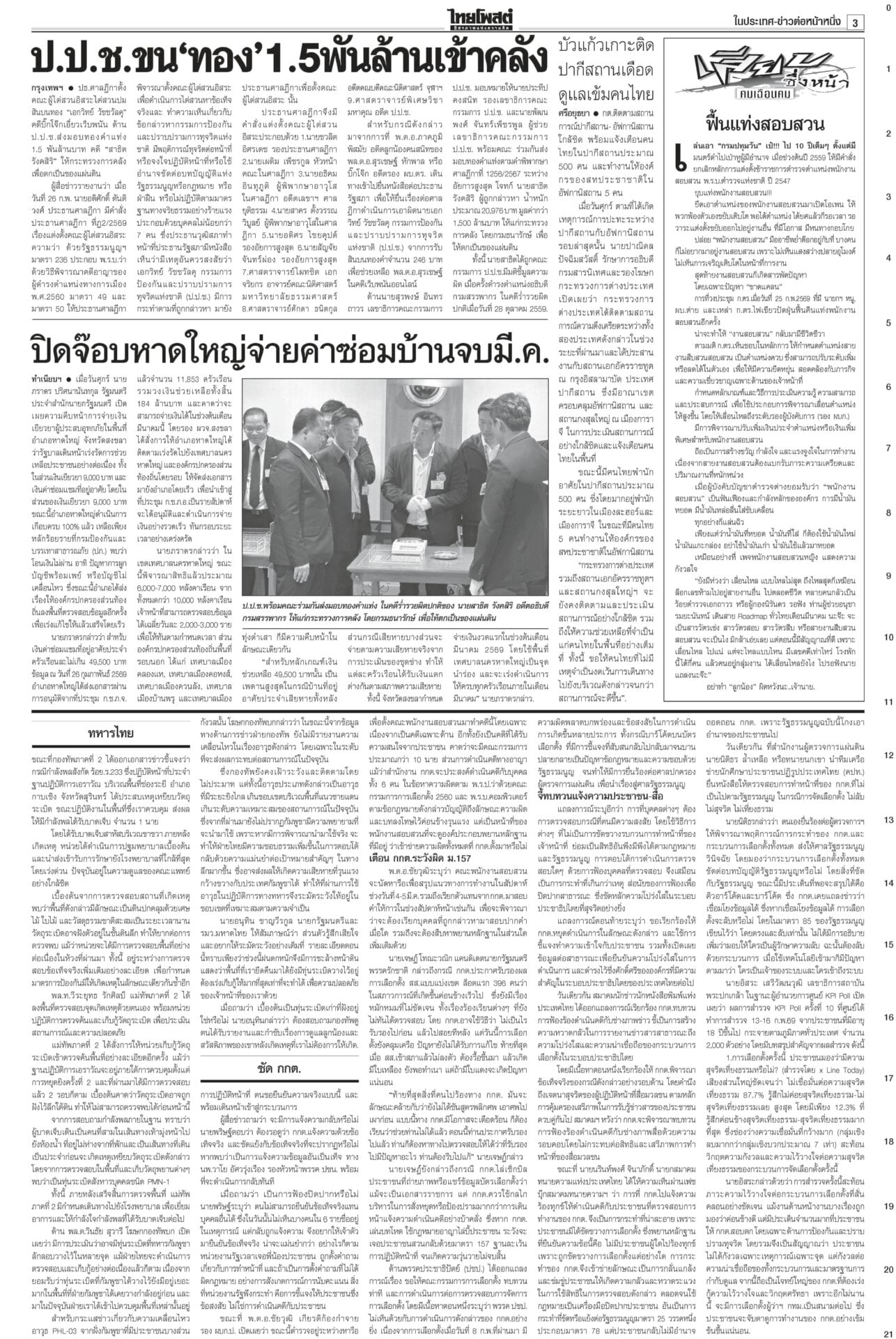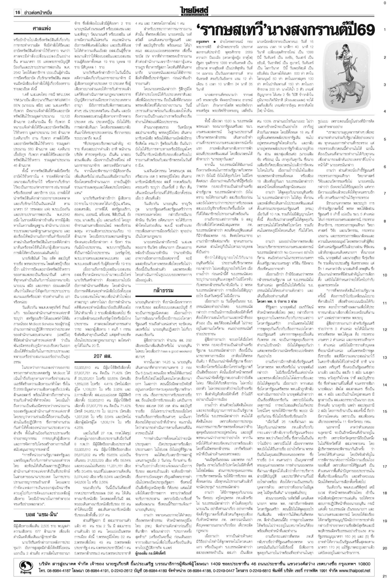 หนังสือพิมพ์ ฉบับวันที่ 28 กุมภาพันธ์ 2569ข่าวหน้าหนึ่งกล้าธรรมมีศักดิ์ศรี ‘ธรรมนัส’โวไม่เข้าหาใครก่อน/พท.ยํ้าส่ง‘2ส.’นั่งรัฐมนตรี“อนุทิน” ยังกั๊ก “กล้าธรรม” ร่วมรัฐบาลหรือไม่ บอกรอรับรอง สส.ทั้งหมดก่อน ซัดกกต.ฟ้องปิดปากตรวจสอบ“ไอติม” เข้าพบ ตร. สู้คดี กกต.เอาผิดปมบัตรเลือกตั้ง “เจษฎ์” เตือนรับรองไปก่อนสอยทีหลังระวัง ม.157 “ปชป.” บอส‘แซม-มิน’ติดบ่วง อสส.ฟัน‘คดีดิไอคอน’ดีเอสไอ-อัยการสูงสุดลุยคดีดิไอคอน ขยายผลผู้เสียหาย 13 ประเทศ ทหารไทยขาขาดรายที่13 ‘ทบ.’เชื่อเขมรแอบซุกอื้อ!พลทหารเหยียบกับระเบิดในฐานเอราวัณ ขาขาดเป็นรายที่ 13 แล้ว ศาลแพ่งไฟเขียว สั่ง‘อายัด’ทรัพย์! แก๊ง‘สแกมเมอร์’“ปปง.” เผยศาลแพ่งมีคำสั่งให้ยึดและอายัดทรัพย์สิน 4 คดีดัง “ยิม เลียก-เบน สมิธ-เฉิน จื้อ-ก๊ก อาน-เอื้ออังกูร” มูลค่ารวมกว่า 13,074 ล้านบาท 207สส.รับหนังสือรับรองกกต.เผยยอดผู้มาใช้สิทธิเลือกตั้ง 8 ก.พ. กว่า 37.8 ล้านคน คิดเป็น 71.42%