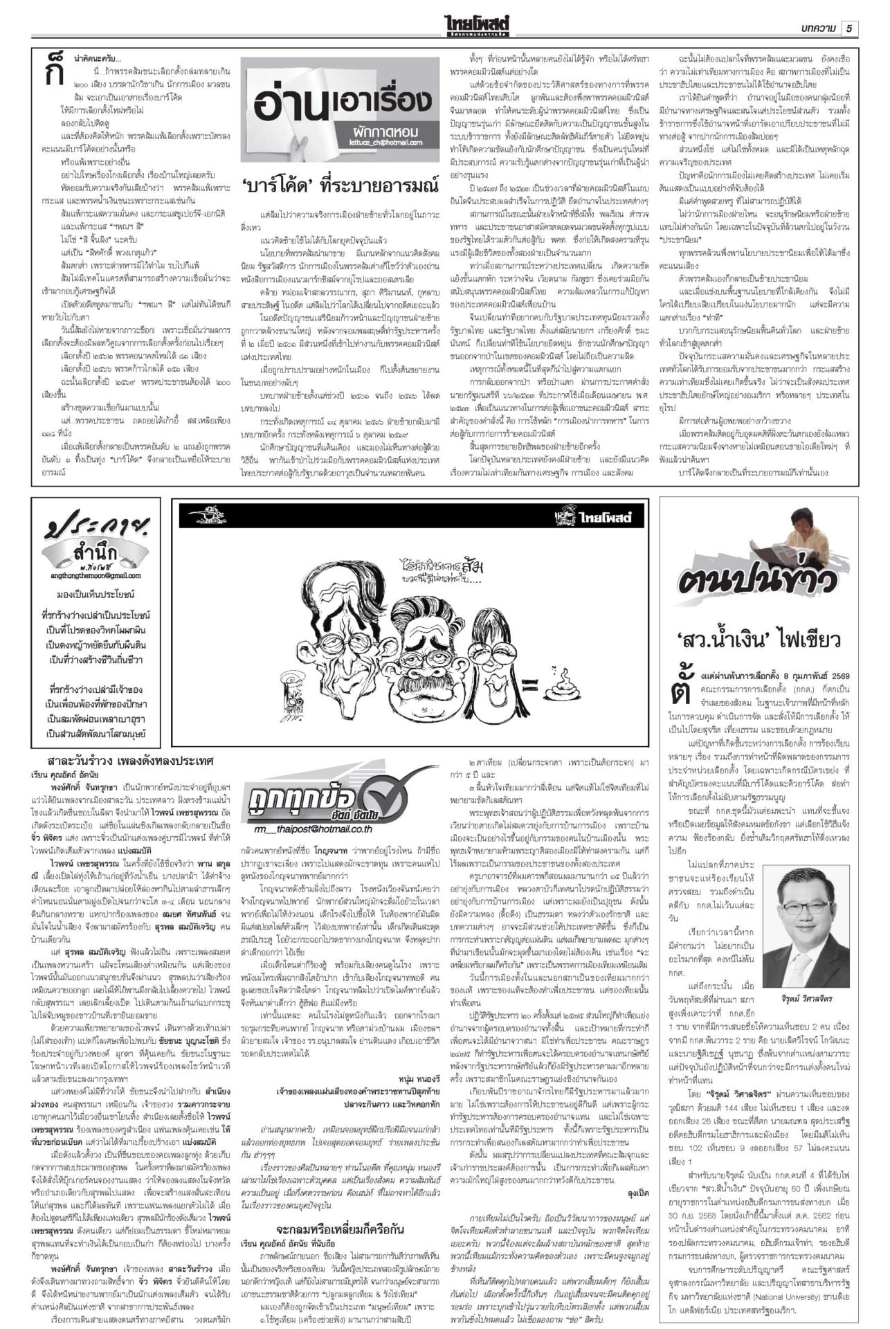 ฉบับวันที่ 28 กุมภาพันธ์ 2569 28 กุมภาพันธ์ 2569 เวลา 0:01 น. หนังสือพิมพ์ ฉบับวันที่ 28 กุมภาพันธ์ 2569ข่าวหน้าหนึ่งกล้าธรรมมีศักดิ์ศรี ‘ธรรมนัส’โวไม่เข้าหาใครก่อน/พท.ยํ้าส่ง‘2ส.’นั่งรัฐมนตรี“อนุทิน” ยังกั๊ก “กล้าธรรม” ร่วมรัฐบาลหรือไม่ บอกรอรับรอง สส.ทั้งหมดก่อน ซัดกกต.ฟ้องปิดปากตรวจสอบ“ไอติม” เข้าพบ ตร. สู้คดี กกต.เอาผิดปมบัตรเลือกตั้ง “เจษฎ์” เตือนรับรองไปก่อนสอยทีหลังระวัง ม.157 “ปชป.” บอส‘แซม-มิน’ติดบ่วง อสส.ฟัน‘คดีดิไอคอน’ดีเอสไอ-อัยการสูงสุดลุยคดีดิไอคอน ขยายผลผู้เสียหาย 13 ประเทศ ทหารไทยขาขาดรายที่13 ‘ทบ.’เชื่อเขมรแอบซุกอื้อ!พลทหารเหยียบกับระเบิดในฐานเอราวัณ ขาขาดเป็นรายที่ 13 แล้ว ศาลแพ่งไฟเขียว สั่ง‘อายัด’ทรัพย์! แก๊ง‘สแกมเมอร์’“ปปง.” เผยศาลแพ่งมีคำสั่งให้ยึดและอายัดทรัพย์สิน 4 คดีดัง “ยิม เลียก-เบน สมิธ-เฉิน จื้อ-ก๊ก อาน-เอื้ออังกูร” มูลค่ารวมกว่า 13,074 ล้านบาท 207สส.รับหนังสือรับรองกกต.เผยยอดผู้มาใช้สิทธิเลือกตั้ง 8 ก.พ. กว่า 37.8 ล้านคน คิดเป็น 71.42% Tagsรายวันหนังสือพิมพ์ ข่าวที่เกี่ยวข้อง ฉบับวันที่ 27 กุมภาพันธ์ 2569 ฉบับวันที่ 26 กุมภาพันธ์ 2569 ฉบับวันที่ 25 กุมภาพันธ์ 2569 ฉบับวันที่ 24 กุมภาพันธ์ 2569 ฉบับวันที่ 23 กุมภาพันธ์ 2569 ฉบับวันที่ 22 กุมภาพันธ์ 2569 ฉบับวันที่ 22 กุมภาพันธ์ 2569 NEWS UPDATE 23:25 น. สิ้น ‘ซัดดัมอีสาน‘ อดีต สส. มหาสารคาม 22:33 น. 'โอบนิธิ' ปล่อยซิงเกิล 'ไม่อยากรักคนอื่นแล้ว' 22:28 น. โปรดเกล้าฯ แต่งตั้งข้าราชการศาลยุติธรรมจำนวน 2 ราย 22:22 น. เต้ย-พรีม พาเจาะลึกเบื้องหลัง’ปิ่นอนงค์’ 21:58 น. ส.บอลฯจ่ายเงินสนับสนุน งวดที่3ฤดูกาล2568/69 ให้สโมสรไทยลีก1-3รวม99.25ล้าน