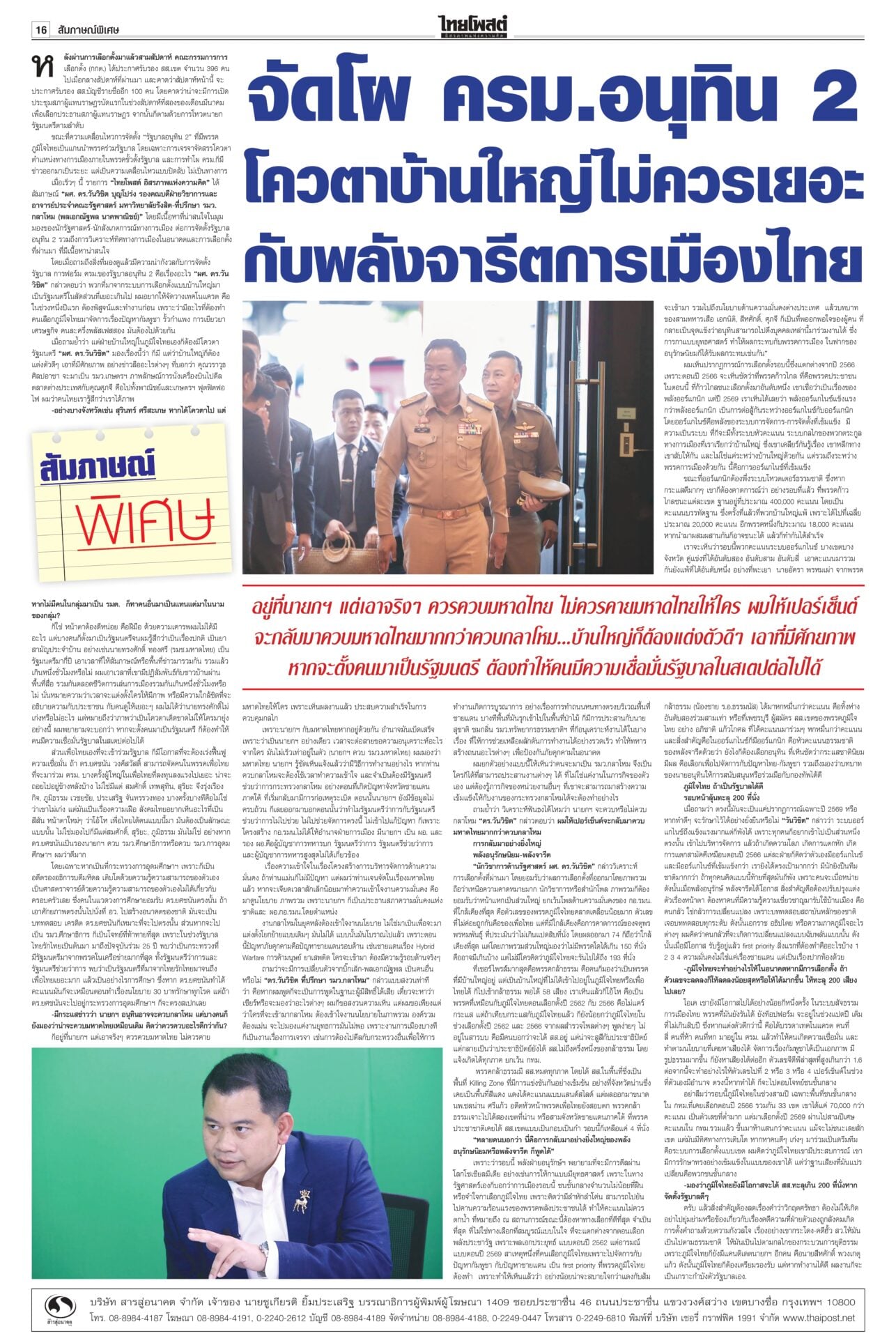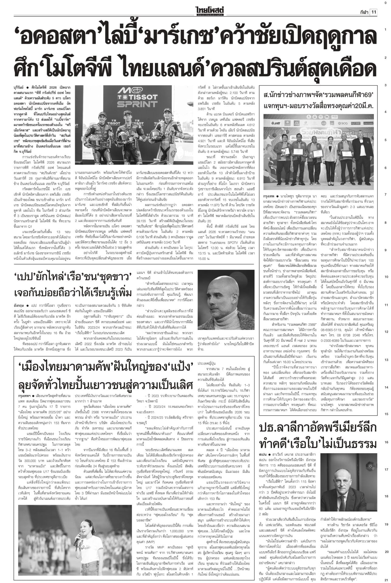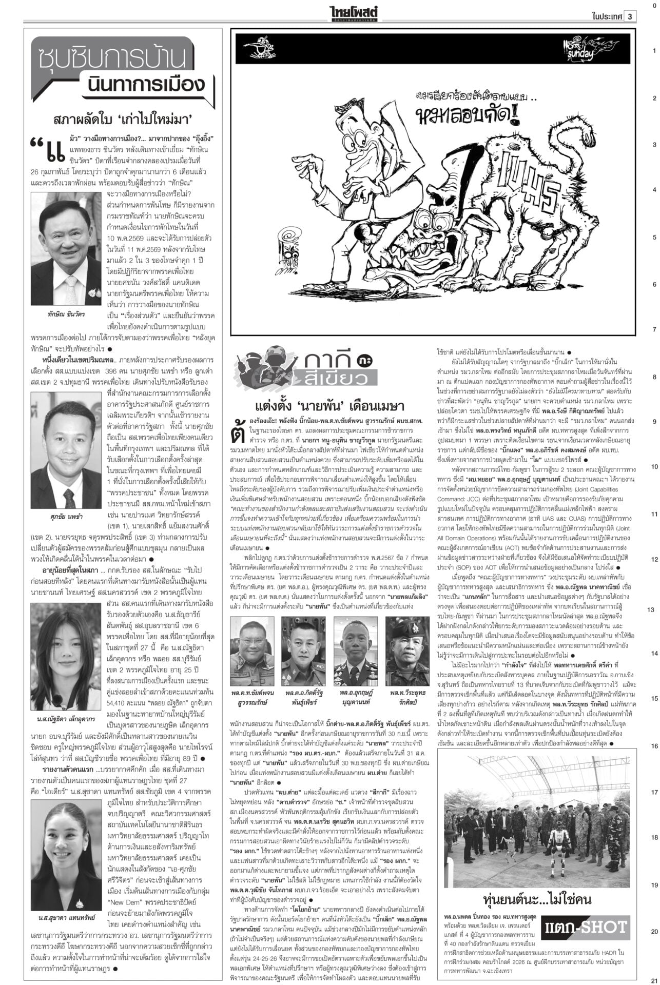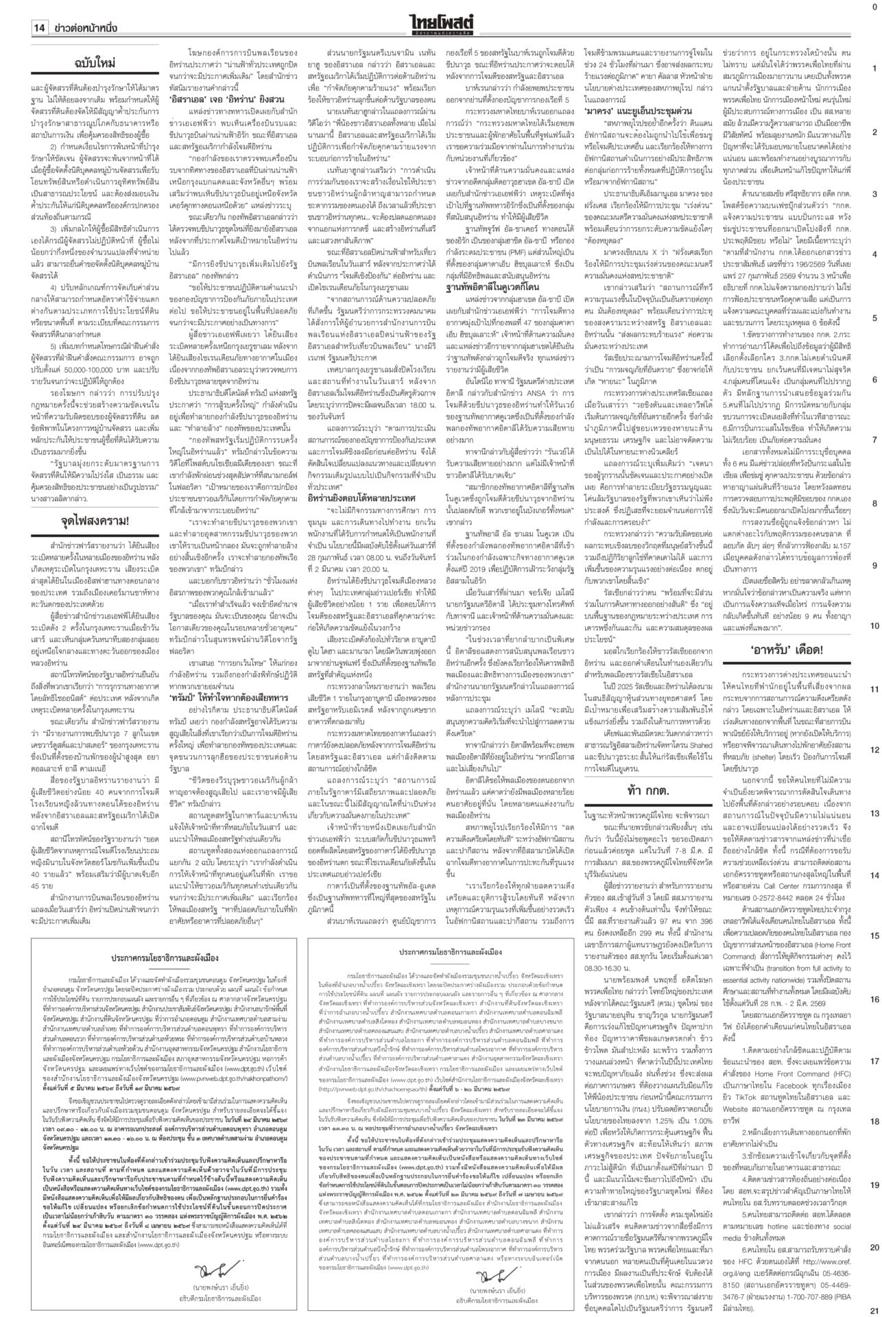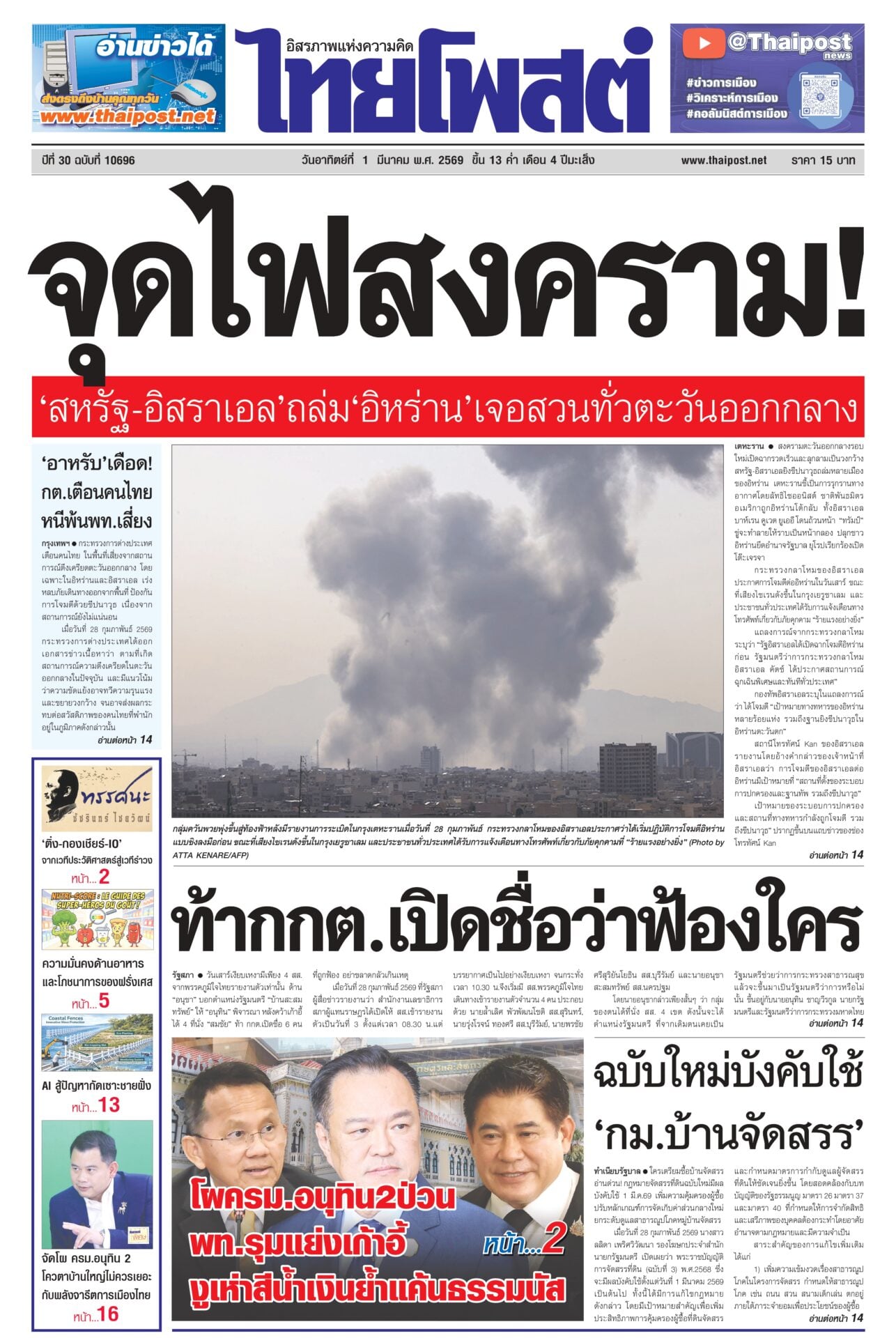 หนังสือพิมพ์ฉบับวันที่ 1 มีนาคม 2569ข่าวหน้าหนึ่งจุดไฟสงคราม! ‘สหรัฐ-อิสราเอล’ถล่ม‘อิหร่าน’เจอสวนทั่วตะวันออกกลางสงครามตะวันออกกลางรอบใหม่เปิดฉากรวดเร็วและลุกลามเป็นวงกว้าง สหรัฐ-อิสราเอลยิงขีปนาวุธถล่มหลายเมืองของอิหร่าน เตหะรานชี้เป็นการรุกรานทางอากาศโดยลัทธิไซออนิสต์ ‘อาหรับ’เดือด! กต.เตือนคนไทย หนีพ้นพท.เสี่ยงกระทรวงการต่างประเทศเตือนคนไทย ในพื้นที่เสี่ยงจากสถานการณ์ตึงเครียดตะวันออกกลาง โดยเฉพาะในอิหร่านและอิสราเอล เร่งหลบภัยเดินทางออกจากพื้นที่ ท้ากกต.เปิดชื่อว่าฟ้องใครวันเสาร์เงียบเหงามีเพียง 4 สส.จากพรรคภูมิใจไทยรายงานตัวเท่านั้น ด้าน “อนุชา” บอกตำแหน่งรัฐมนตรี “บ้านสะสมทรัพย์” ให้ “อนุทิน” พิจารณา ฉบับใหม่บังคับใช้ ‘กม.บ้านจัดสรร’ใครเตรียมซื้อบ้านจัดสรรอ่านด่วน! กฎหมายจัดสรรที่ดินฉบับใหม่มีผลบังคับใช้ 1 มี.ค.69 เพิ่มความคุ้มครองผู้ซื้อ ปรับหลักเกณฑ์การจัดเก็บค่าส่วนกลางใหม่