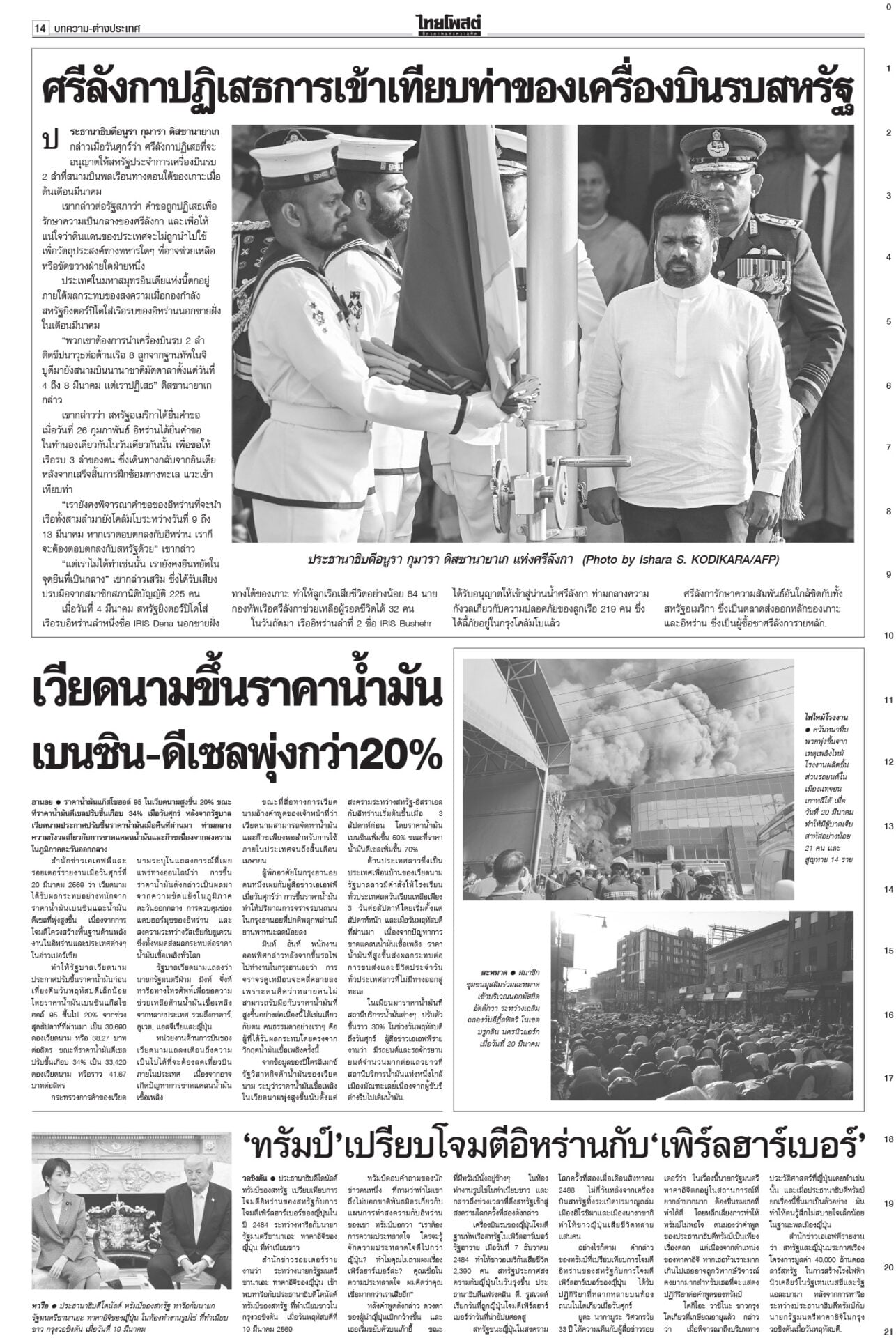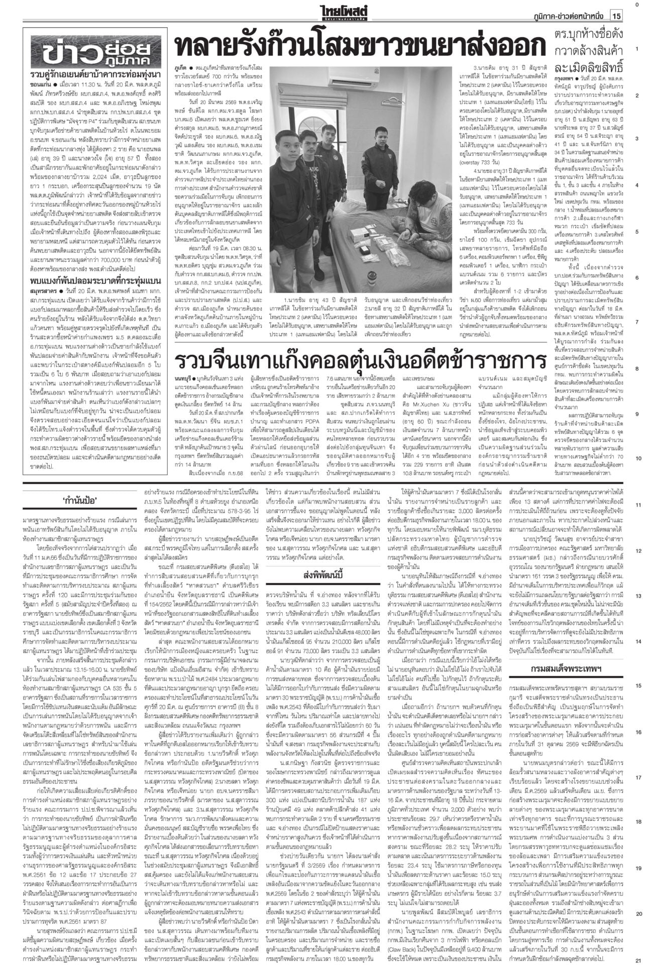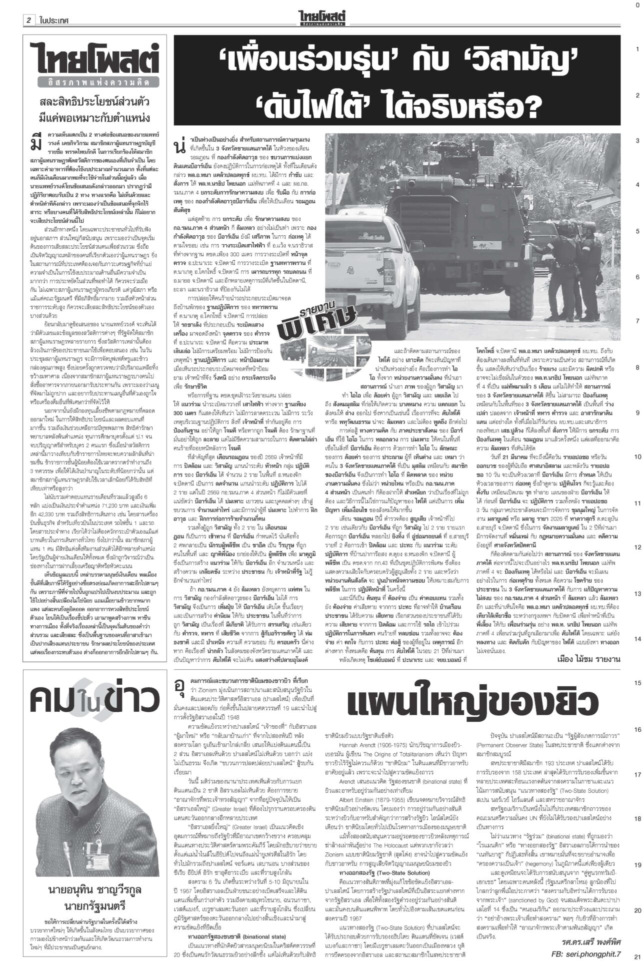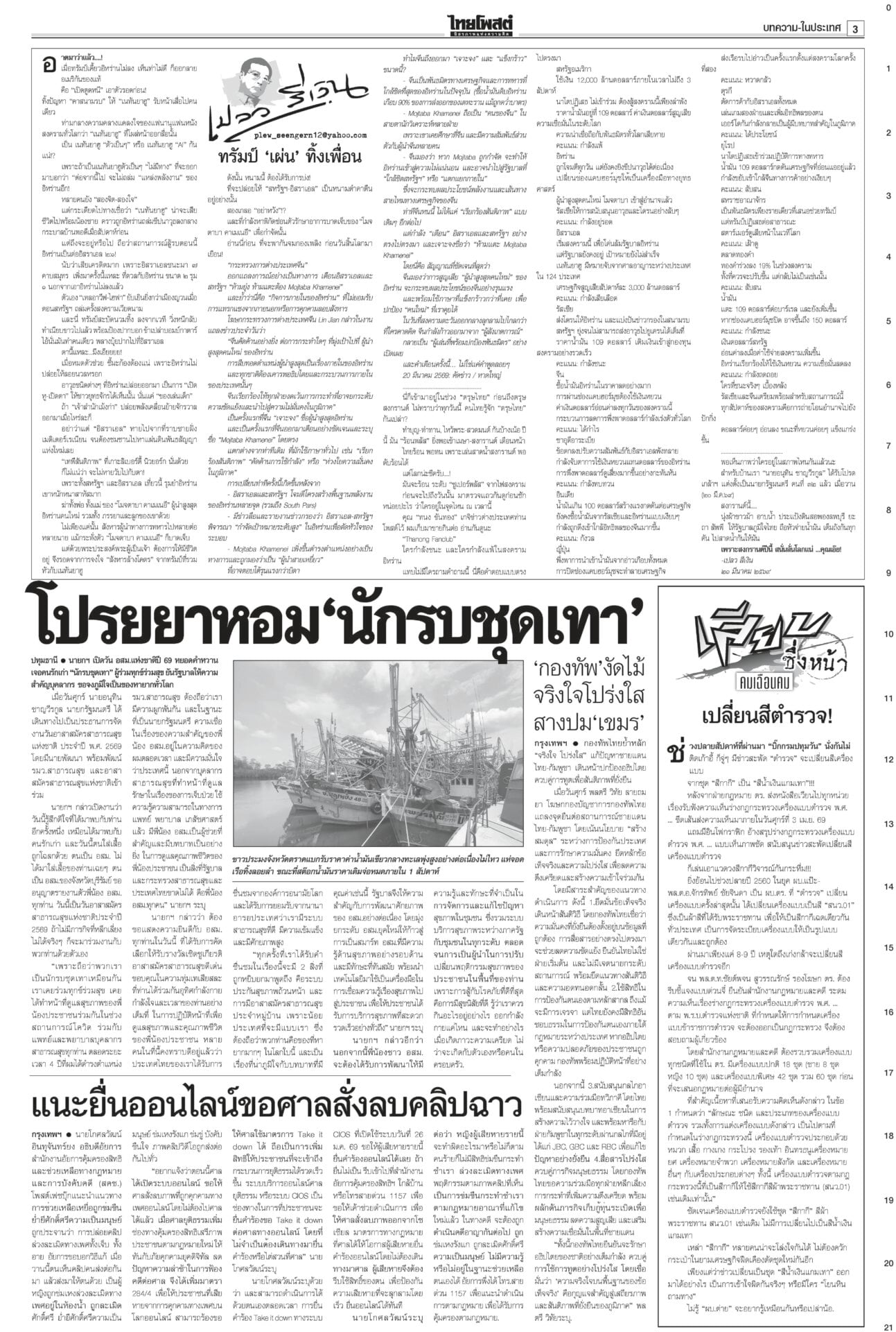 หนังสือพิมพ์ ฉบับวันที่ 21 มีนาคม 2569ข่าวหน้าหนึ่งยึดผลประโยชน์ชาติ ‘อนุทิน’รับสนองพระบรมราชโองการโปรดเกล้าฯแต่งตั้ง“อนุทิน” รับสนองพระบรมราชโองการโปรดเกล้าฯ แต่งตั้งเป็น “นายกฯ สมัยที่ 2” สั่งพิพัฒน์บี้ตุนนํ้ามัน“อนุทิน” เซ็นตั้ง “พิพัฒน์” คุมเข้มผู้ค้าน้ำมัน เจ้าตัวขึงขังกวาดล้างพวกกักตุน อุกอาจ!ยิงถล่มรถกมลศักดิ์อุกอาจ! คนร้ายยิงถล่มรถ “กมลศักดิ์ ลีวาเมาะ” สส.นราธิวาส หน้าบ้านพัก ยํ้าคนไทยอพยพด่วน ‘เนทันยาฮู’ฟุ้งจบเร็ว!ศบก.ตอกย้ำให้คนไทยออกจากพื้นที่เสี่ยงให้เร็วที่สุด พร้อมสั่งทูตในอิสราเอลกำชับแรงงานให้อยู่ในเขตที่ปลอดภัย ‘กกต.’ท่องทำตาม‘กม.’ แจงยิบปม4คดีร้อนแรง“แสวง” ตั้งโต๊ะแจงทุกปม ทั้งเรื่องศาลรัฐธรรมนูญรับคดีบาร์โค้ด-กกต.ฟ้องเอาคืน-ฮั้ว สว.-ยุบพรรคประชาชน ‘กำนันป้อ’เซ็ง DSIออกหมาย ‘ปปช.’ลงดาบ เล่นไพ่-รุกที่ดินป.ป.ช.ชี้มูลความผิด “ชัยทิพย์” อดีต สส.ราชบุรี ผิดจริยธรรมร้ายแรงปมเล่นไพ่ในสภา