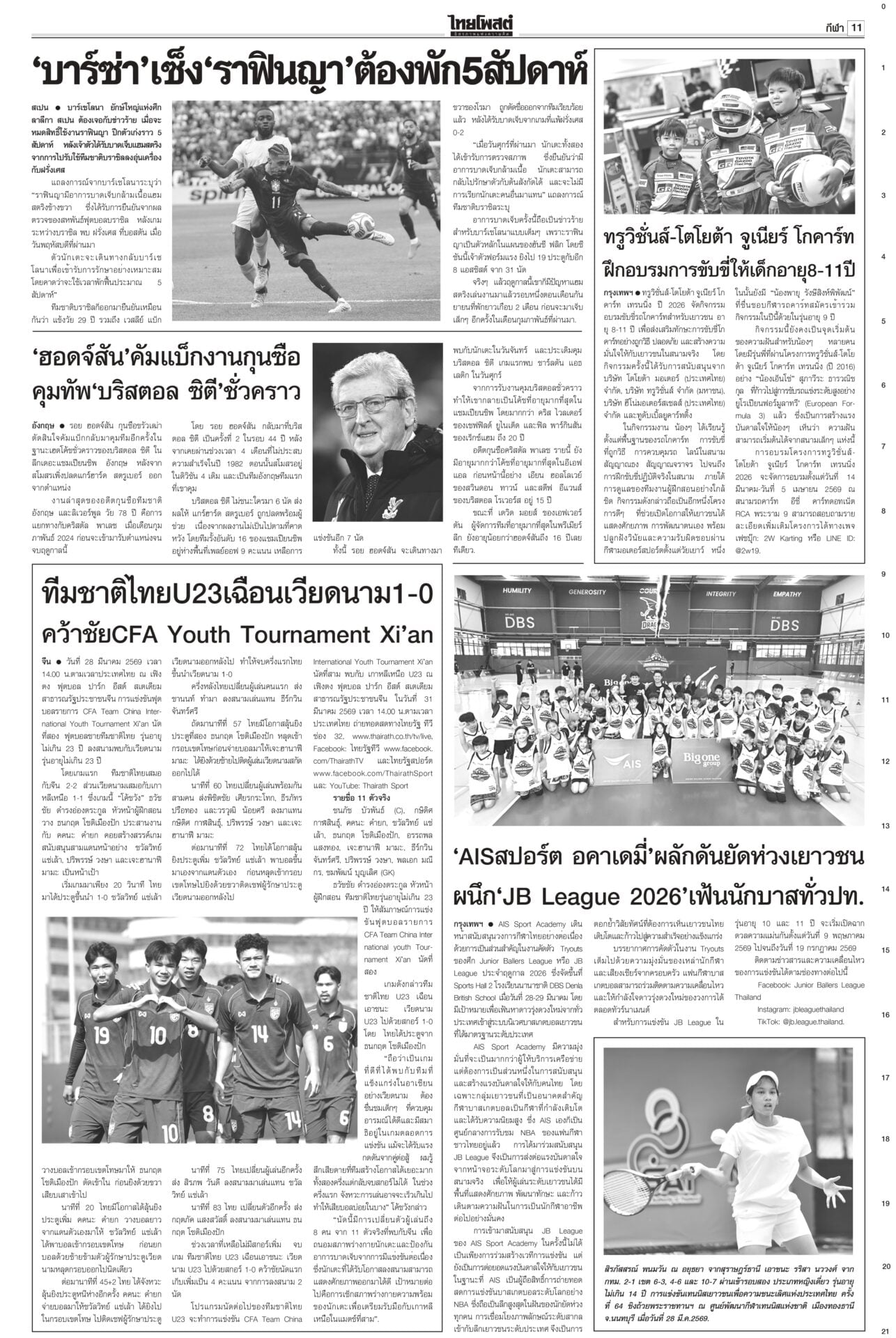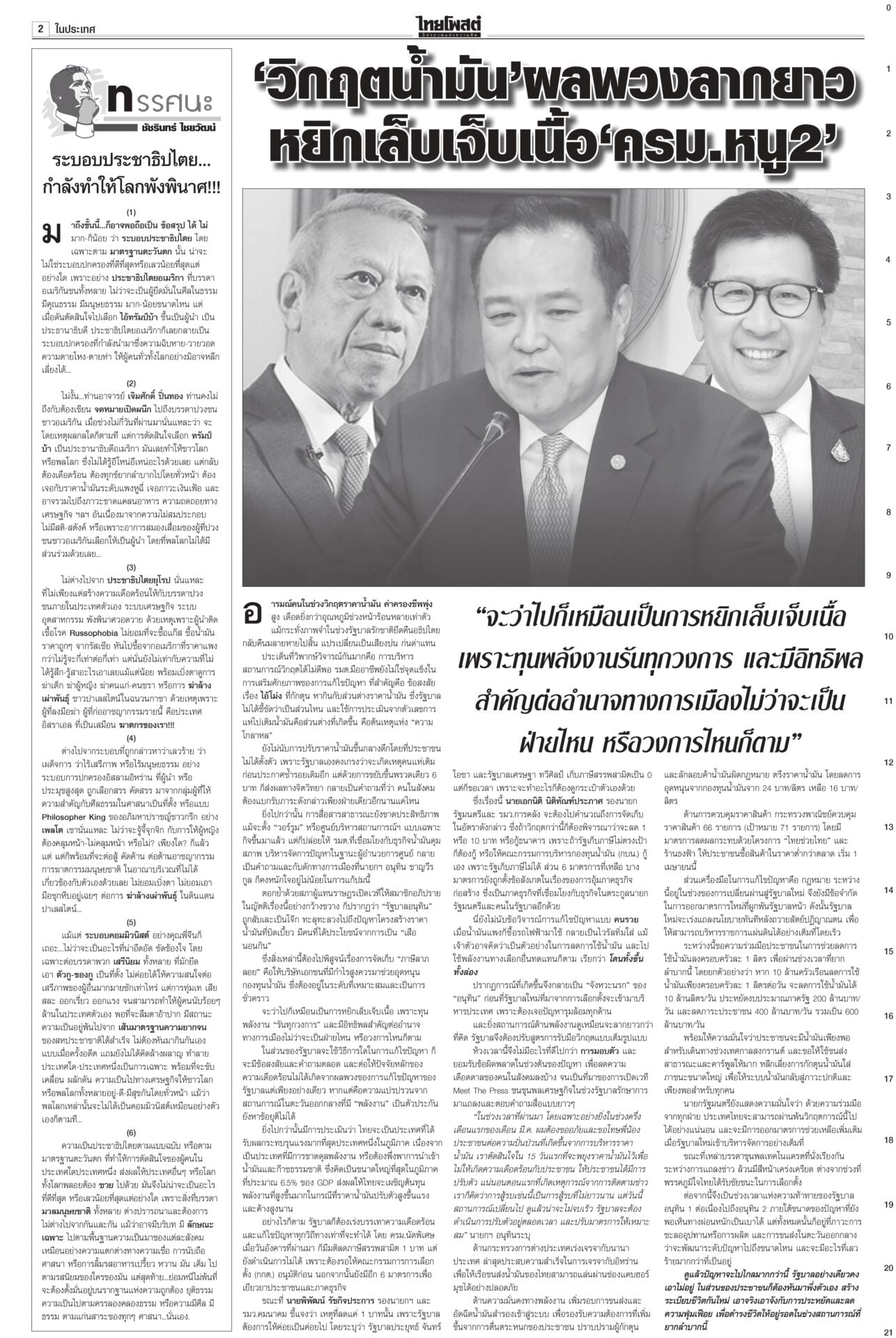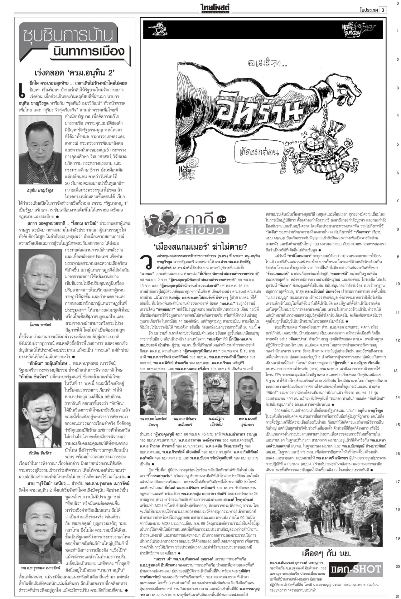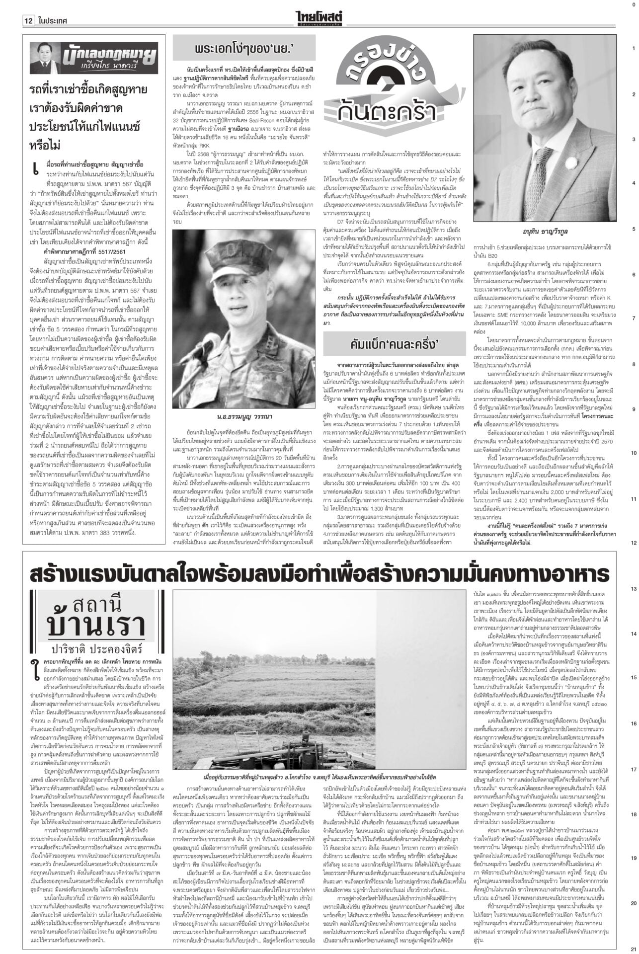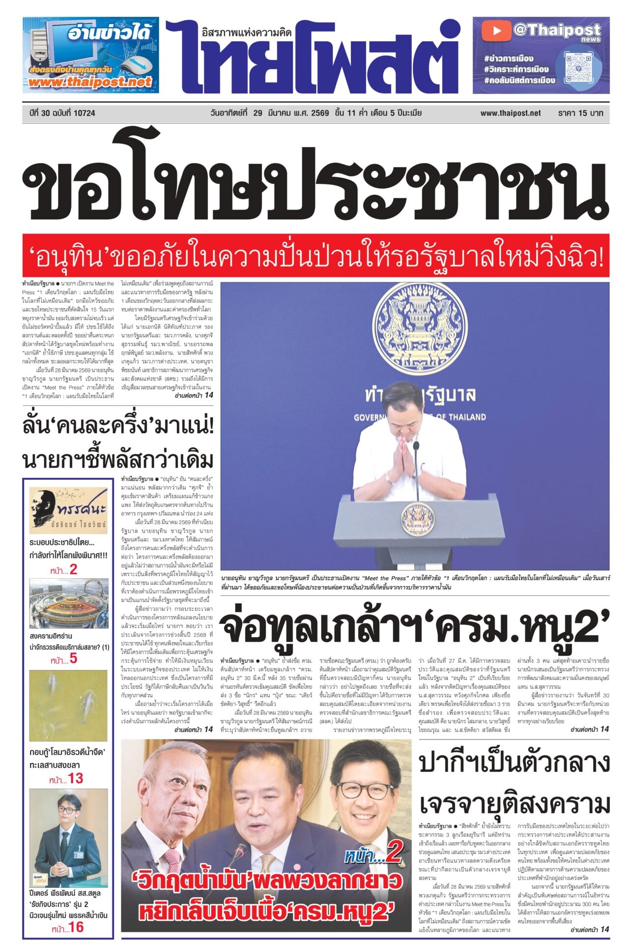 หนังสือพิมพ์ฉบับวันที่ 29 มีนาคม 2569ข่าวหน้าหนึ่งขอโทษประชาชน ‘อนุทิน’ ขออภัยในความปั่นป่วนให้รอรัฐบาลใหม่วิ่งฉิว!นายกฯ เปิดงาน Meet the Press “1 เดือนวิกฤตโลก : แผนรับมือไทย ในโลกที่ไม่เหมือนเดิม” ยกมือไหว้ขออภัยและขอโทษประชาชนที่ตัดสินใจ 15 วันแรกพยุงราคาน้ำมัน ลั่น‘คนละครึ่ง’มาแน่! นายกฯชี้พลัสกว่าเดิม“อนุทิน” ยัน “คนละครึ่ง” มาแน่นอน พลัสมากกว่าเดิม “ศุภจี” ย้ำคุมเข้มราคาสินค้า เตรียมแผนแก้ข้าวแกงแพง ให้ส่งวัตถุดิบเกษตรจากต้นทางไปร้านอาหาร กรุงเทพฯ-ปริมณฑล นำร่อง 24 แห่ง จ่อทูลเกล้าฯ‘ครม.หนู2’“อนุทิน” ย้ำส่งชื่อ ครม.ต้นสัปดาห์หน้า เตรียมทูลเกล้าฯ “ครม.อนุทิน 2” 30 มี.ค.นี้ หลัง 35 รายชื่อผ่านด่านอรหันต์ตรวจเข้มคุณสมบัติ ชัดเพื่อไทยส่ง 3 ชื่อ “นิกร” แทน “ปุ๋ง” ขณะ “เดียร์ ขัตติยา-วิสุทธิ์” วืดอีกแล้ว ปากีฯเป็นตัวกลาง เจรจายุติสงคราม“สีหศักดิ์” ย้ำยังไม่ทราบชะตากรรม 3 ลูกเรือมยุรีนารี แต่อิหร่านเข้าถึงเรือแล้ว เผยหารือกับทูตตะวันออกกลางช่วยดูแลคนไทย เสนอประชุม รมว.ต่างประเทศอาเซียนหารือแนวทางลดความตึงเครียด ขณะที่ปากีสถานเป็นตัวกลางเจรจายุติสงคราม