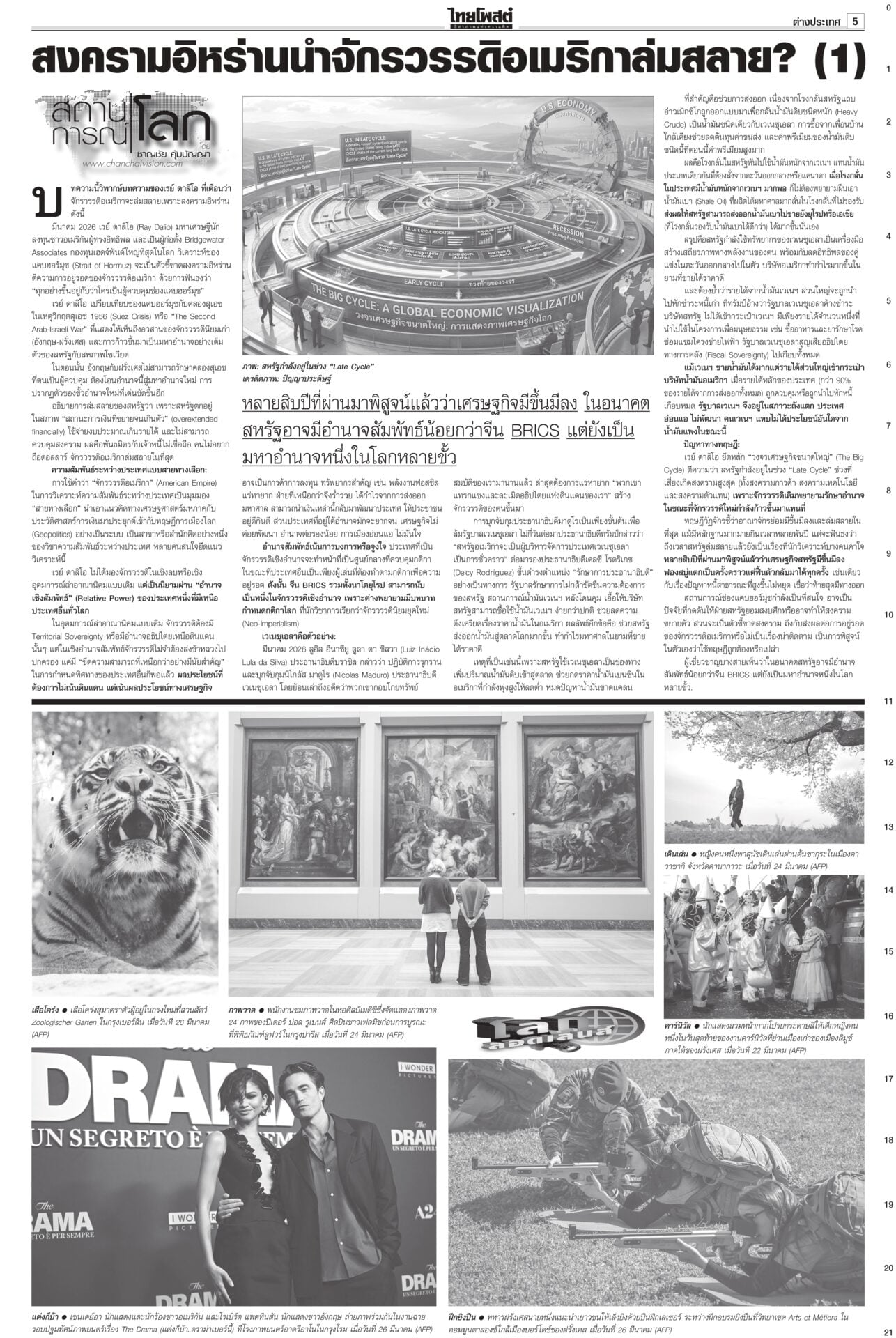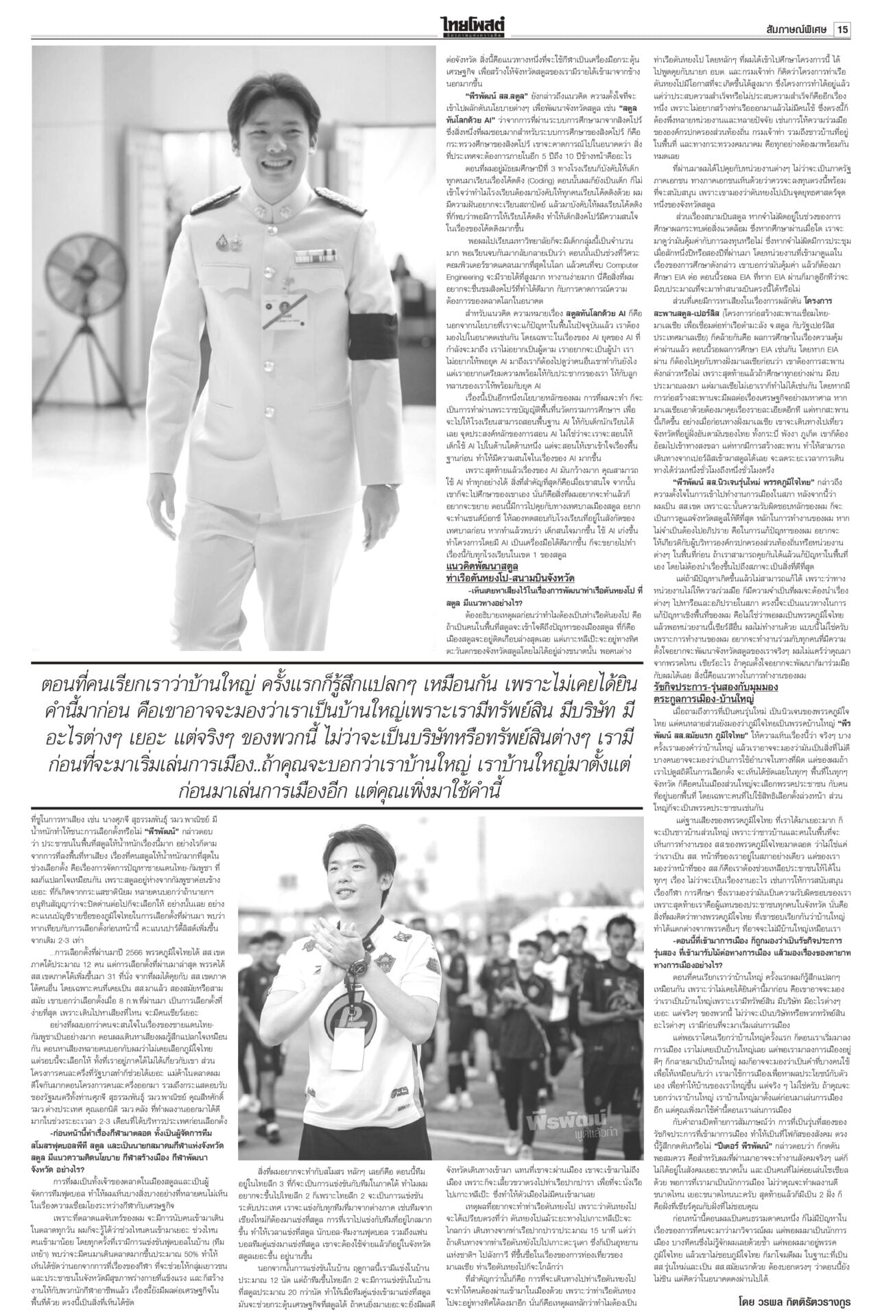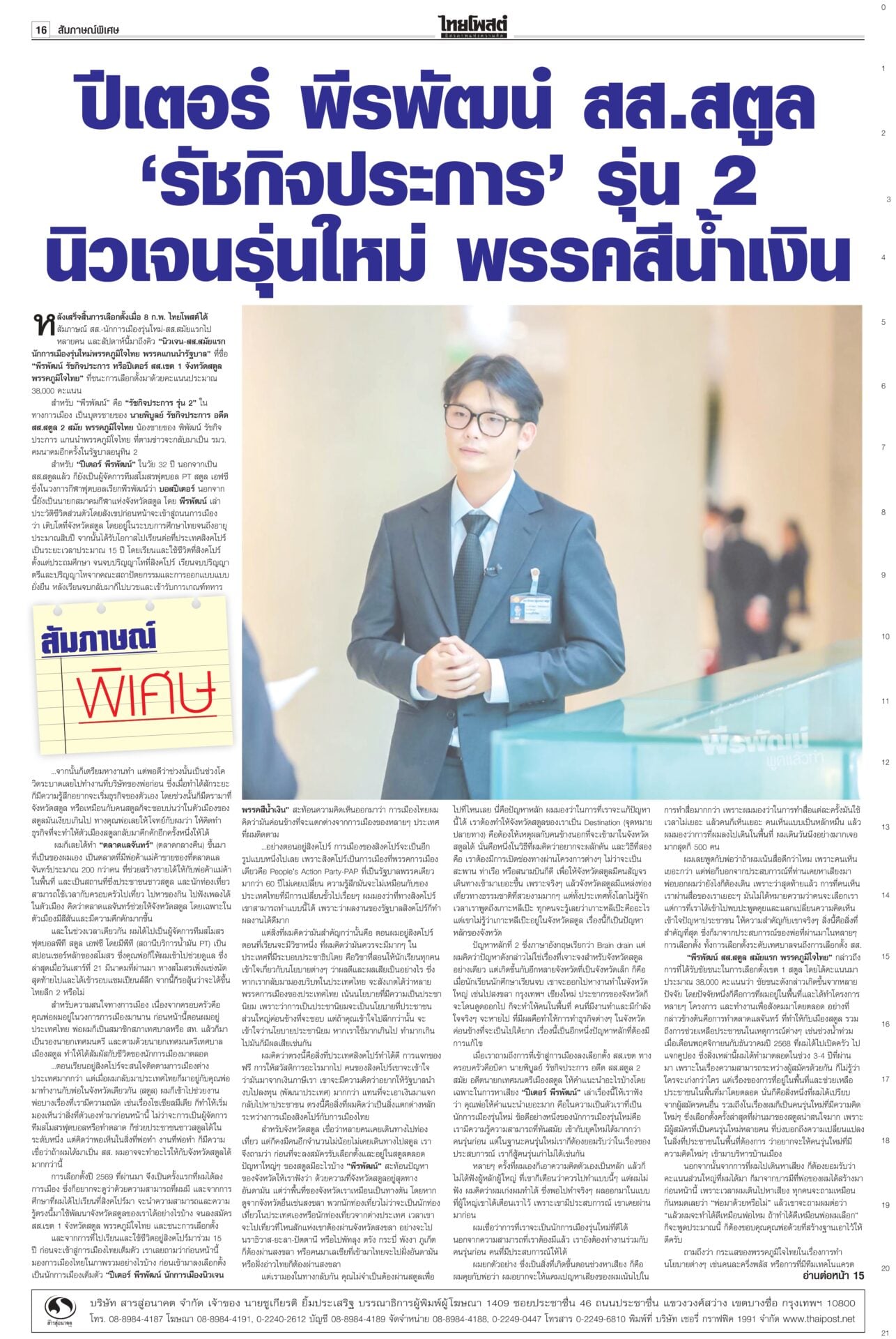 ฉบับวันที่ 29 มีนาคม 2569 29 มีนาคม 2569 เวลา 0:01 น. หนังสือพิมพ์ฉบับวันที่ 29 มีนาคม 2569ข่าวหน้าหนึ่งขอโทษประชาชน ‘อนุทิน’ ขออภัยในความปั่นป่วนให้รอรัฐบาลใหม่วิ่งฉิว!นายกฯ เปิดงาน Meet the Press “1 เดือนวิกฤตโลก : แผนรับมือไทย ในโลกที่ไม่เหมือนเดิม” ยกมือไหว้ขออภัยและขอโทษประชาชนที่ตัดสินใจ 15 วันแรกพยุงราคาน้ำมัน ลั่น‘คนละครึ่ง’มาแน่! นายกฯชี้พลัสกว่าเดิม“อนุทิน” ยัน “คนละครึ่ง” มาแน่นอน พลัสมากกว่าเดิม “ศุภจี” ย้ำคุมเข้มราคาสินค้า เตรียมแผนแก้ข้าวแกงแพง ให้ส่งวัตถุดิบเกษตรจากต้นทางไปร้านอาหาร กรุงเทพฯ-ปริมณฑล นำร่อง 24 แห่ง จ่อทูลเกล้าฯ‘ครม.หนู2’“อนุทิน” ย้ำส่งชื่อ ครม.ต้นสัปดาห์หน้า เตรียมทูลเกล้าฯ “ครม.อนุทิน 2” 30 มี.ค.นี้ หลัง 35 รายชื่อผ่านด่านอรหันต์ตรวจเข้มคุณสมบัติ ชัดเพื่อไทยส่ง 3 ชื่อ “นิกร” แทน “ปุ๋ง” ขณะ “เดียร์ ขัตติยา-วิสุทธิ์” วืดอีกแล้ว ปากีฯเป็นตัวกลาง เจรจายุติสงคราม“สีหศักดิ์” ย้ำยังไม่ทราบชะตากรรม 3 ลูกเรือมยุรีนารี แต่อิหร่านเข้าถึงเรือแล้ว เผยหารือกับทูตตะวันออกกลางช่วยดูแลคนไทย เสนอประชุม รมว.ต่างประเทศอาเซียนหารือแนวทางลดความตึงเครียด ขณะที่ปากีสถานเป็นตัวกลางเจรจายุติสงคราม Tagsรายวันหนังสือพิมพ์ ข่าวที่เกี่ยวข้อง ฉบับวันที่ 28 มีนาคม 2569 ฉบับวันที่ 27 มีนาคม 2569 ฉบับวันที่ 26 มีนาคม 2569 ฉบับวันที่ 25 มีนาคม 2569 ฉบับวันที่ 24 มีนาคม 2569 ฉบับวันที่ 23 มีนาคม 2569 NEWS UPDATE 2:09 น. 'AIS Sport Academy' ดันยัดห่วงเยาวชนไทย ผนึก'JB League2026'เฟ้นนักบาสทั่วไทย 1:57 น. กอล์ฟฟิ่งกราวนด์ฯ จับมือบางจากฯเปิดสาขา5ที่ศรีนครินทร์ ได้เรียนรู้กีฬากอล์ฟ 1:28 น. 'อ๋อลี่ ตติยา' ชมเปาะ 'จ๋า พราวเพชร' สปิริตแรง ป่วยแต่สู้! 1:09 น. 'ดีเจ.แมน' เปิดใจเหตุหย่า 'ใบเตย' เตือนคนที่พาดพิงอย่ามาล้ำเส้น! 0:50 น. 'Mild Orange' ปล่อยมนต์อินดี้สุดละมุน ด้าน 'Phum Viphurit' โผล่เซอร์ไพรส์!