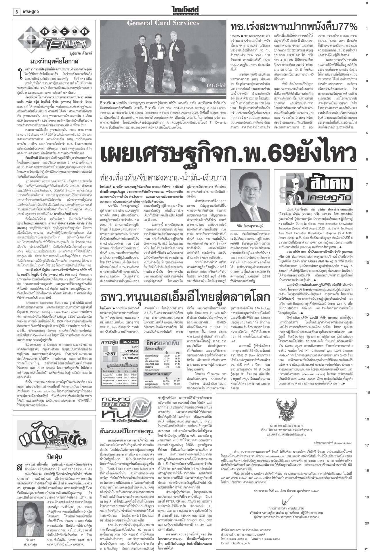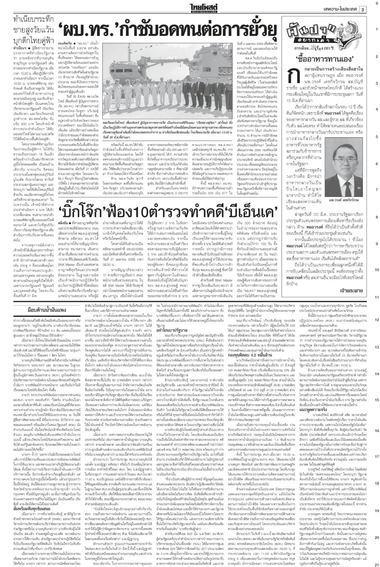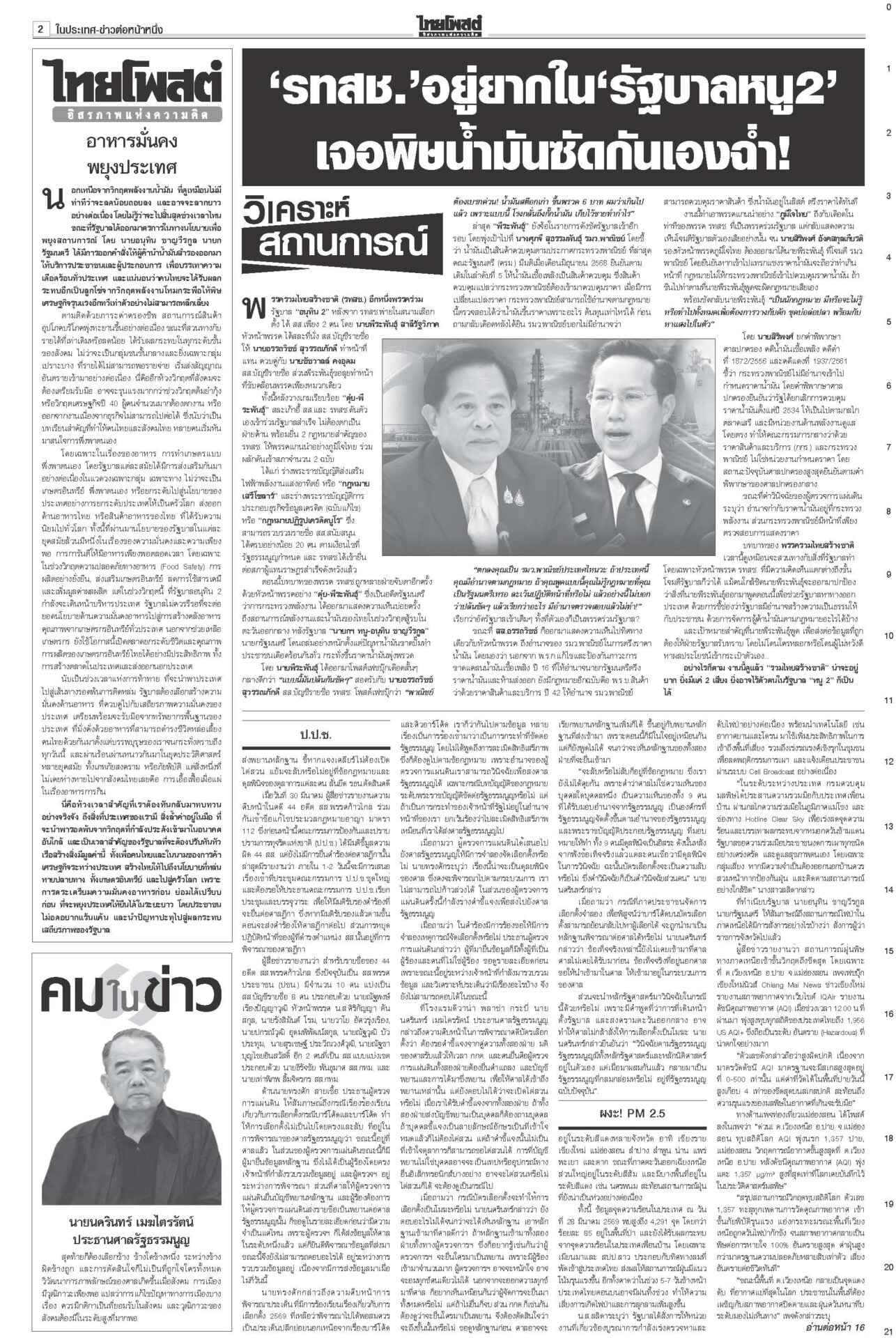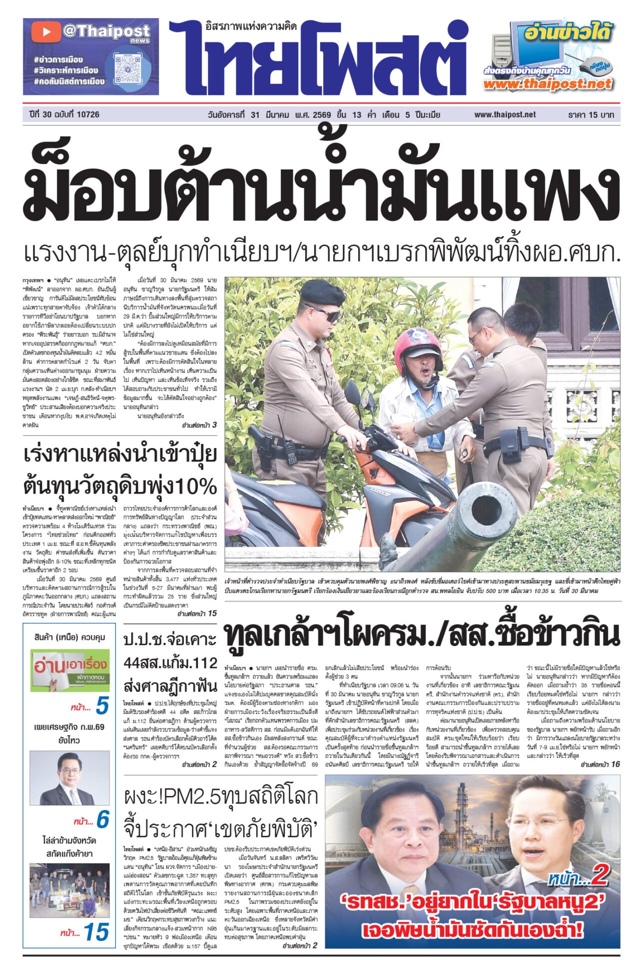 หนังสือพิมพ์ ฉบับวันที่ 31 มีนาคม 2569ข่าวหน้าหนึ่งม็อบต้านน้ำมันแพง แรงงาน-ตุลย์บุกทำเนียบฯ/นายกฯเบรกพิพัฒน์ทิ้งผอ.ศบก.“อนุทิน” เผยแตะเบรกไม่ให้ “พิพัฒน์” ลาออกจาก ผอ.ศบก. ยันเป็นผู้เชี่ยวชาญ ทูลเกล้าฯโผครม./สส.ซื้อข้าวกินนายกฯ เผยนำรายชื่อ ครม.ขึ้นทูลเกล้าฯ ถวายแล้ว ยันความพร้อมแถลงนโยบายต่อรัฐสภา “ประธานศาล รธน.” ป.ป.ช.จ่อเคาะ 44สส.แก้ม.112 ส่งศาลฎีกาฟันป.ป.ช.ได้ฤกษ์ชงที่ประชุมใหญ่มีมติรับรองคำร้องคดี 44 อดีต สส.ก้าวไกลแก้ ม.112 ผงะ!PM2.5ทุบสถิติโลก จี้ประกาศ‘เขตภัยพิบัติ’“เหนือ-อีสาน” อ่วมหนักเผชิญวิกฤต PM2.5 รัฐบาลอ้อแอ้คุยแก้ฝุ่นพิษข้ามแดน “อนุทิน” โยน ผวจ.จัดการ “เมืองปาย-แม่ฮ่องสอน” เร่งหาแหล่งนำเข้าปุ๋ย ต้นทุนวัตถุดิบพุ่ง10%จี้ทูตพาณิชย์เร่งหาแหล่งนำเข้าปุ๋ยทดแทน-หาตลาดส่งออกใหม่ “พาณิชย์”
