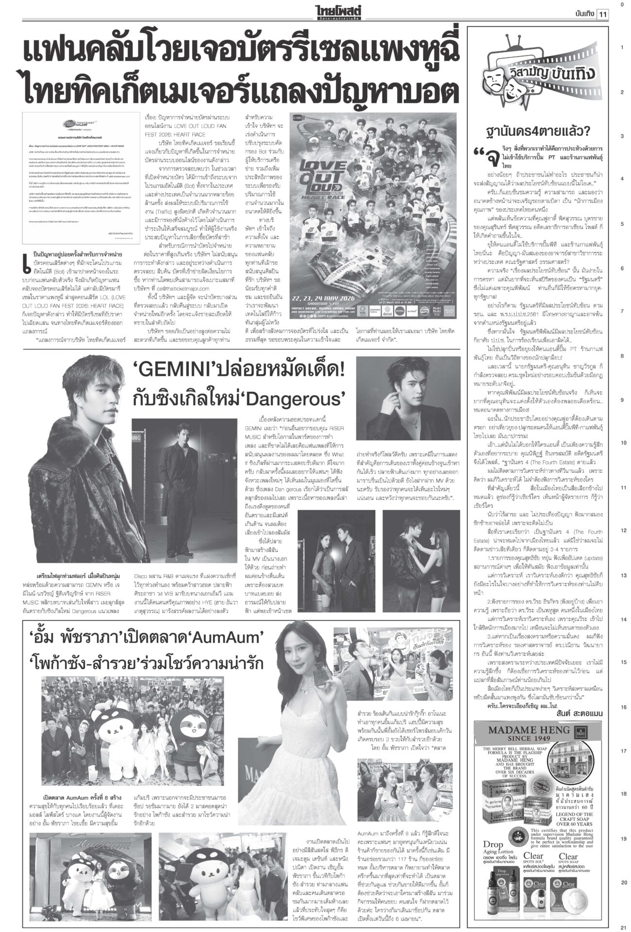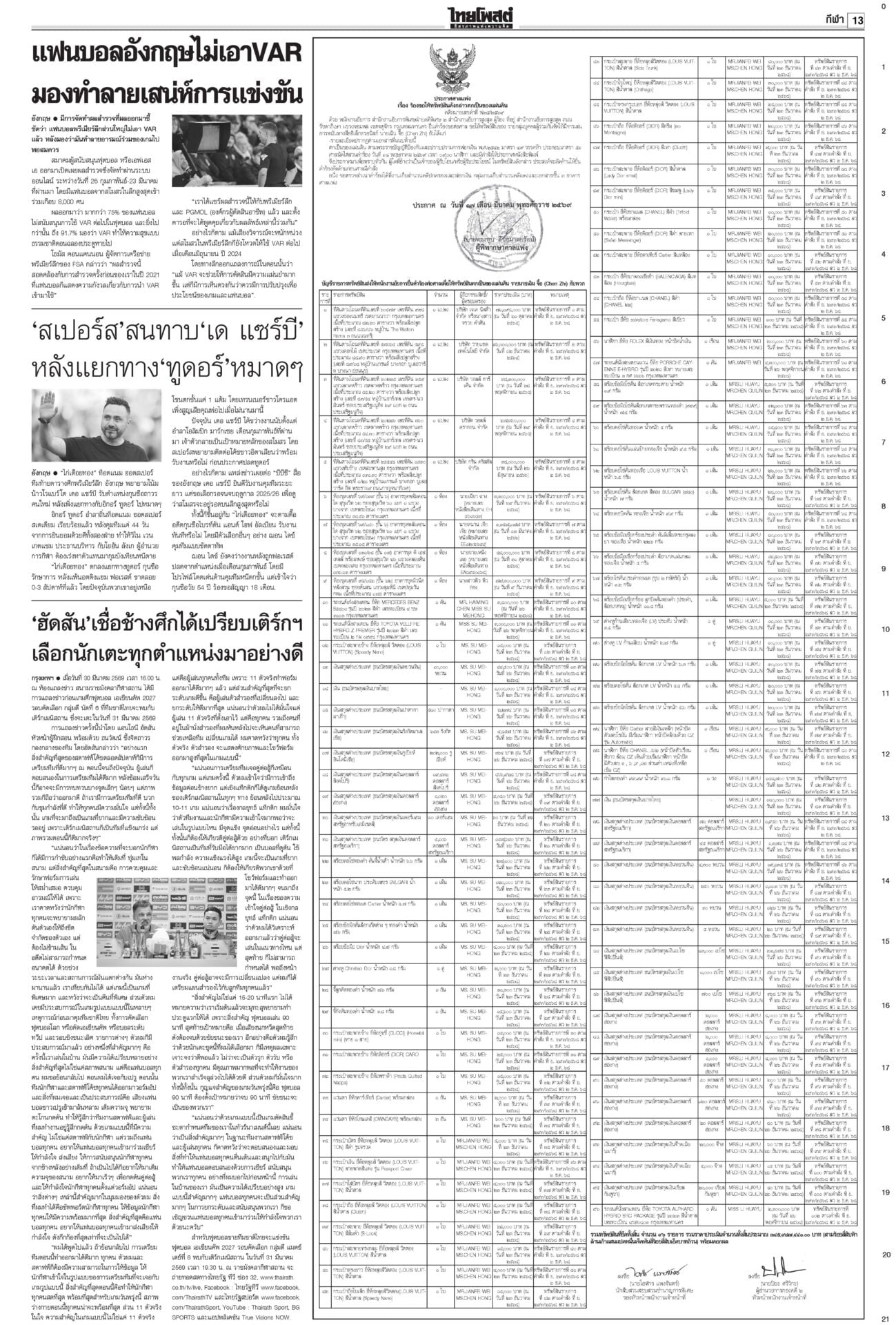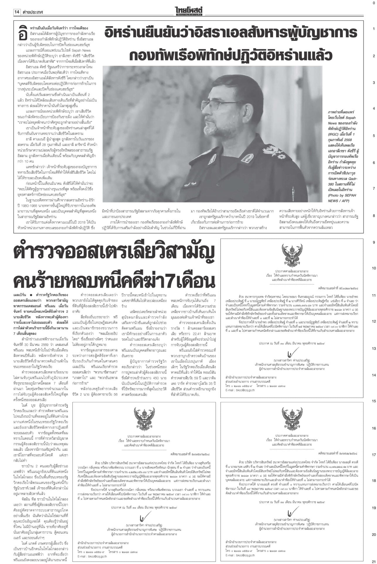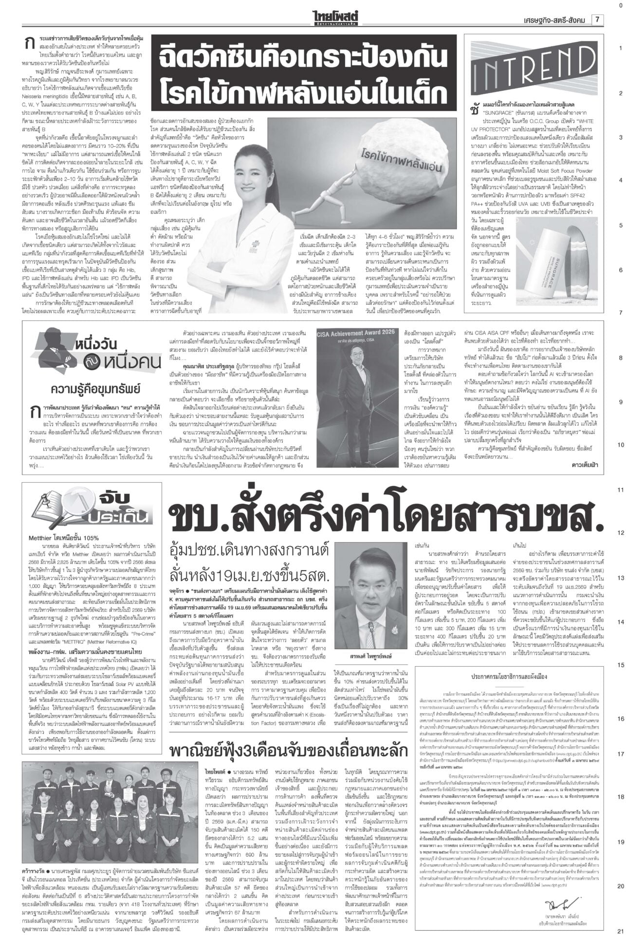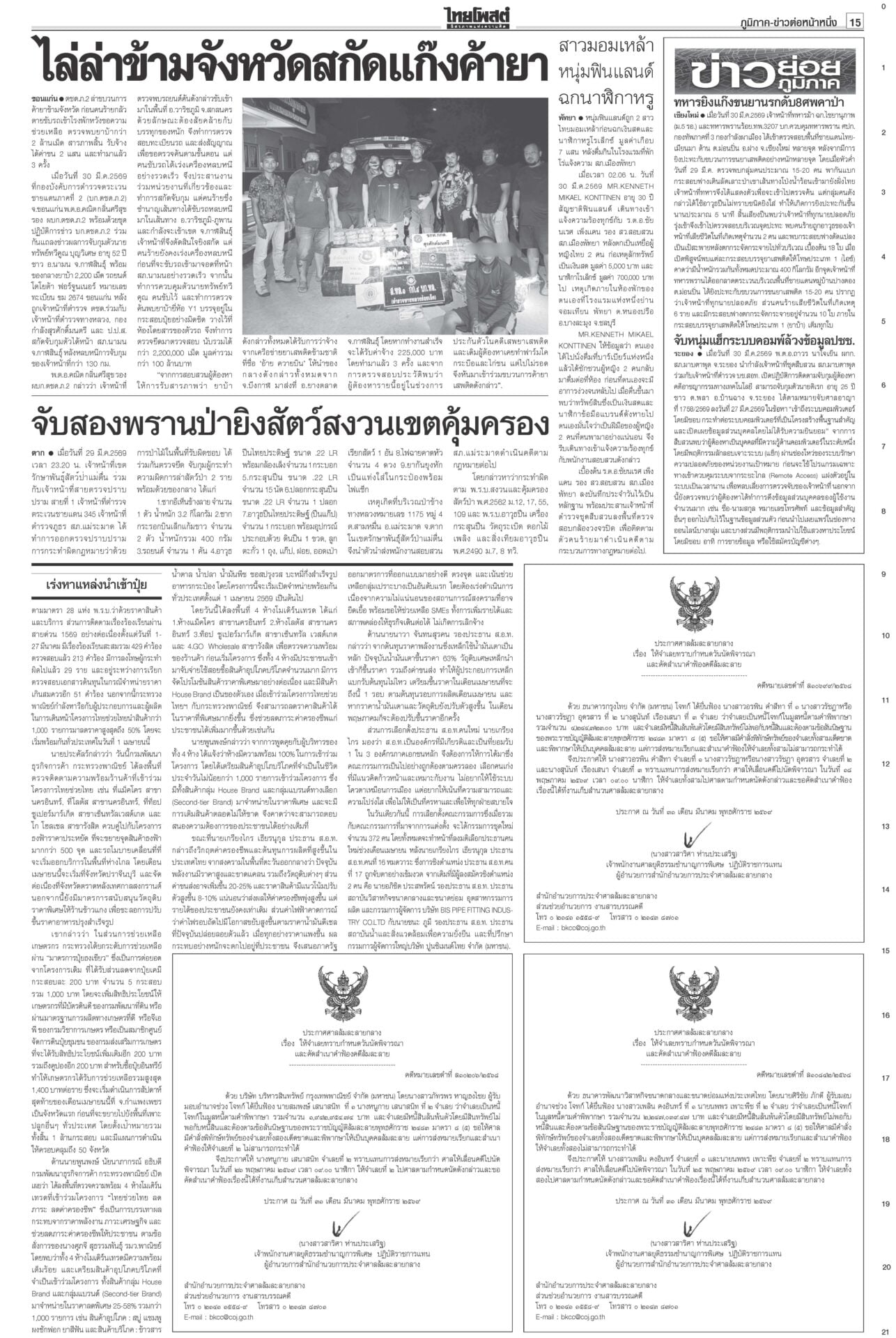 หนังสือพิมพ์ ฉบับวันที่ 31 มีนาคม 2569ข่าวหน้าหนึ่งม็อบต้านน้ำมันแพง แรงงาน-ตุลย์บุกทำเนียบฯ/นายกฯเบรกพิพัฒน์ทิ้งผอ.ศบก.“อนุทิน” เผยแตะเบรกไม่ให้ “พิพัฒน์” ลาออกจาก ผอ.ศบก. ยันเป็นผู้เชี่ยวชาญ ทูลเกล้าฯโผครม./สส.ซื้อข้าวกินนายกฯ เผยนำรายชื่อ ครม.ขึ้นทูลเกล้าฯ ถวายแล้ว ยันความพร้อมแถลงนโยบายต่อรัฐสภา “ประธานศาล รธน.” ป.ป.ช.จ่อเคาะ 44สส.แก้ม.112 ส่งศาลฎีกาฟันป.ป.ช.ได้ฤกษ์ชงที่ประชุมใหญ่มีมติรับรองคำร้องคดี 44 อดีต สส.ก้าวไกลแก้ ม.112 ผงะ!PM2.5ทุบสถิติโลก จี้ประกาศ‘เขตภัยพิบัติ’“เหนือ-อีสาน” อ่วมหนักเผชิญวิกฤต PM2.5 รัฐบาลอ้อแอ้คุยแก้ฝุ่นพิษข้ามแดน “อนุทิน” โยน ผวจ.จัดการ “เมืองปาย-แม่ฮ่องสอน” เร่งหาแหล่งนำเข้าปุ๋ย ต้นทุนวัตถุดิบพุ่ง10%จี้ทูตพาณิชย์เร่งหาแหล่งนำเข้าปุ๋ยทดแทน-หาตลาดส่งออกใหม่ “พาณิชย์”