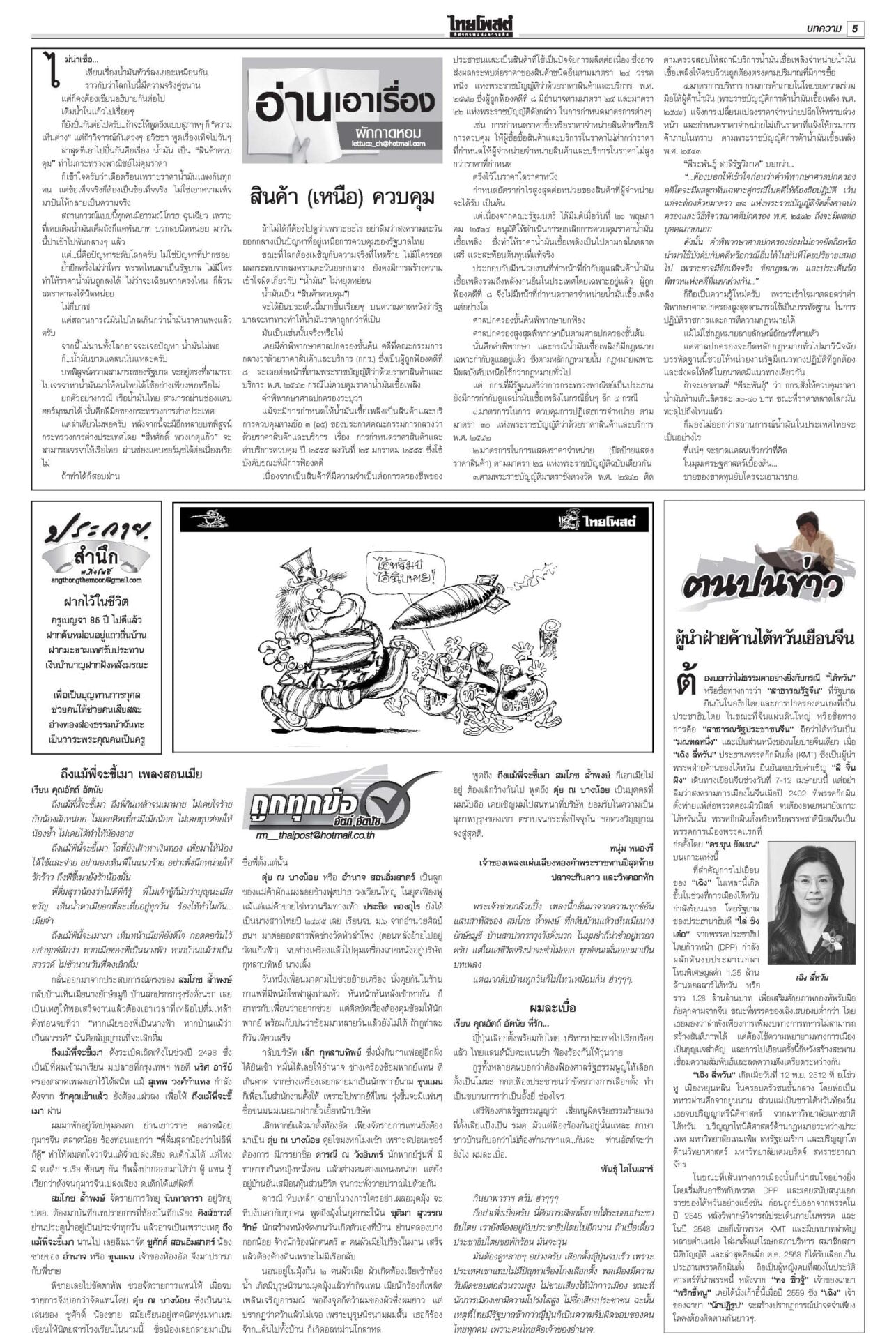 ฉบับวันที่ 31 มีนาคม 2569 31 มีนาคม 2569 เวลา 0:01 น. หนังสือพิมพ์ ฉบับวันที่ 31 มีนาคม 2569ข่าวหน้าหนึ่งม็อบต้านน้ำมันแพง แรงงาน-ตุลย์บุกทำเนียบฯ/นายกฯเบรกพิพัฒน์ทิ้งผอ.ศบก.“อนุทิน” เผยแตะเบรกไม่ให้ “พิพัฒน์” ลาออกจาก ผอ.ศบก. ยันเป็นผู้เชี่ยวชาญ ทูลเกล้าฯโผครม./สส.ซื้อข้าวกินนายกฯ เผยนำรายชื่อ ครม.ขึ้นทูลเกล้าฯ ถวายแล้ว ยันความพร้อมแถลงนโยบายต่อรัฐสภา “ประธานศาล รธน.” ป.ป.ช.จ่อเคาะ 44สส.แก้ม.112 ส่งศาลฎีกาฟันป.ป.ช.ได้ฤกษ์ชงที่ประชุมใหญ่มีมติรับรองคำร้องคดี 44 อดีต สส.ก้าวไกลแก้ ม.112 ผงะ!PM2.5ทุบสถิติโลก จี้ประกาศ‘เขตภัยพิบัติ’“เหนือ-อีสาน” อ่วมหนักเผชิญวิกฤต PM2.5 รัฐบาลอ้อแอ้คุยแก้ฝุ่นพิษข้ามแดน “อนุทิน” โยน ผวจ.จัดการ “เมืองปาย-แม่ฮ่องสอน” เร่งหาแหล่งนำเข้าปุ๋ย ต้นทุนวัตถุดิบพุ่ง10%จี้ทูตพาณิชย์เร่งหาแหล่งนำเข้าปุ๋ยทดแทน-หาตลาดส่งออกใหม่ “พาณิชย์” Tagsรายวันหนังสือพิมพ์ ข่าวที่เกี่ยวข้อง ฉบับวันที่ 30 มีนาคม 2569 ฉบับวันที่ 29 มีนาคม 2569 ฉบับวันที่ 29 มีนาคม 2569 ฉบับวันที่ 28 มีนาคม 2569 ฉบับวันที่ 27 มีนาคม 2569 ฉบับวันที่ 26 มีนาคม 2569 ฉบับวันที่ 25 มีนาคม 2569 NEWS UPDATE 0:01 น. 'รทสช.'อยู่ยากใน‘รัฐบาลหนู2’ เจอพิษน้ำมัน ซัดกันเองฉ่ำ! 23:32 น. พรุ่งนี้น้ำมันดีเซลขึ้น 1.8 บาทเบนซิน 1 บาทมีผลตี 5 22:58 น. คืบหน้าสงครามตะวันออกกลาง : โจมตีมหาวิทยาลัยอิหร่าน-แหล่งน้ำมันอิสราเอล 20:14 น. นักวิชาการ ไขโครงสร้างน้ำมันไทย ชี้น้ำมันแพงเพราะโครงสร้างภาษี ไม่ใช่ต้นทุนกลั่น 20:08 น. กองทัพเรือ รับมอบ 'เรือหลวงสุริยะ' ลำใหม่ ต่อโดยฝีมือคนไทย