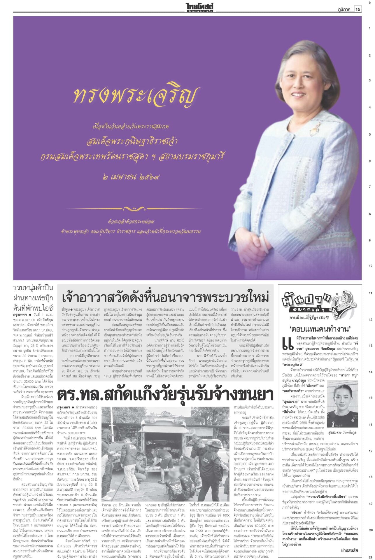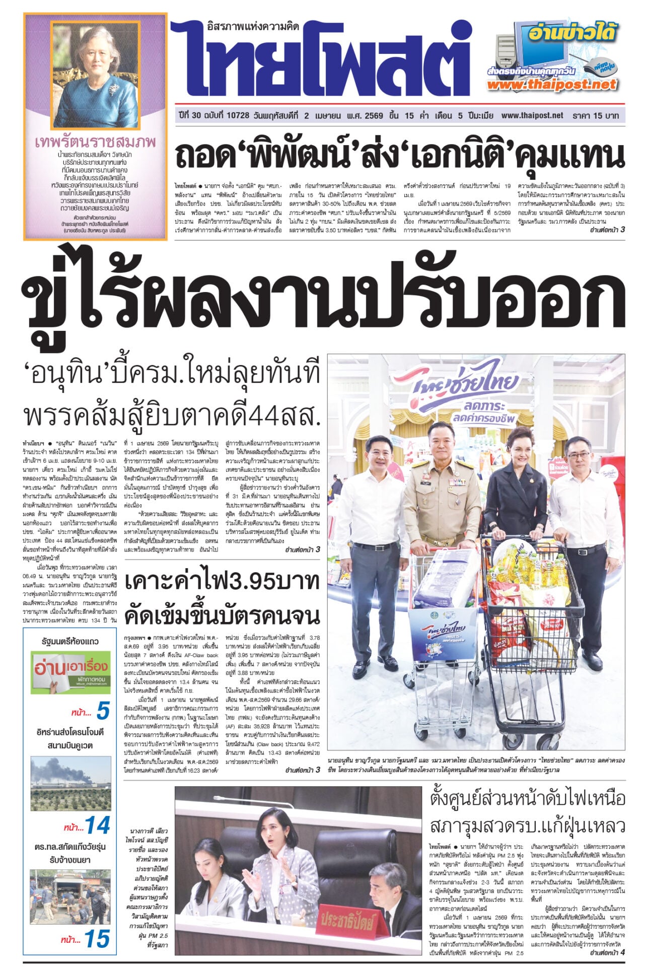 หนังสือพิมพ์ ฉบับวันที่ 2 เมษายน 2569ข่าวหน้าหนึ่งขู่ไร้ผลงานปรับออก ‘อนุทิน’บี้ครม.ใหม่ลุยทันที พรรคส้มสู้ยิบตาคดี44สส.“อนุทิน” ดินเนอร์ “เนวิน” ร้านประจำ หลังโปรดเกล้าฯ ครม.ใหม่ ถอด‘พิพัฒน์’ส่ง‘เอกนิติ’คุมแทนนายกฯ จ่อตั้ง “เอกนิติ” คุม “ศบก.-พลังงาน” แทน “พิพัฒน์” อ้างเปลี่ยนตัวตามเสียงเรียกร้อง ปชช. ไม่เกี่ยวมีผลประโยชน์ทับซ้อน เคาะค่าไฟ3.95บาท คัดเข้มขึ้นบัตรคนจนกกพ.เคาะค่าไฟงวดใหม่ พ.ค.-ส.ค.69 อยู่ที่ 3.95 บาท/หน่วย เพิ่มขึ้นน้อยสุด 7 สตางค์ ตั้งศูนย์ส่วนหน้าดับไฟเหนือ สภารุมสวดรบ.แก้ฝุ่นเหลวนายกฯ ให้อำนาจผู้ว่าฯ ประกาศภัยพิบัติหรือไม่ หลังค่าฝุ่น PM 2.5 พุ่งหนัก
