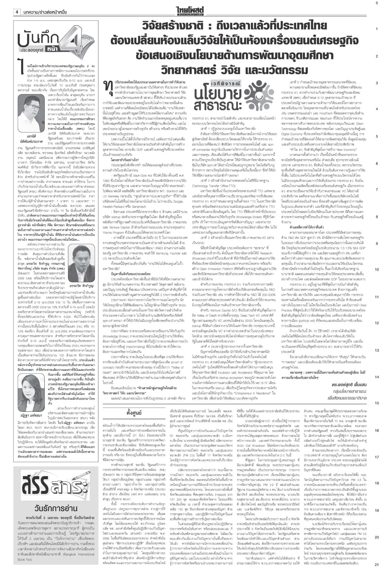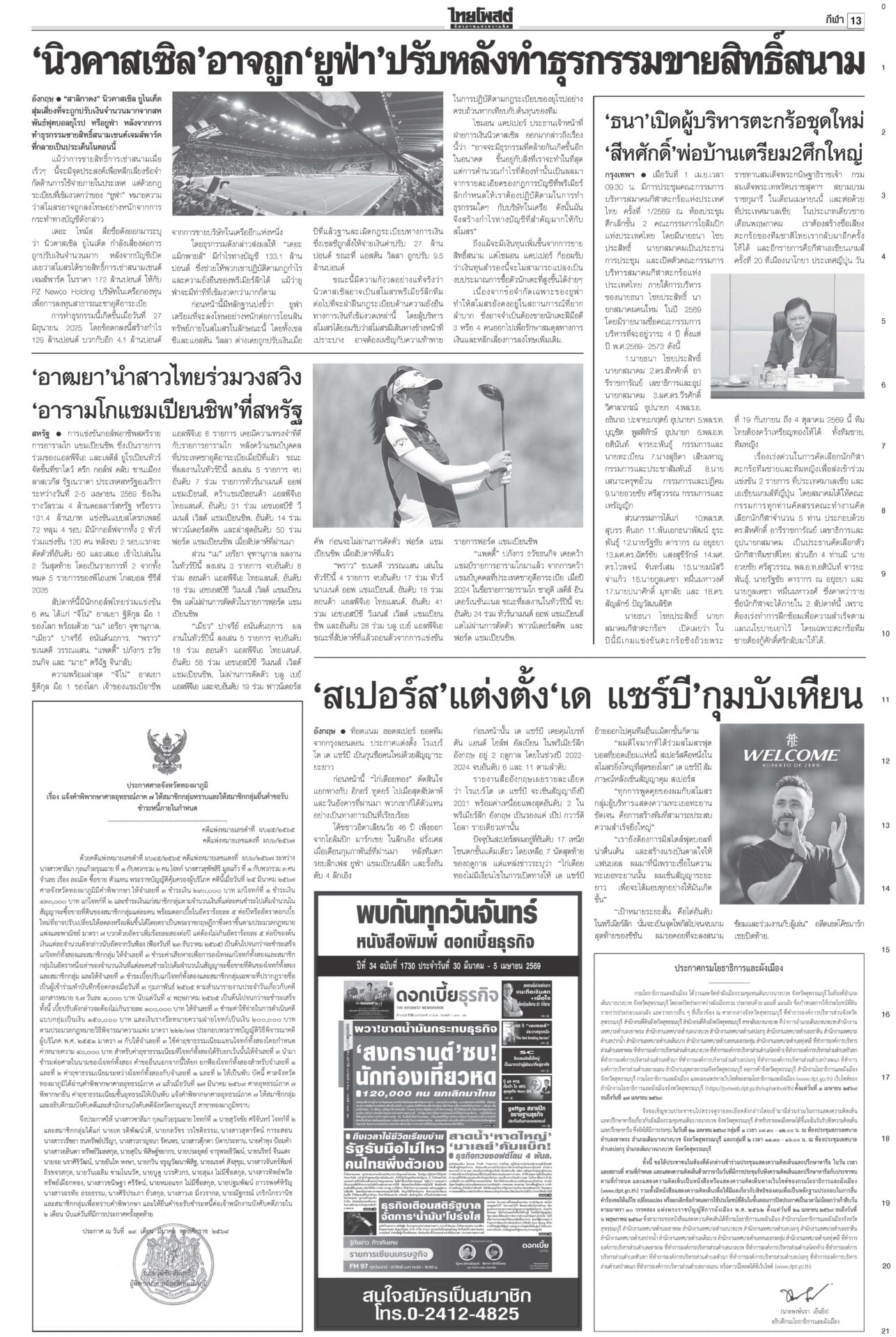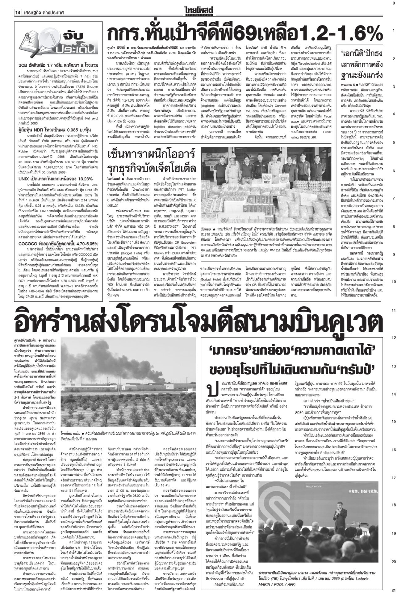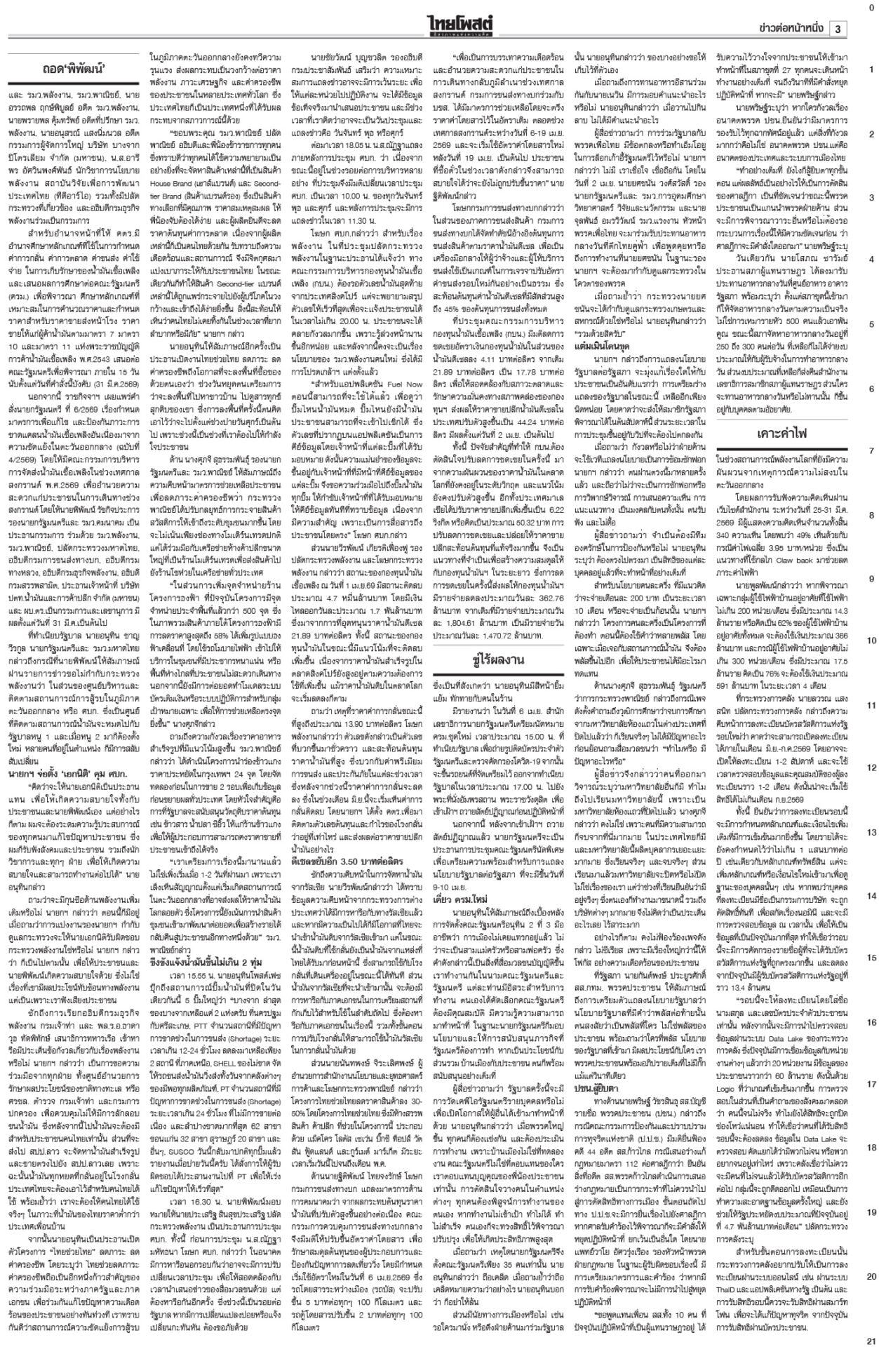 ฉบับวันที่ 2 เมษายน 2569 2 เมษายน 2569 เวลา 0:01 น. หนังสือพิมพ์ ฉบับวันที่ 2 เมษายน 2569ข่าวหน้าหนึ่งขู่ไร้ผลงานปรับออก ‘อนุทิน’บี้ครม.ใหม่ลุยทันที พรรคส้มสู้ยิบตาคดี44สส.“อนุทิน” ดินเนอร์ “เนวิน” ร้านประจำ หลังโปรดเกล้าฯ ครม.ใหม่ ถอด‘พิพัฒน์’ส่ง‘เอกนิติ’คุมแทนนายกฯ จ่อตั้ง “เอกนิติ” คุม “ศบก.-พลังงาน” แทน “พิพัฒน์” อ้างเปลี่ยนตัวตามเสียงเรียกร้อง ปชช. ไม่เกี่ยวมีผลประโยชน์ทับซ้อน เคาะค่าไฟ3.95บาท คัดเข้มขึ้นบัตรคนจนกกพ.เคาะค่าไฟงวดใหม่ พ.ค.-ส.ค.69 อยู่ที่ 3.95 บาท/หน่วย เพิ่มขึ้นน้อยสุด 7 สตางค์ ตั้งศูนย์ส่วนหน้าดับไฟเหนือ สภารุมสวดรบ.แก้ฝุ่นเหลวนายกฯ ให้อำนาจผู้ว่าฯ ประกาศภัยพิบัติหรือไม่ หลังค่าฝุ่น PM 2.5 พุ่งหนัก Tagsรายวันหนังสือพิมพ์ ข่าวที่เกี่ยวข้อง ฉบับวันที่ 1 เมษายน 2569 ฉบับวันที่ 31 มีนาคม 2569 ฉบับวันที่ 30 มีนาคม 2569 ฉบับวันที่ 29 มีนาคม 2569 ฉบับวันที่ 29 มีนาคม 2569 ฉบับวันที่ 28 มีนาคม 2569 ฉบับวันที่ 27 มีนาคม 2569 NEWS UPDATE 22:39 น. 'สลักรักในแสงจันทร์' คว้ารางวัลเวที HUB Awards 2025 22:27 น. 'PHUWIN' อบอุ่นเกินต้าน! ในซิงเกิลใหม่ 22:04 น. 'เกรท วรินทร' เสียน้ำตา หลัง 'ไข่ตุ๋น' กลับดาวแมว 20:49 น. พลังงาน แจงค่าการกลั่นพุ่ง 13 บาท เป็นภาวะชั่วคราว รอผลศึกษา คตร. ก่อนสรุปโครงสร้างราคาใหม่ 20:00 น. ประธานสภาฯ ชี้ 'วิโรจน์' เข้าใจผิด ปมค่าอาหาร สส. ไม่ได้เหมาจ่ายทั้ง 500 คน แต่จ่ายตามจริงเพียง 250-300 คน