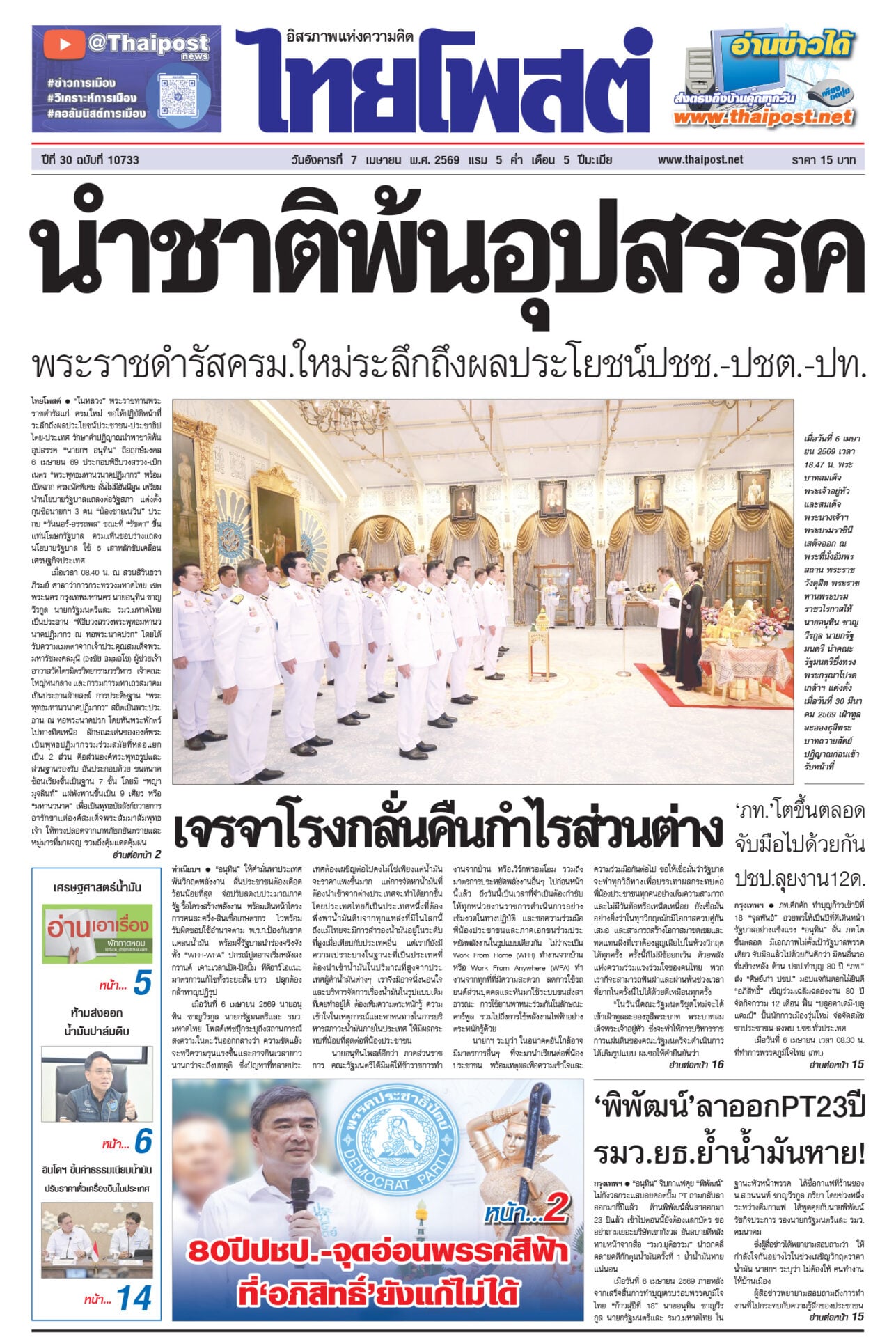 หนังสือพิมพ์ ฉบับวันที่ 7 เมษายน 2569ข่าวหน้าหนึ่งนำชาติพ้นอุปสรรค พระราชดำรัสครม.ใหม่ระลึกถึงผลประโยชน์ปชช.-ปชต.-ปท.“ในหลวง” พระราชทานพระราชดำรัสแก่ ครม.ใหม่ ขอให้ปฏิบัติหน้าที่ระลึกถึงผลประโยชน์ประชาชน-ประชาธิปไตย-ประเทศ เจรจาโรงกลั่นคืนกำไรส่วนต่าง“อนุทิน” ให้คำมั่นพาประเทศพ้นวิกฤตพลังงาน ลั่นประชาชนต้องเดือดร้อนน้อยที่สุด ‘พิพัฒน์’ลาออกPT23ปี รมว.ยธ.ย้ำน้ำมันหาย!“อนุทิน” จิบกาแฟคุย “พิพัฒน์” ไม่กังวลกระแสบอยคอตปั๊ม PT ถามกลับลาออกมากี่ปีแล้ว ‘ภท.’โตขึ้นตลอด จับมือไปด้วยกัน ปชป.ลุยงาน12ด.ภท.คึกคัก ทำบุญก้าวเข้าปีที่ 18 “จุลพันธ์” อวยพรให้เป็นปีที่ดีเดินหน้ารัฐบาลอย่างแข็งแรง