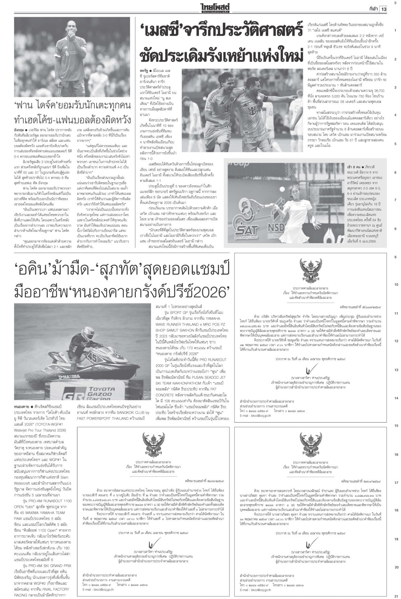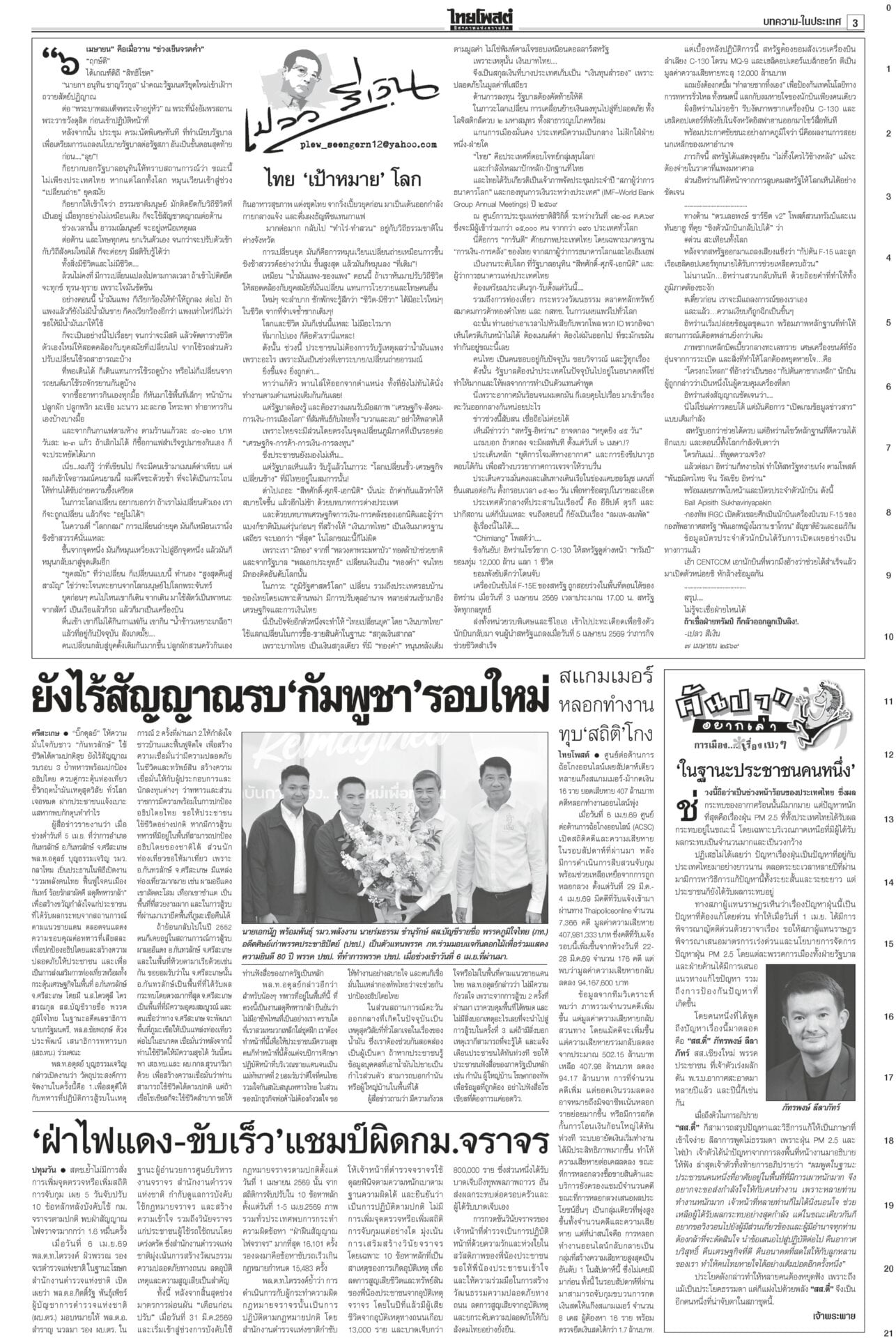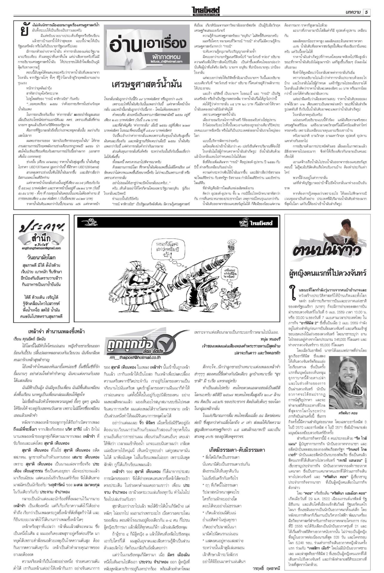 ฉบับวันที่ 7 เมษายน 2569 7 เมษายน 2569 เวลา 0:01 น. หนังสือพิมพ์ ฉบับวันที่ 7 เมษายน 2569ข่าวหน้าหนึ่งนำชาติพ้นอุปสรรค พระราชดำรัสครม.ใหม่ระลึกถึงผลประโยชน์ปชช.-ปชต.-ปท.“ในหลวง” พระราชทานพระราชดำรัสแก่ ครม.ใหม่ ขอให้ปฏิบัติหน้าที่ระลึกถึงผลประโยชน์ประชาชน-ประชาธิปไตย-ประเทศ เจรจาโรงกลั่นคืนกำไรส่วนต่าง“อนุทิน” ให้คำมั่นพาประเทศพ้นวิกฤตพลังงาน ลั่นประชาชนต้องเดือดร้อนน้อยที่สุด ‘พิพัฒน์’ลาออกPT23ปี รมว.ยธ.ย้ำน้ำมันหาย!“อนุทิน” จิบกาแฟคุย “พิพัฒน์” ไม่กังวลกระแสบอยคอตปั๊ม PT ถามกลับลาออกมากี่ปีแล้ว ‘ภท.’โตขึ้นตลอด จับมือไปด้วยกัน ปชป.ลุยงาน12ด.ภท.คึกคัก ทำบุญก้าวเข้าปีที่ 18 “จุลพันธ์” อวยพรให้เป็นปีที่ดีเดินหน้ารัฐบาลอย่างแข็งแรง Tagsรายวันหนังสือพิมพ์ ข่าวที่เกี่ยวข้อง ฉบับวันที่ 6 เมษายน 2569 ฉบับวันที่ 5 เมษายน 2569 ฉบับวันที่ 5 เมษายน 2569 ฉบับวันที่ 4 เมษายน 2569 ฉบับวันที่ 3 เมษายน 2569 ฉบับวันที่ 2 เมษายน 2569 ฉบับวันที่ 1 เมษายน 2569 NEWS UPDATE 0:42 น. 'ปีเตอร์แพน-เอ็มม่า' เคมีฟุ้งกระจาย 'มเหสีน้อย' ม้ามืดโซเชียลพุ่งร้อยล้านวิว! 0:26 น. 'อ่ำ อัมรินทร์' เดินทางไปเขากลิ้ง เข้าเยี่ยมเพื่อนรัก 'เสก โลโซ' 0:01 น. 80ปีปชป.-จุดอ่อนพรรคสีฟ้า ที่"อภิสิทธิ์"ยังแก้ไม่ได้ 21:24 น. คืบหน้าสงครามตะวันออกกลาง : โจมตีโรงงานปิโตรเคมีอิหร่าน-ทรัมป์ปฏิเสธหยุดยิง 20:56 น. เจ้าฟ้าสิริวัณณวรีฯ จะเสด็จเป็นองค์ปาฐกวิวัฒนาการชุดไทยพระราชนิยมโรดโชว์กรุงเฮก