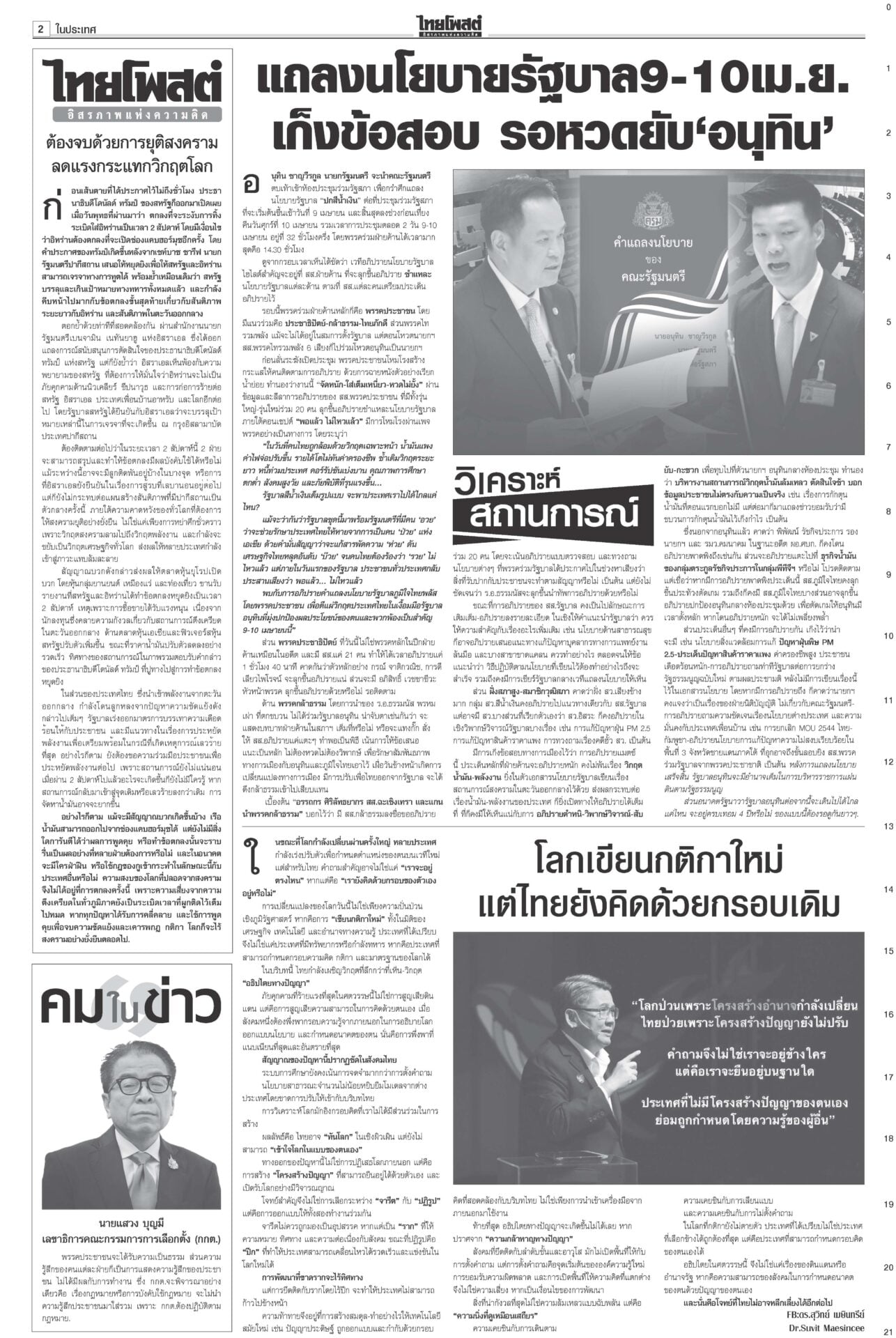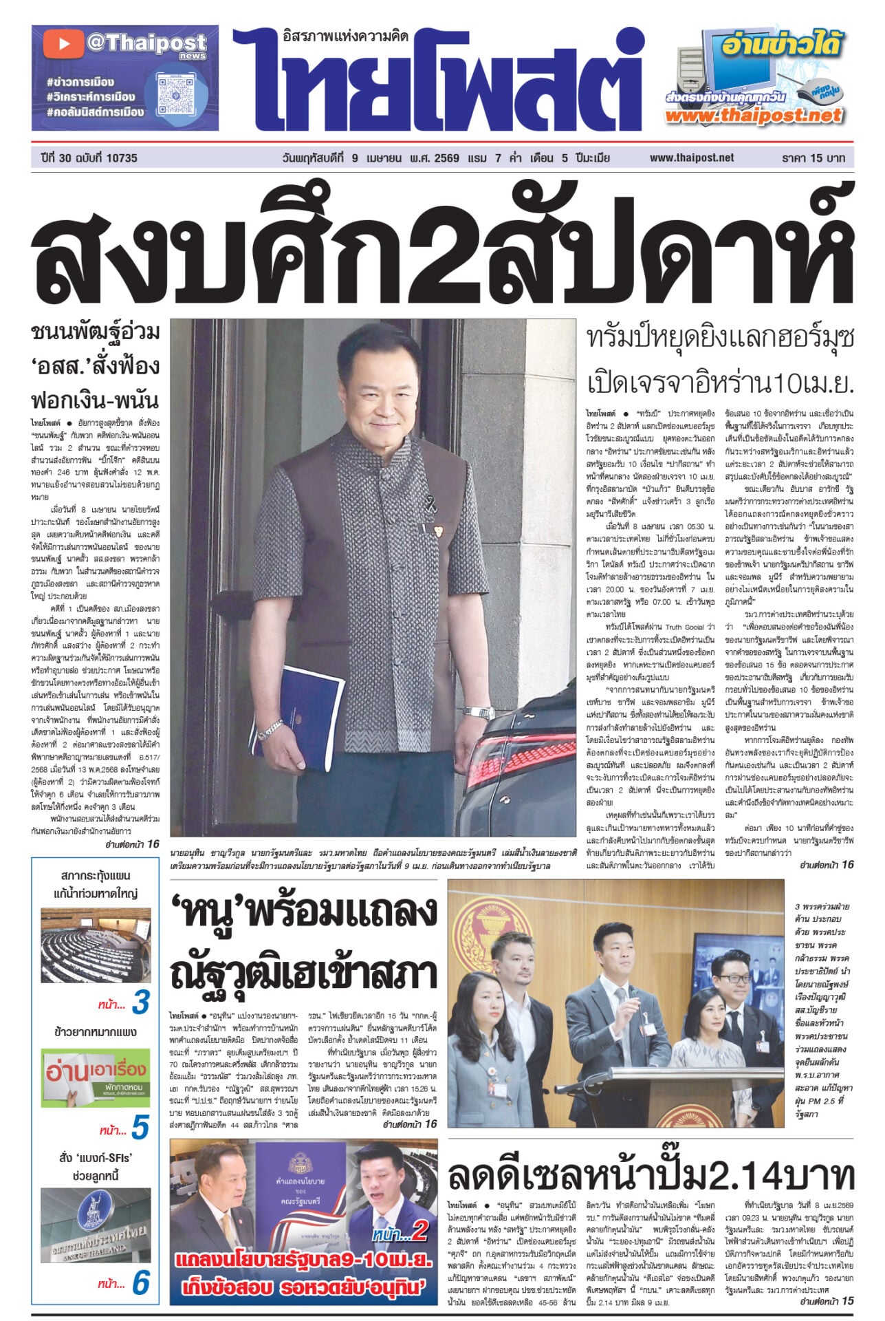 หนังสือพิมพ์ ฉบับวันที่ 9 เมษายน 2569ข่าวหน้าหนึ่งสงบศึก2สัปดาห์ ทรัมป์หยุดยิงแลกฮอร์มุซ เปิดเจรจาอิหร่าน10เม.ย.“ทรัมป์” ประกาศหยุดยิงอิหร่าน 2 สัปดาห์ แลกเปิดช่องแคบฮอร์มุซ ‘หนู’พร้อมแถลง ณัฐวุฒิเฮเข้าสภา“อนุทิน” แบ่งงานรองนายกฯ-รมต.ประจำสำนักฯ พร้อมทำการบ้านหนัก ลดดีเซลหน้าปั๊ม2.14บาท“อนุทิน” สวมบทเตมีย์ใบ้ไม่ตอบทุกคำถามสื่อ แค่พยักหน้ารับมีข่าวดีด้านพลังงาน ชนนพัฒฐ์อ่วม ‘อสส.’สั่งฟ้อง ฟอกเงิน-พนันอัยการสูงสุดชี้ขาด สั่งฟ้อง “ชนนพัฒฐ์” กับพวก คดีฟอกเงิน-พนันออนไลน์ รวม 2 สำนวน