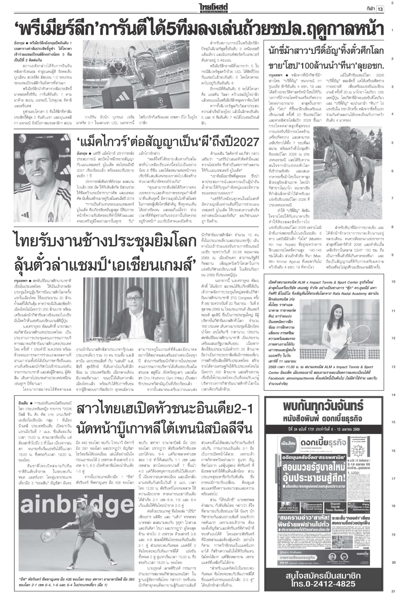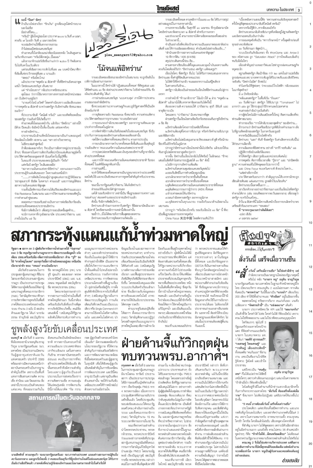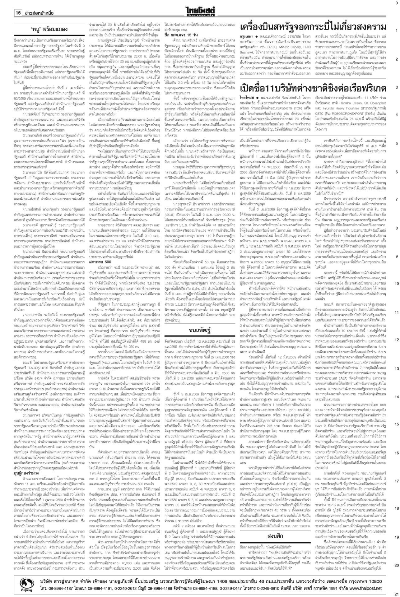 ฉบับวันที่ 9 เมษายน 2569 9 เมษายน 2569 เวลา 0:01 น. หนังสือพิมพ์ ฉบับวันที่ 9 เมษายน 2569ข่าวหน้าหนึ่งสงบศึก2สัปดาห์ ทรัมป์หยุดยิงแลกฮอร์มุซ เปิดเจรจาอิหร่าน10เม.ย.“ทรัมป์” ประกาศหยุดยิงอิหร่าน 2 สัปดาห์ แลกเปิดช่องแคบฮอร์มุซ ‘หนู’พร้อมแถลง ณัฐวุฒิเฮเข้าสภา“อนุทิน” แบ่งงานรองนายกฯ-รมต.ประจำสำนักฯ พร้อมทำการบ้านหนัก ลดดีเซลหน้าปั๊ม2.14บาท“อนุทิน” สวมบทเตมีย์ใบ้ไม่ตอบทุกคำถามสื่อ แค่พยักหน้ารับมีข่าวดีด้านพลังงาน ชนนพัฒฐ์อ่วม ‘อสส.’สั่งฟ้อง ฟอกเงิน-พนันอัยการสูงสุดชี้ขาด สั่งฟ้อง “ชนนพัฒฐ์” กับพวก คดีฟอกเงิน-พนันออนไลน์ รวม 2 สำนวน Tagsรายวันหนังสือพิมพ์ ข่าวที่เกี่ยวข้อง ฉบับวันที่ 8 เมษายน 2569 ฉบับวันที่ 7 เมษายน 2569 ฉบับวันที่ 6 เมษายน 2569 ฉบับวันที่ 5 เมษายน 2569 ฉบับวันที่ 5 เมษายน 2569 ฉบับวันที่ 4 เมษายน 2569 ฉบับวันที่ 3 เมษายน 2569 NEWS UPDATE 0:01 น. แถลงนโยบายรัฐบาล9-10เม.ย. เก็งข้อสอบ รอหวดยับ"อนุทิน" 21:03 น. หน่วยงานต่างๆ ร่วมบำเพ็ญกุศลอุทิศถวายพระบรมศพ'พระพันปีหลวง' 21:01 น. สภาฯ ครบ 500 คนแล้ว กกต. ประกาศรับรองผลเลือกตั้ง เขต 2 สุพรรณบุรี 20:44 น. 'อนุทิน' ลงนามคำสั่งแบ่งงาน 3 รมช.มหาดไทย 19:43 น. อิหร่านยังโจมตีรัฐในอ่าวเปอร์เซีย แม้ตกลงหยุดยิงอย่างเปราะบางกับสหรัฐฯ