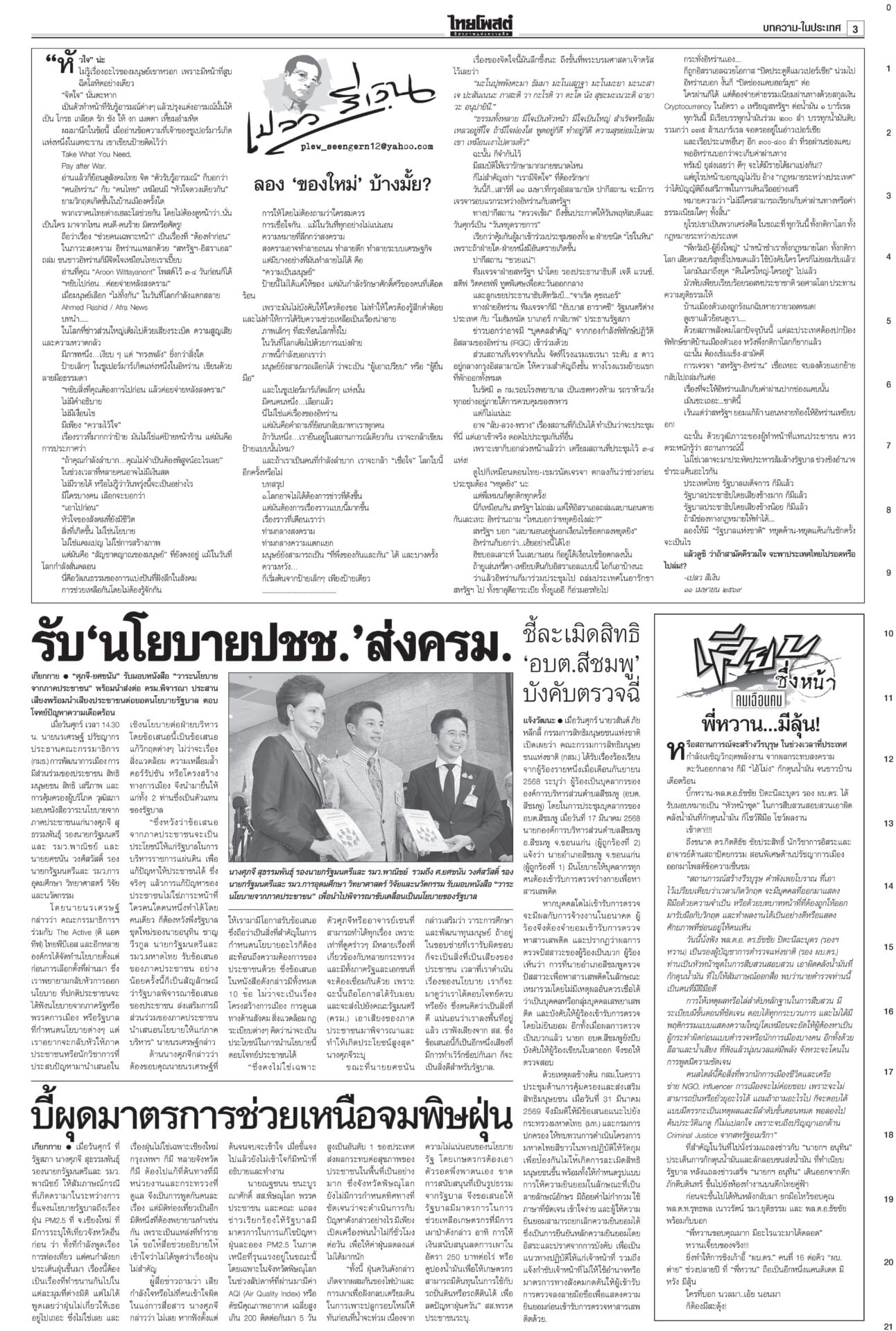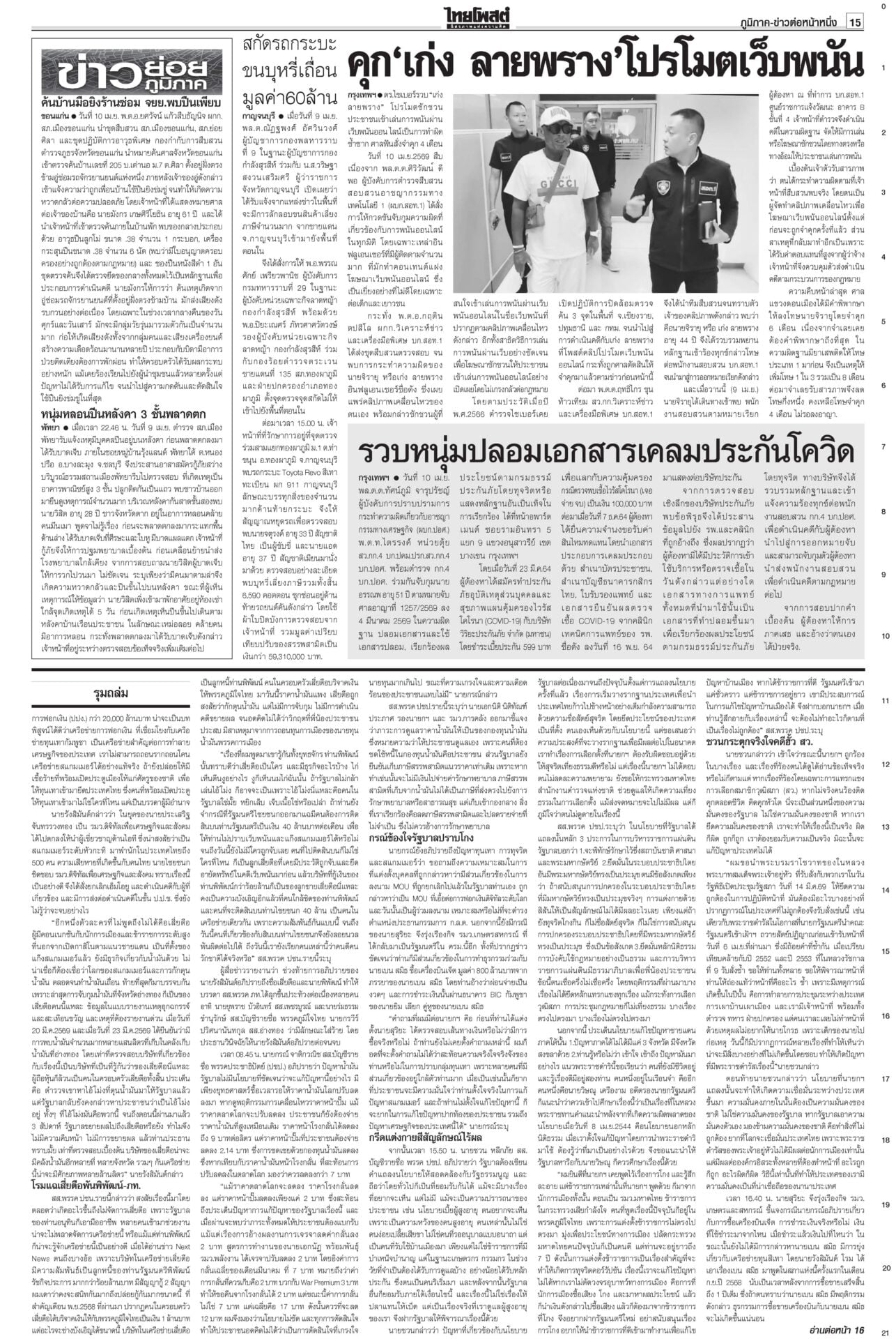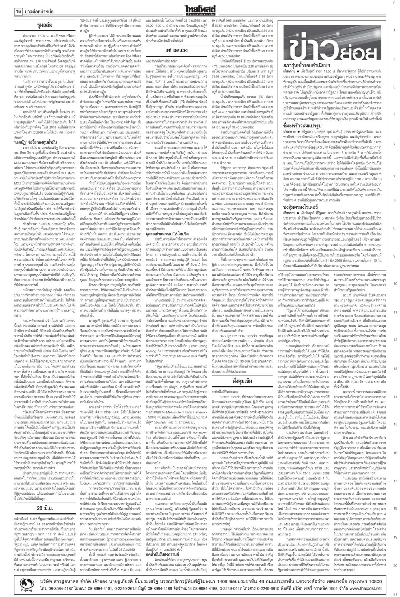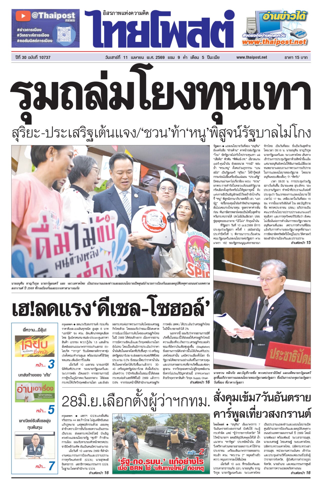 หนังสือพิมพ์ ฉบับวันที่ 11 เมษายน 2569ข่าวหน้าหนึ่งรุมถล่มโยงทุนเทา สุริยะ-ประเสริฐเต้นแจง/‘ชวน’ท้า‘หนู’พิสูจน์รัฐบาลไม่โกงแถลงนโยบายวันที่สอง “อนุทิน” ยังงดจ้อสื่อ “ฝ่ายค้าน” ดาหน้าถล่มรัฐบาล “โรม” ซัดรัฐบาลไม่จริงใจปราบทุนเทา เฮ!ลดแรง‘ดีเซล-โซฮอล์’ลดแรงรับสงกรานต์! กบน.หั่นราคาดีเซล-เบนซินทุกชนิด สูงสุด 6 บาท “เอกนิติ” ชง ครม. อัดแพ็กเกจหยุดเลือดไหล อุ้มบัตรคนจน-ขนส่ง-ประมง-ดูแลราคาสินค้า 28มิ.ย.เลือกตั้งผู้ว่าฯกทม.เลขาฯ ป.ป.ช.แจงยื่นฟันจริยธรรม 44 สส.ก้าวไกล ไม่ดูแค่สิทธิเสนอแก้กฎหมาย สั่งคุมเข้ม7วันอันตราย คาร์พูลเที่ยวสงกรานต์“อนุทิน” เข้มมาตรการ 7 วันอันตรายช่วงสงกรานต์ บังคับใช้ กม.ผู้กระทำผิด