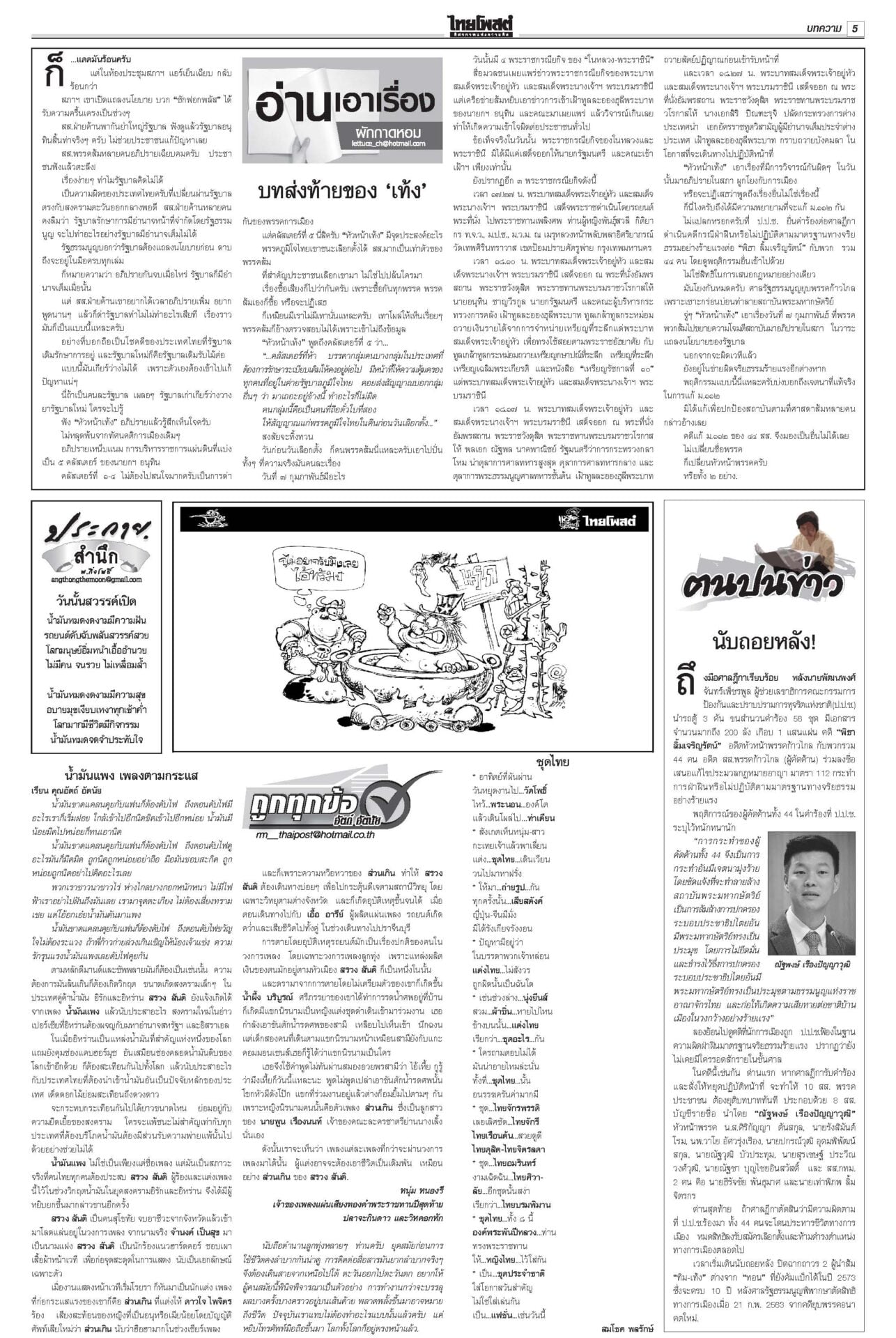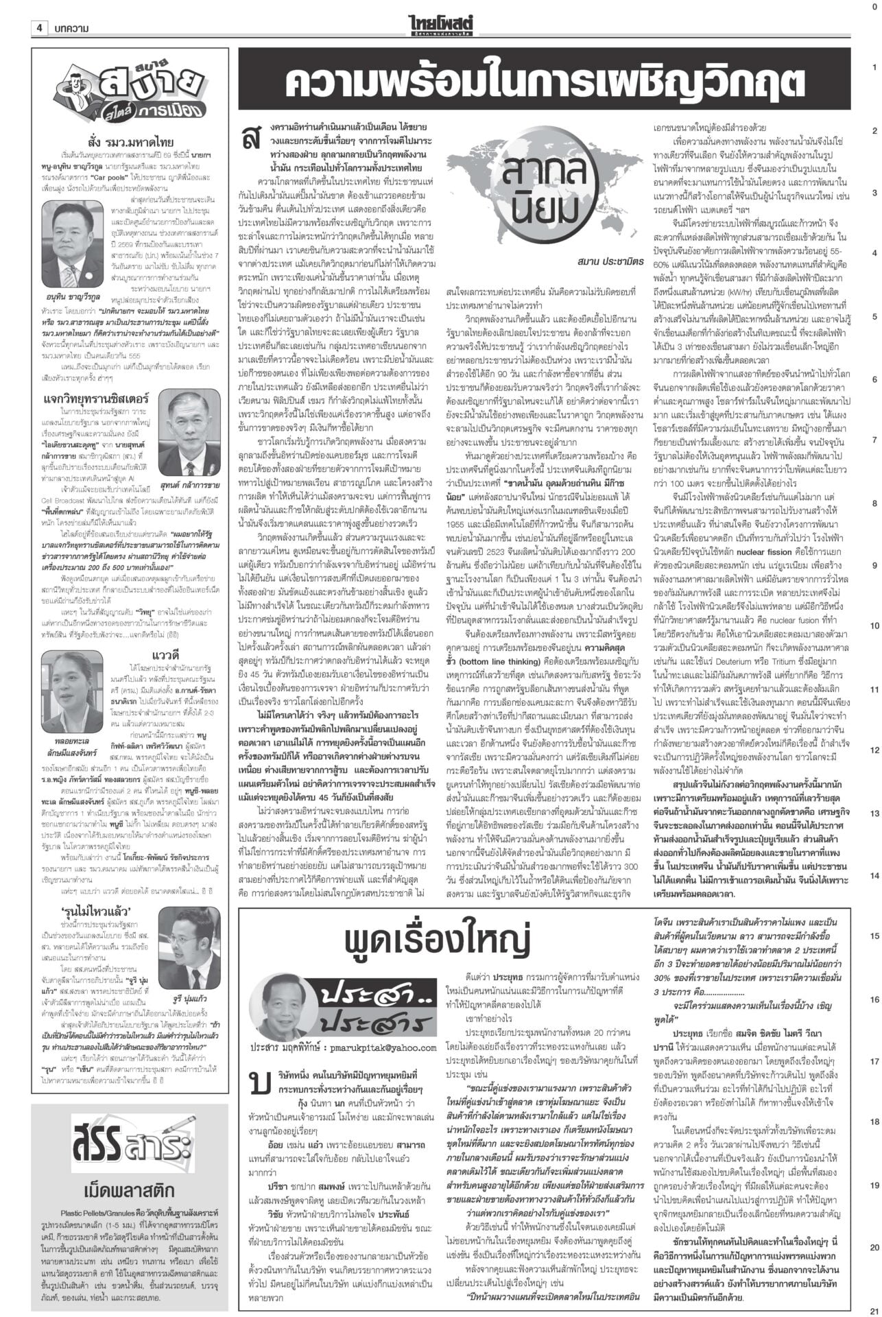 ฉบับวันที่ 11 เมษายน 2569 11 เมษายน 2569 เวลา 0:01 น. หนังสือพิมพ์ ฉบับวันที่ 11 เมษายน 2569ข่าวหน้าหนึ่งรุมถล่มโยงทุนเทา สุริยะ-ประเสริฐเต้นแจง/‘ชวน’ท้า‘หนู’พิสูจน์รัฐบาลไม่โกงแถลงนโยบายวันที่สอง “อนุทิน” ยังงดจ้อสื่อ “ฝ่ายค้าน” ดาหน้าถล่มรัฐบาล “โรม” ซัดรัฐบาลไม่จริงใจปราบทุนเทา เฮ!ลดแรง‘ดีเซล-โซฮอล์’ลดแรงรับสงกรานต์! กบน.หั่นราคาดีเซล-เบนซินทุกชนิด สูงสุด 6 บาท “เอกนิติ” ชง ครม. อัดแพ็กเกจหยุดเลือดไหล อุ้มบัตรคนจน-ขนส่ง-ประมง-ดูแลราคาสินค้า 28มิ.ย.เลือกตั้งผู้ว่าฯกทม.เลขาฯ ป.ป.ช.แจงยื่นฟันจริยธรรม 44 สส.ก้าวไกล ไม่ดูแค่สิทธิเสนอแก้กฎหมาย สั่งคุมเข้ม7วันอันตราย คาร์พูลเที่ยวสงกรานต์“อนุทิน” เข้มมาตรการ 7 วันอันตรายช่วงสงกรานต์ บังคับใช้ กม.ผู้กระทำผิด Tagsรายวันหนังสือพิมพ์ ข่าวที่เกี่ยวข้อง ฉบับวันที่ 10 เมษายน 2569 ฉบับวันที่ 9 เมษายน 2569 ฉบับวันที่ 8 เมษายน 2569 ฉบับวันที่ 7 เมษายน 2569 ฉบับวันที่ 6 เมษายน 2569 ฉบับวันที่ 5 เมษายน 2569 ฉบับวันที่ 5 เมษายน 2569 NEWS UPDATE 23:25 น. 'ฟุตซอลไทย' เฉือน 'ออสเตรเลีย' หวุดหวิด 4-3 ลิ่วชิงโต๊ะเล็กอาเซียน ดวล 'อินโดฯ' 23:24 น. 'มาดามแป้ง' ขอบคุณ 'เนวิน' ปล่อยตัวช้างศึก U17 สู้ศึกชิงแชมป์เอเชีย 20:57 น. 'เอกนัฏ' ยืนยันไม่เคยเกรงใจนายทุน จี้โรงกลั่นน้ำมันแบ่งเบาภาระประชาชน ไม่หากำไรเกินควร 20:36 น. ลดแรงรับสงกรานต์! กบน. หั่นราคาดีเซล-เบนซินทุกชนิด สูงสุด 6 บาท สะท้อนราคาน้ำมันโลกตามจริง 19:59 น. 'สีหศักดิ์' ชี้สถานการณ์ชายแดนเปราะบาง ถึงจุดที่กัมพูชาต้องเลือกสันติภาพหรือความขัดแย้ง-สูญเสีย