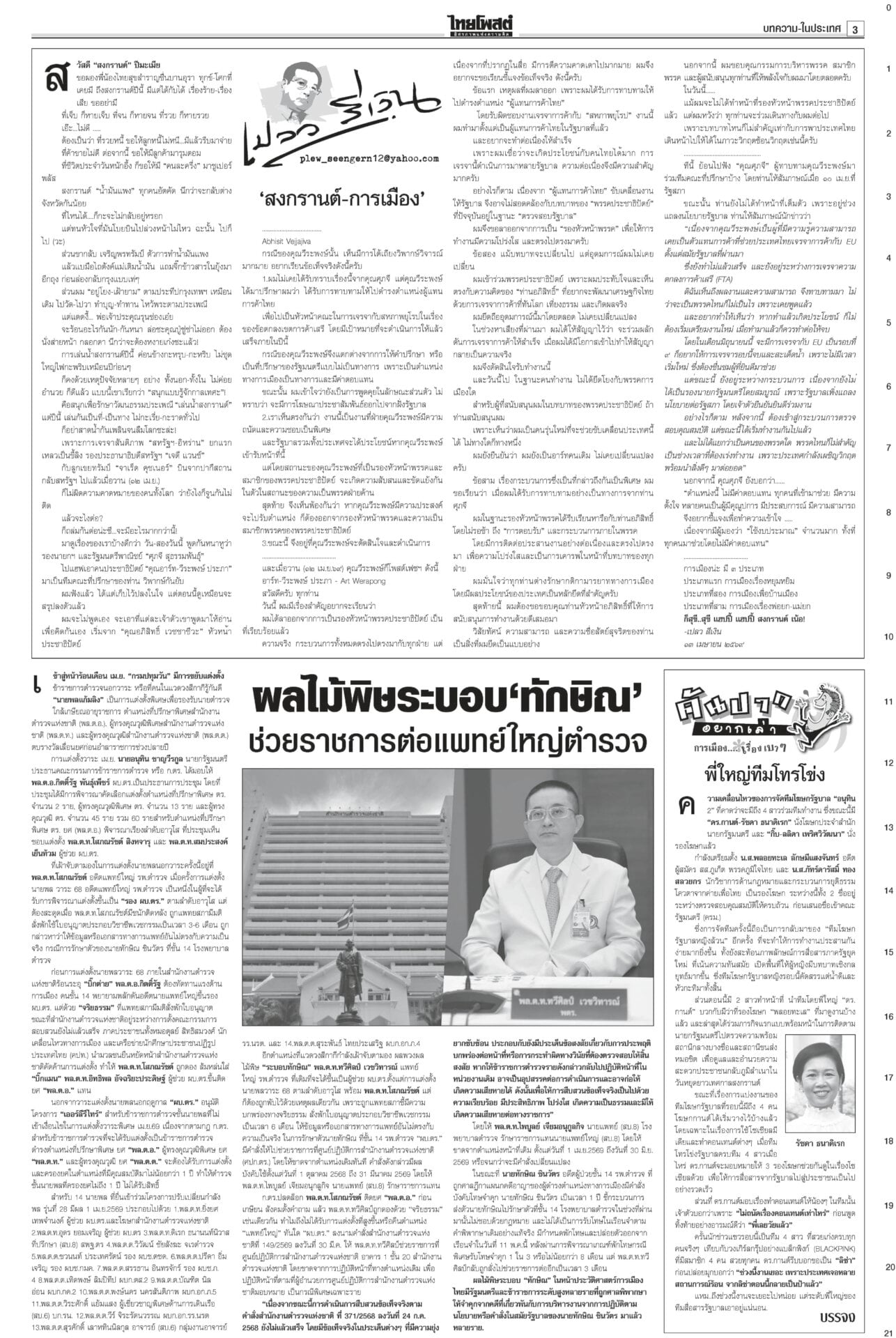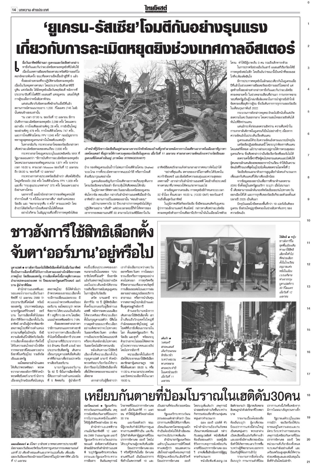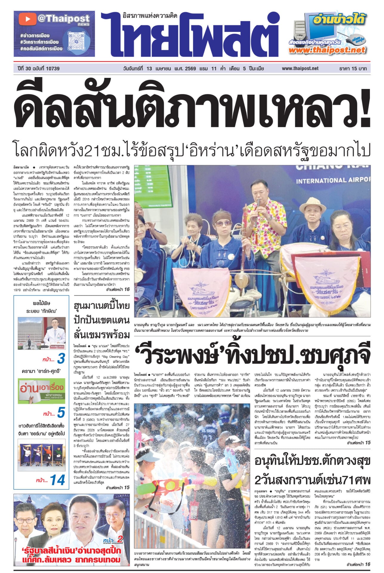 หนังสือพิมพ์ ฉบับวันที่ 13 เมษายน 2569ข่าวหน้าหนึ่งดีลสันติภาพเหลว! โลกผิดหวัง21ชม.ไร้ข้อสรุป‘อิหร่าน’เดือดสหรัฐขอมากไปเจรจายุติสงครามตะวันออกกลางระหว่างสหรัฐกับอิหร่านล้มเหลว อนุทินให้ปชช.ตักตวงสุข 2วันสงกรานต์เซ่น71ศพ“อนุทิน” อวยพรสงกรานต์ ขอ ปชช.ตักตวงความสุข ใช้วันหยุดกับครอบครัว ฮุนมาเนตบี้ไทย ปักปันเขตแดน ลั่นเขมรพร้อม“ฮุน มาเนต” โพสต์จี้ไทยเร่งปักปันเขตแดน 2 ประเทศให้เร็วที่สุด ‘วีระพงษ์’ทิ้งปชป.ซบศุภจี“นายกฯ” ลงพื้นที่แบบออร์แกนิกช่วงสงกรานต์ เยือนเชียงรายถึงสนามบินร่วมแจมเป่าขลุ่ยกับกลุ่มผู้สูงอายุพื้นเมือง