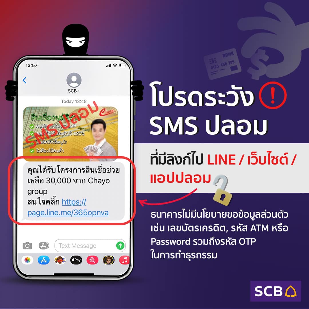 8 มิ.ย. 2565 – ผู้สื่อข่าวรายงานว่า ธนาคารไทยพาณิชย์ (SCB) แจ้งเตือนลูกค้าว่า มิจฉาชีพเปลี่ยนมุกใหม่เรื่อยๆ เราต้องตามให้ทัน จะได้ไม่ตกเป็นเหยื่อ โดยช่วงนี้มีการส่ง SMS ปลอม และใช้ชื่อผู้ส่งเป็น SCB หรือ 027777777 พร้อมข้อความหลอกล่อว่าจะมอบเงินให้เพื่อความช่วยเหลือต่างๆ และมีลิงก์แนบท้าย ที่ท้ายสุดจะหลอกเอาข้อมูลเราไป และดูดเงินออกไปหมดบัญชี
