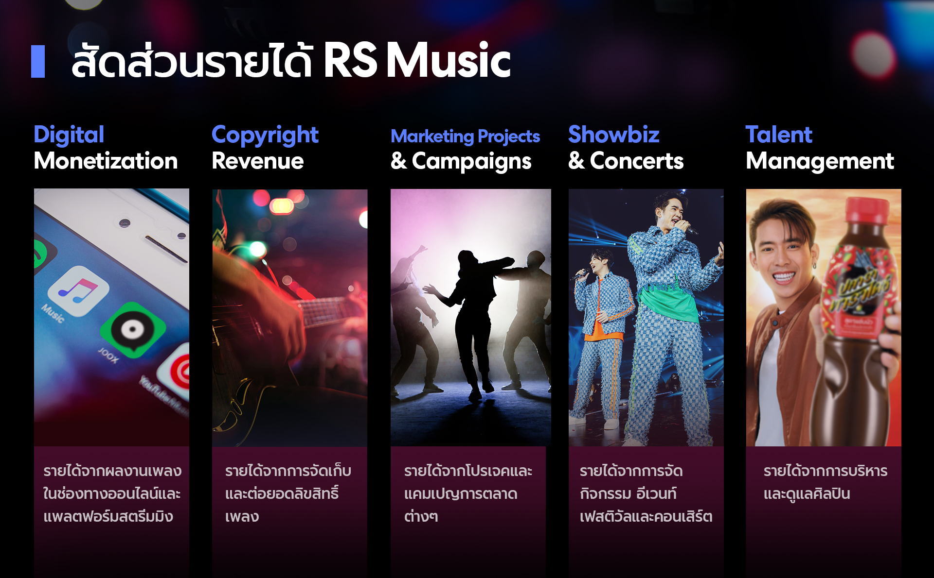 1. Digital Monetization เป็นรายได้จากผลงานเพลงทั้งจากศิลปินรุ่นใหม่และศิลปินระดับตำนานของอาร์เอส จากช่องทางออนไลน์ต่างๆ ไม่ว่าจะเป็นโซเชียลมีเดียอย่าง YouTube, Facebook, Instagram, TikTok หรือแพลตฟอร์มสตรีมมิง ได้แก่ Spotify, Apple Music, JOOX และอื่นๆ
