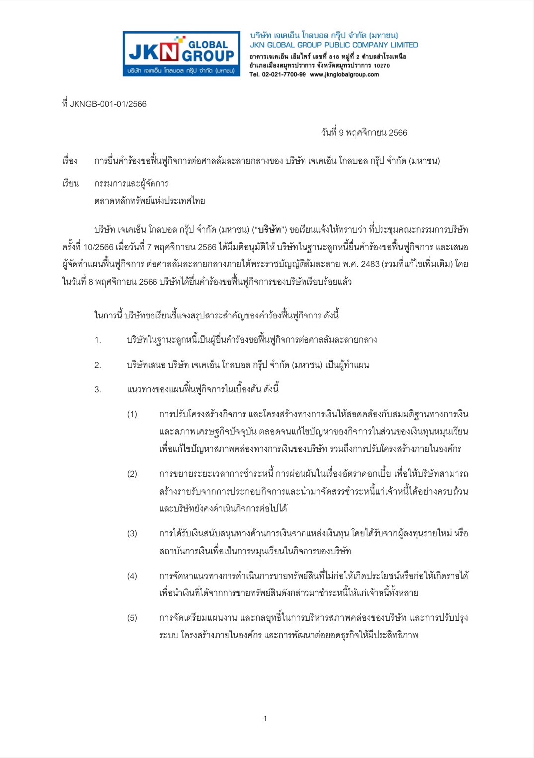 9 พ.ย. 2566 – บริษัท เจเคเอ็น โกลบอล มีเดีย จำกัด (มหาชน) (JKN) รายงานตลาดหลักทรัพย์แห่งประเทศไทยว่า ที่ประชุมคณะกรรมการบริษัท ครั้งที่ 10/2566 เมื่อวันที่ 7 พ.ย.2566 มีมติอนุมัติให้ บริษัทในฐานะลูกหนี้ยื่นคำร้องขอฟื้นฟูกิจการ และเสนอผู้จัดทำแผนฟื้นฟูกิจการ ต่อศาลล้มละลายกลางภายใต้พระราชบัญญัติล้มละลาย พ.ศ. 2483 (รวมที่แก้ไขเพิ่มเติม) โดยในวันที่ 8 พ.ย.2566 บริษัทยื่นคำร้องขอฟื้นฟูกิจการของบริษัทเรียบร้อยแล้วในการนี้ บริษัทขอเรียนชี้แจงสรุปสาระสำคัญของคำร้องฟื้นฟูกิจการ ดังนี้