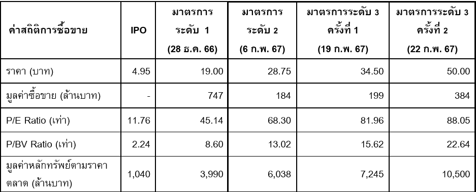 o การซื้อขายปรับตัวเพิ่มขึ้นอย่างมากในเวลาอันสั้น เกินปัจจัยพื้นฐานของบริษัท แม้จะอยู่ในมาตรการกำกับการซื้อขาย