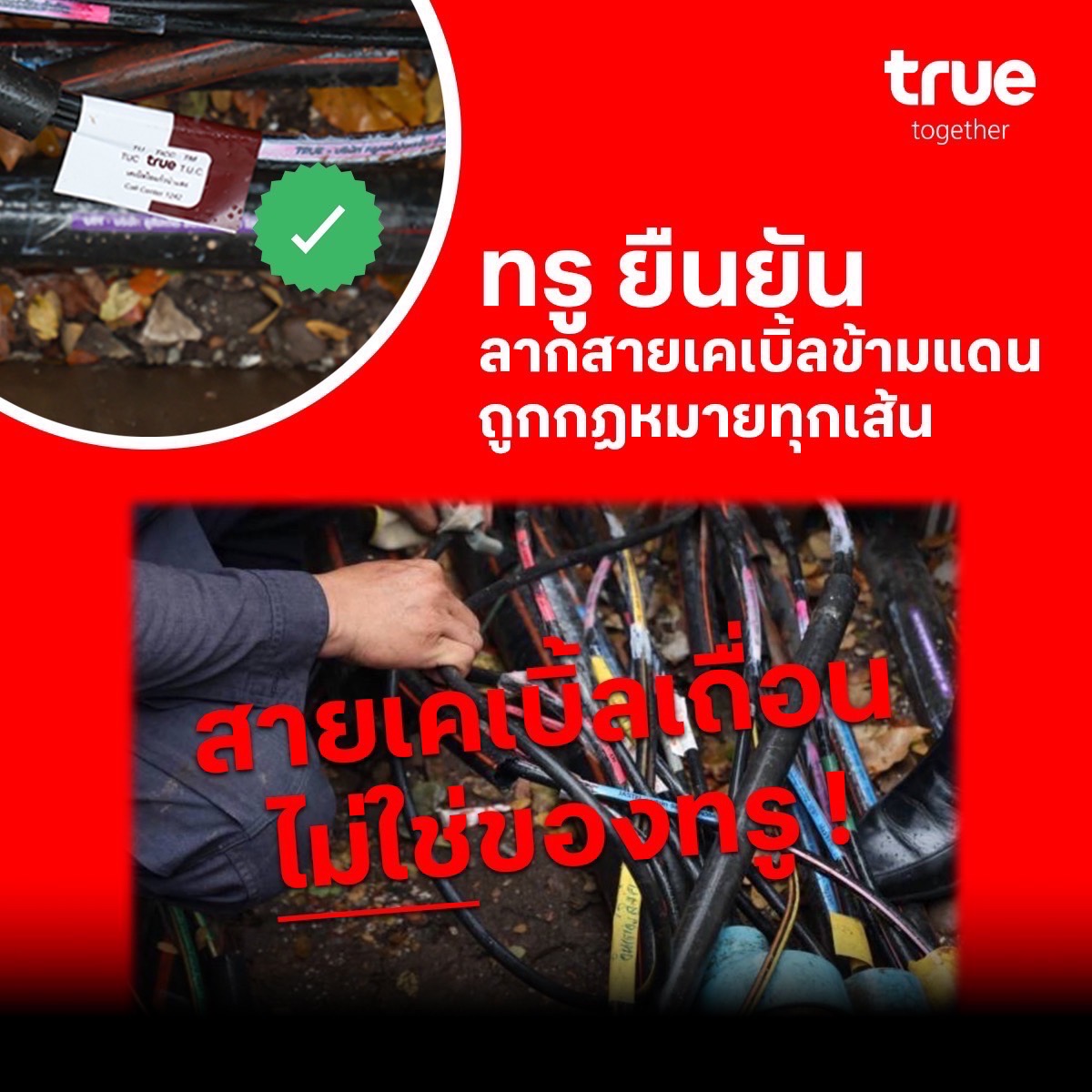 ทรู คอร์ปอเรชั่น ขอเรียนชี้แจงเพื่อความเข้าใจว่า ภาพท่อที่เห็นเป็นท่อส่วนกลางที่รวมสายเคเบิลใยแก้วเกตเวย์ของทุกโอเปอเรเตอร์ในไทย ซึ่งมีสายเคเบิ้ลของทรูเป็นหนึ่งในนั้น และมีการติดชื่อชัดเจนเนื่องจากเป็นสายข้ามแดนที่ได้รับอนุญาตจากกสทช.อย่างถูกต้อง และขอยืนยันว่าสายเคเบิ้ลใยแก้วข้ามแดนของทรูทุกสาย ทุกจุด ทุกพื้นที่ ได้ดำเนินการขออนุญาตถูกต้องตามกฎหมาย รวมทั้งให้บริการเชื่อมต่อกับโอเปอเรเตอร์บริษัทผู้ประกอบกิจการโทรคมนาคมหลักของประเทศเพื่อนบ้านที่ได้รับอนุญาตเท่านั้น ไม่มีการให้บริการลากสายไปยังบุคคลหรือนิติบุคคลอื่นใดที่ไม่ได้รับใบอนุญาตประกอบกิจการโทรคมนาคม นอกจากนี้ บริษัท ฯ ได้มีการรายงานแจ้งไปยังกสทช. เพื่อยืนยันพร้อมหลักฐานว่าทุกสายสื่อสารของทรูดำเนินการถูกต้อง และไม่มีการลอบส่งเป็นสายสื่อสารเถื่อนไปยังประเทศเพื่อนบ้านแต่อย่างใด