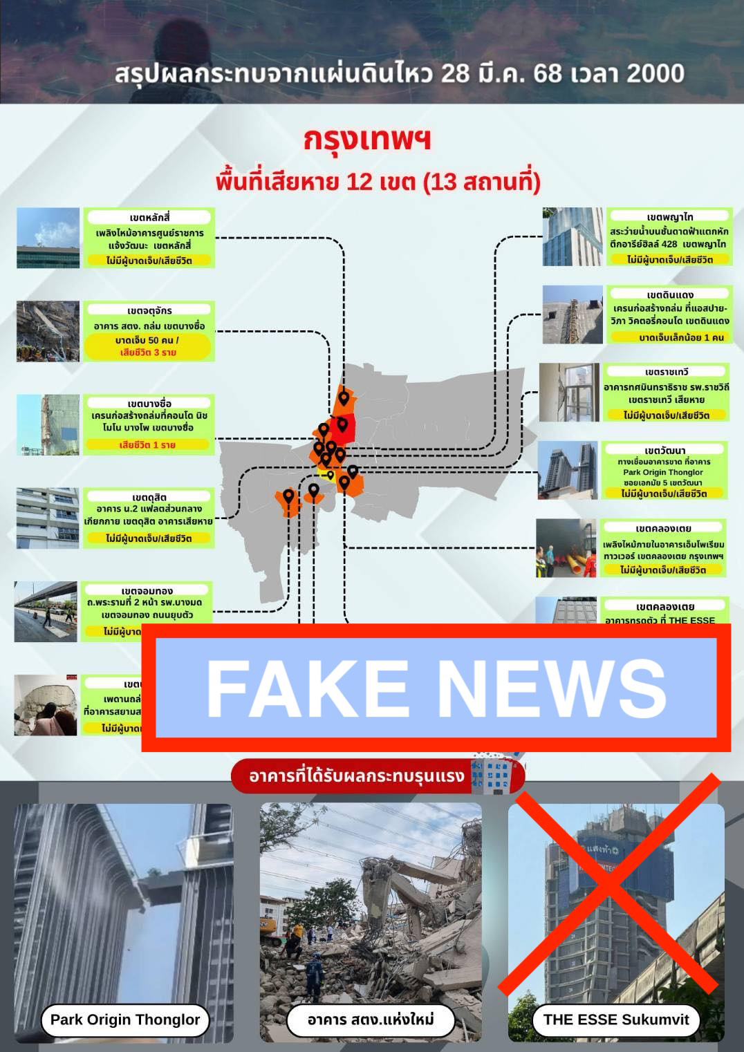 ผู้สื่อข่าวรายงานว่า บริษัท สิงห์ เอสเตท จำกัด (มหาชน) ได้ออกแถลงการณ์ระบุว่า จากภาพ Infographic คอนโดมีเนียมที่ได้รับผลกระทบจากแผ่นดินไหว ที่เผยแพร่ทางโซเชียลมีเดียและช่องทางอื่นๆ นั้น บริษัท สิงห์ เอสเตท จำกัด (มหาชน) ขอชี้แจงว่า ภาพและเนื้อหาดังกล่าวที่เกี่ยวข้องกับโครงการ THE ESSE Sukumvit ไม่เป็นความจริง โดยข้อเท็จจริงได้แก่ โครงการ THE ESSE Sukhumvit 36 นั้น เริ่มก่อสร้างเมื่อมกราคม 2561 สร้างเสร็จพร้อมอยู่ เมื่อตุลาคม 2563 และได้รับการยืนยัน จากวิศวกรโครงการหลังจากการตรวจสอบโดยละเอียด ไม่พบปัญหาอาคารทรุดหรือเสียหายอย่างแน่นอน ทั้งนี้หลังจากเหตุการณ์แผ่นดินไหวที่เกิดขึ้น