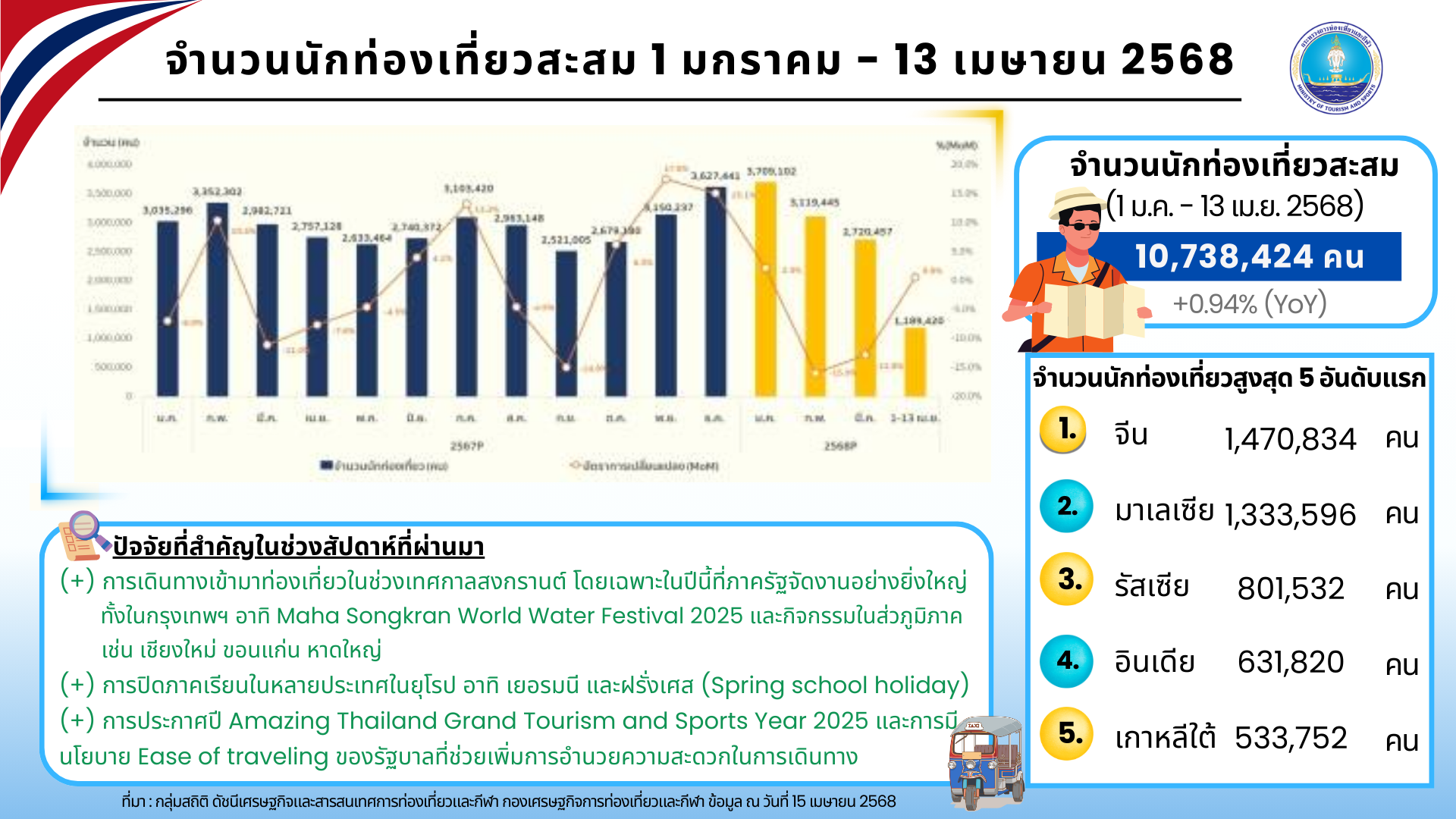 สรุปภาพรวมการท่องเที่ยวในสัปดาห์นี้ โดยข้อมูล ณ วันที่ 14 เม.ย. 68 พบว่า ประเทศไทยมีจำนวนนักท่องเที่ยวชาวต่างชาติสะสมตั้งแต่วันที่ 1 ม.ค. – 13 เม.ย. 68 ที่ผ่านมาทั้งสิ้น 10,738,424 คน สร้างรายได้จากการใช้จ่ายของนักท่องเที่ยวต่างชาติแล้วประมาณ 516,589 ล้านบาท โดยจำนวนนักท่องเที่ยวสูงสุด 5 อันดับแรก ได้แก่ จีน (1,470,834 คน) มาเลเซีย (1,333,596 คน) รัสเซีย (801,532 คน) อินเดีย (631,820 คน) และเกาหลีใต้ (533,752 คน)